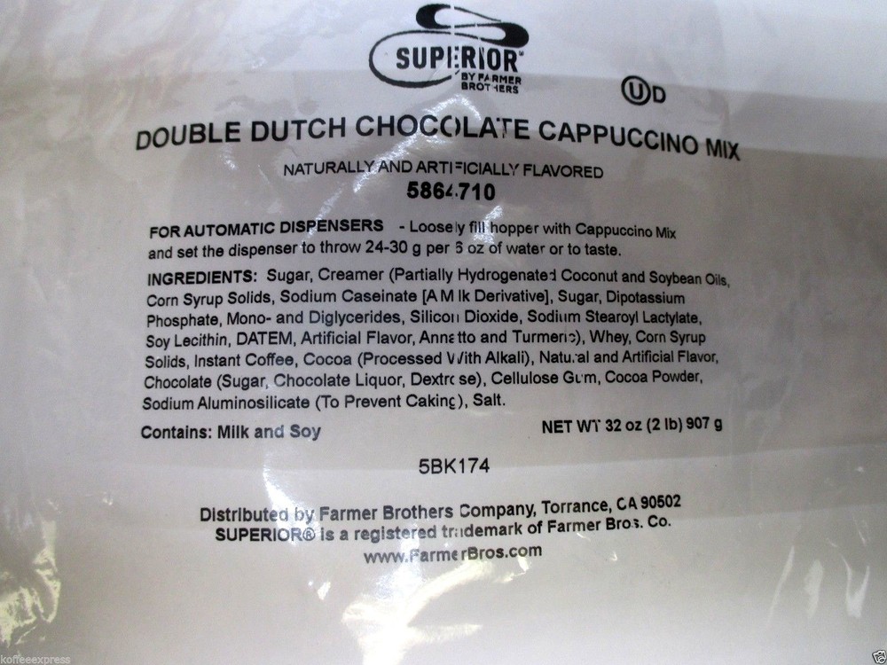 THIS SALE IS FOR 1 BAG OF DOUBLE DUTCH CHOCOLATE CAPPUCCINO MIX # 64710-1 2-LB BAG VISIT OUR EBAY STORE FOR MORE GREAT PRODUCTS LIKE THIS THIS IS THE SAME PRODUCT THAT IS SOLD BUY THE CUP IN MOST CONVENIENT MARTS AND C STORE CHAINS. IT IS SIMPLY THE BEST POST MIX PRODUCT ON THE MARKET Superb taste, lots of froth, marvelous flavor, wonderful aroma Simply mix with hot water for a delicious cappuccino or cold for a cool down cappuccino also may be used in a blender or frozen machine for a rich creamy frozen cappuccino drink Thank you for visiting our page!! Terms of Sale: We accept PayPal. Payment must be received within 3 business days of auction close. We will send you an invoice for your purchase. Please contact seller within 48 hours of auction close to confirm receipt of your invoice and to discuss any matters relating to your order. We will not be held liable for any incident, accident, or consequential damages related to the use or misuse or this item under any circumstances. The appropriate feedback will be posted for all successful bidders. We value your honest opinion and making sure you are satisfied with your purchase. Should you feel the need to provide negative feedback please contact us first to give us the opportunity to try to resolve any issues you may have. Please ask any questions you may have with regards to your purchase well in advance of the auction close. We will be happy to respond in a timely manner to assist you in any way we possibly can. We also will be happy to send you additional digital photos of the merchandise for you to inspect. Feel free to contact us should you have any questions. All merchandise is sold FOB from our warehouse. We accept no responsibility for the merchandise once it leaves our location. Any claims must be handled with the shipping company. Good Luck and Thank You for Your Interest In This Item. THIS ITEM MAY NOT SHIP IN ORIGINAL BOX There is no expiration date on Cappuccino Hot Coco and Chai products. It is a wholesale item that is intended for commercial use (i.e. restaurants, delis, gas stations, etc). Our company supplies hundreds of commercial users on a weekly basis, which forces us to bring in fresh product to meet their demand. When we receive the product, we rotate the stock properly. Please note that the shelf life of this cappuccino mix if kept in a cool and dry place is about 2 years. Return policy: 1. Return Due to Product Failure or Damage During Shipping: Before we replace the item from our inventory or issue a refund, we must file a claim with the carrier. In order to do so, we need photo proof from our customers. After we file a claim, we will then be able to issue a refund or replacement. 2. Return Due to Customer Order Error or if customer does not like the product: Returns must be in their original cartons. Customer is responsible for the original shipping cost, return shipping and all applicable fees. 3. Return Due to Our Error: We will credit or replace from stock, as applicable. Packages must be returned in original cartons. ***Please note: We do not accept any opened products. If you return opened product, you will not receive any credit.*** “Best offer” is for 2 or more units purchased at the same time. No “Best offer” accepted on the purchase of only 1 unit. Verified Address ONLY. SHIPS USPS (PRIORITY MAIL), FedEx Ground, or UPS.
