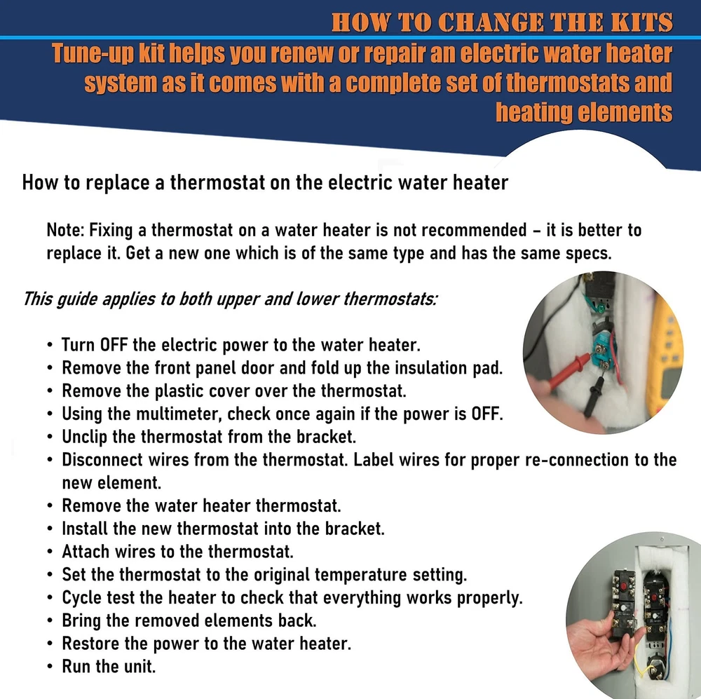 * Electric Hot Water Heater thermostat set. Includes upper and lower non-simultaneous thermostat. * Used for dual element water heaters. * Built in safety switch to prevent overheating. High limit at 170F. * Interchangeable with APCOM Style. * Fits most brands including American, AO Smith, Bradford White, Craftmaster, General Electric, GS Wood, Kenmore, Lochinvar, Maytag, Mor-Flo, Reliance, Sears, State and Whirlpool water heaters. 【Contains】 1 x Upper water heater Thermostat and 1 x Lower water heater Thermostat , Non-Simultaneous, 120V ~ 480V 【ONE YEAR WARRANTY】If you find any issue not limited on quality problems, please contact us in time to support or return/refund, we will try our best to solve it for you, please rest assured to buy. Temperature Adjustment Range: 90F ~ 150F. Thermo-O-Disc(TOD) Style, can exchangeable with Apcom Style KST series controls are designed to meet the high electrical capacity requirements of electric water heaters, using a temperature sensitive bimetal disc to deliver snap-action to the contacts. It has a long use time. The Electric Water Heater thermostats( tune-up kit/ Repair Kit/ Plumber'S Pack),FIT MOST MODELS OF WATER HEATERS: Whirlpool, BRADFORD WHITE; CRAFTMASTER; GENERAL ELECTRIC; GS WOOD; KENMORE; LOCHINVAR; A O SMITH; RELIANCE; RHEEM; RICHMOND; RUUD; STATE; MOR-FLO; APCOM