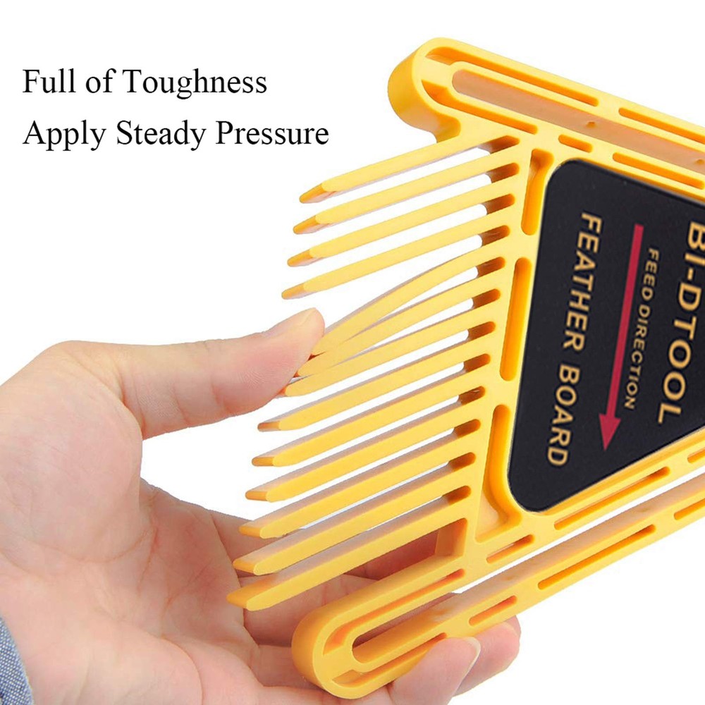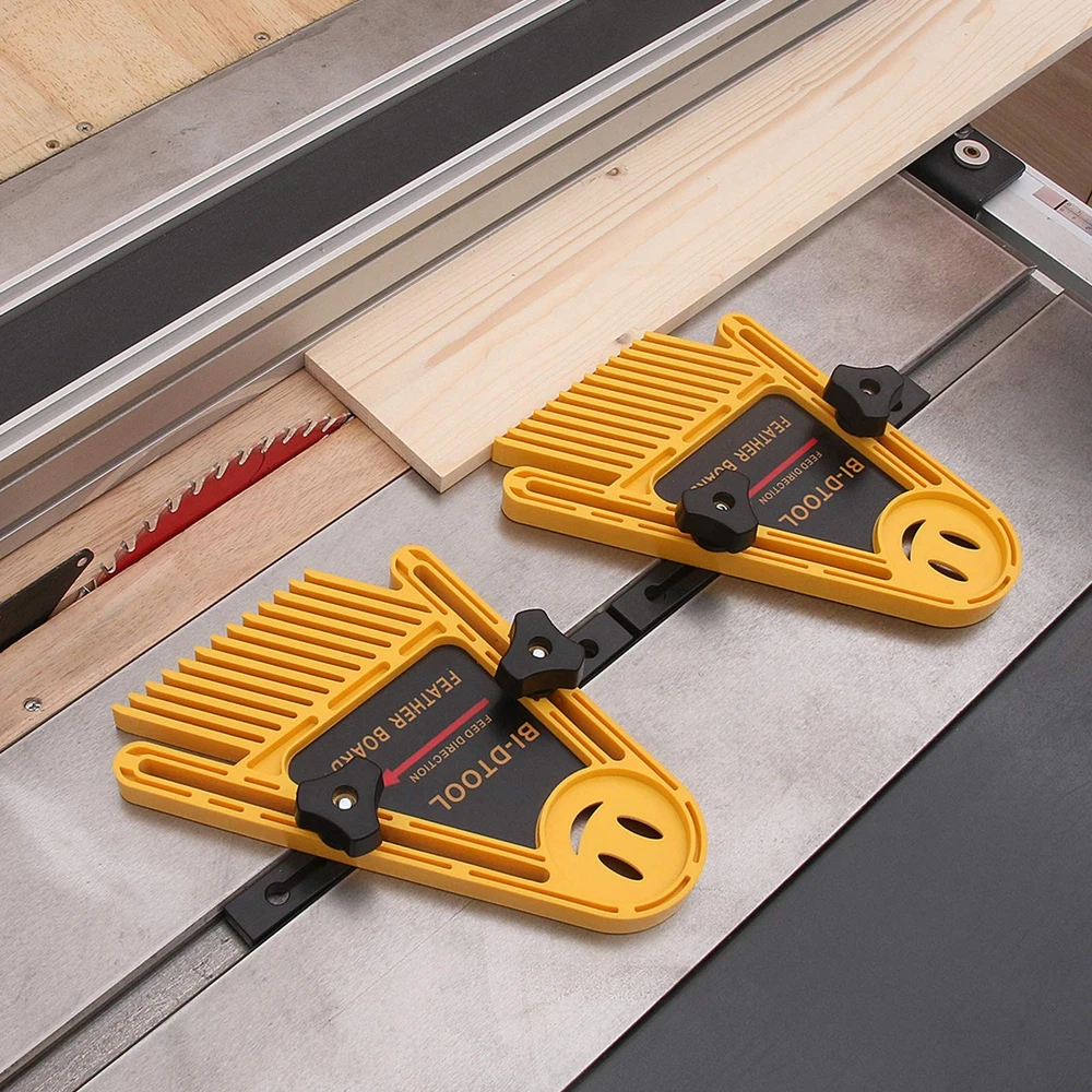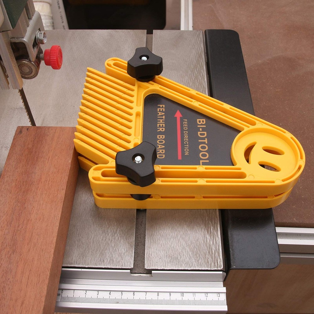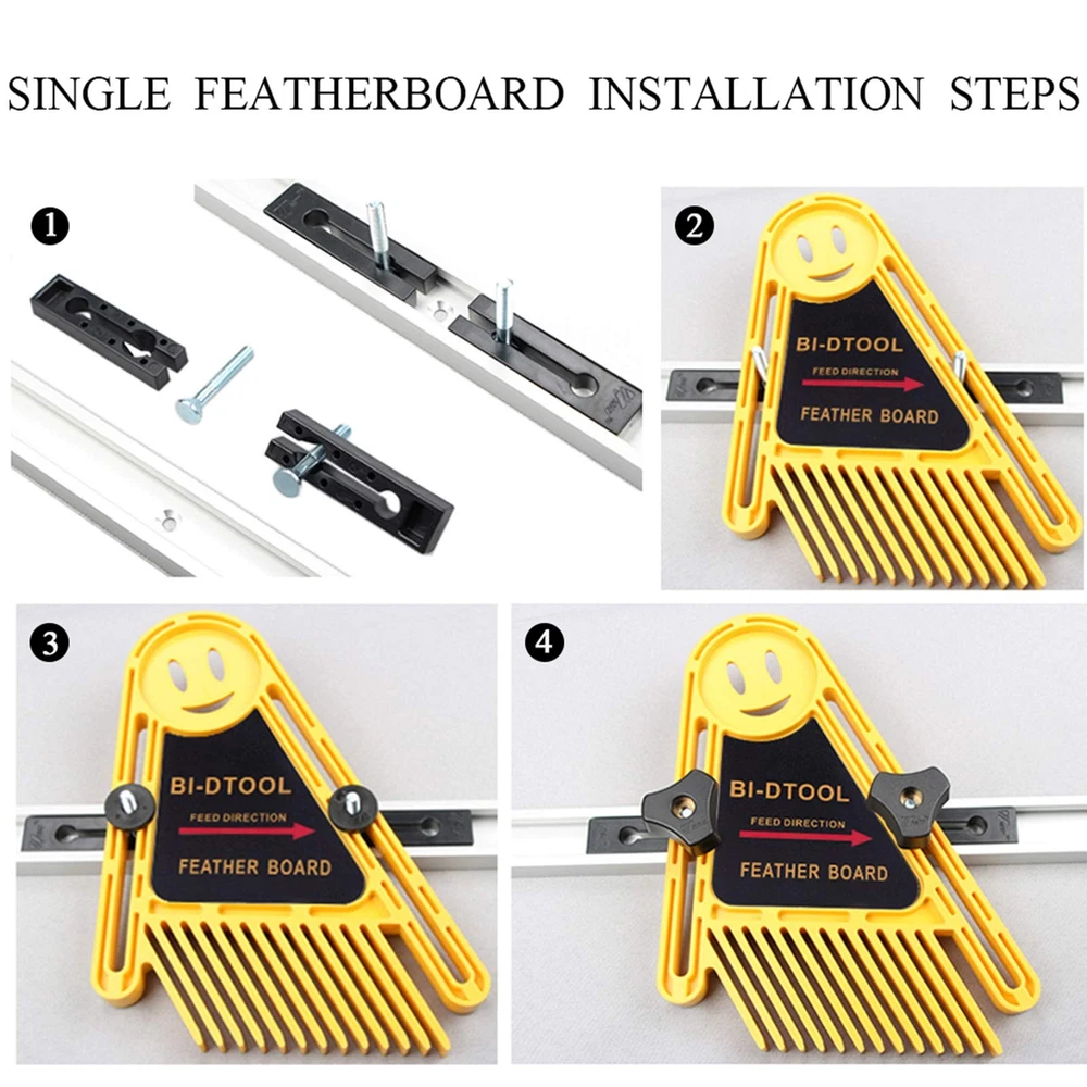 ABOUT THE FEATHERBOARD: We use a lot of different jigs in our shops and none is probably more simple than a feather board buddies. It's got a row of flexible fingers along the edge and when you mount it to your machine table it helps keep work pieces press down tightly to the table and over against the fence. The table saw jig builds accuracy and control in our cutting or machining operations and it can also help prevent a dangerous kickback from happening. A good woodcraft supply also acts as a third hand when you're running long stock through your machine or wide sheet. How to use: 1. Turn off the power 2. Place and align the logs you want to process 3. According to the size of the track, install the self-locking plastic slider 4. Install bolts (short for one piece and long for two pieces), put the spacers (thin for one piece and thick for two pieces ), then lock knobs to the featherboard tightly. Guaranteed: We offer premium quality products with outstanding . In the unlikely event you aren't 100% satisfied with your purchase, please feel free to . WIDELY APPLICABLE SIZE: Two widths Miter Bars(3/8 x 3/4 Inch)and t-slot bolts are applicable for most standard miter slots. And associated with wedge-lock hardware and split rail miter bar construction provide maximum hold for bandsaw table, router fence and more. RELIABLE MATERIALS: Our table saw featherboard is made from high-tech polymer and have special angled fingers so they can provide steady pressure which produces cleaner cuts with less chance of kickback, chattering or lifting. EASY TO INSTAll: Unique miter gauge slot with ergonomic knobs allows you set up the feather loc board to a miter slot or t-slot, aslo can be DIY as any accessories for woodworking you like. SAFETY FIRST: Featherboards holds the wood piece against the guide fence tightly to protect your hands and prevent kickback, blinding and bent blades. ACCURACY OF CUTS: Table saw feather boards design which includes ergonomic knobs and pre-load tension system provides consistent tension and maximum holding pressure to make your every cut accurate.