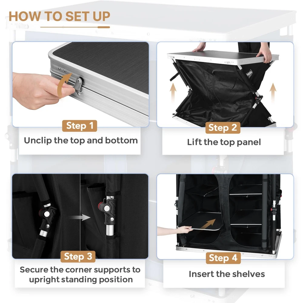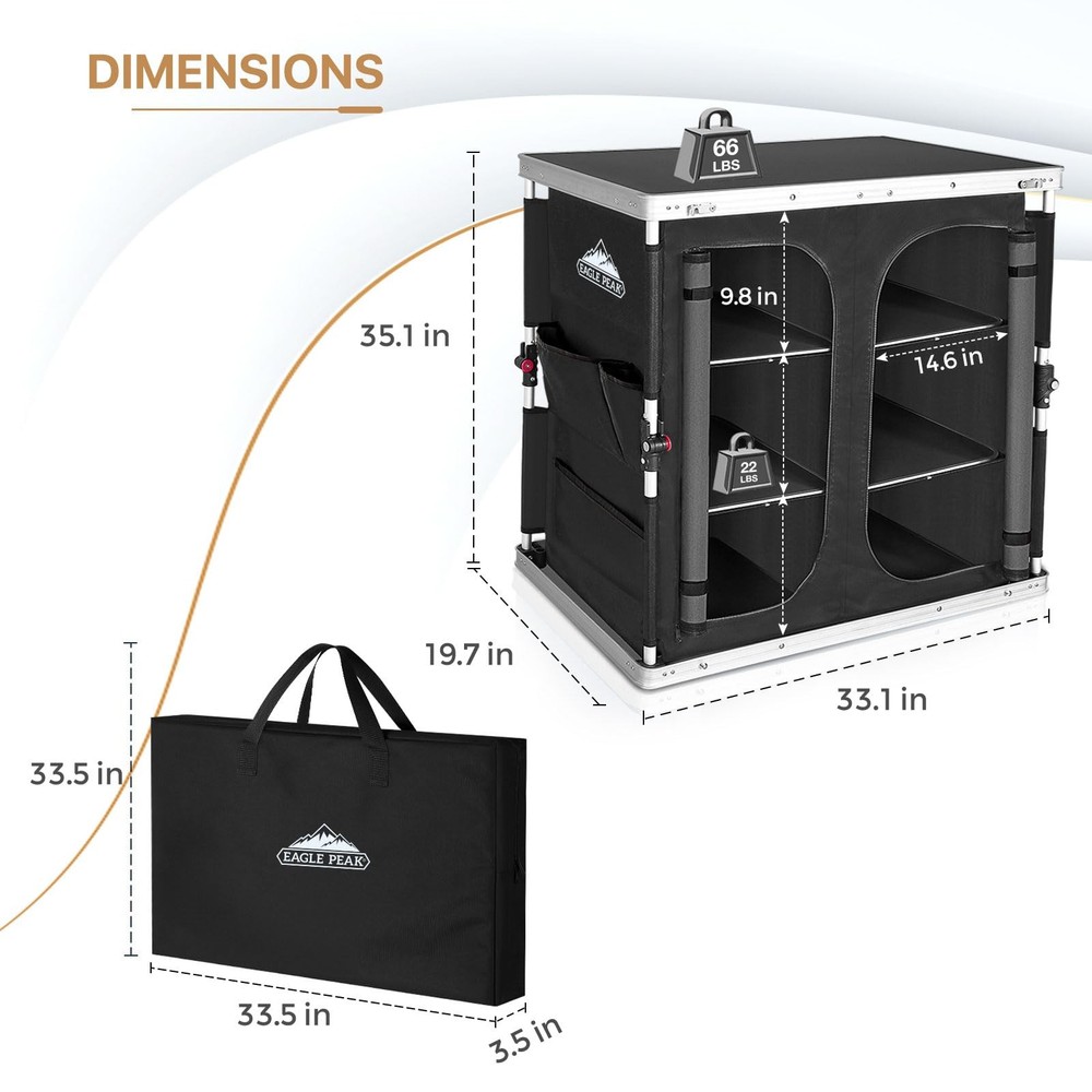 is a premier greenhouse and canopy brand that delivers innovative product with ease-of-use, combined with premium design aesthetics. is vertically integrated with one of the largest pop-up canopy manufacturers in the world. We invest in our product testing and product innovation laboratory to ensure that our product meets and exceeds industry quality standards and requirements. We are relentless in our efforts to innovate new ways to bring you safe, hassle-free, quality products. Our International & North American Product Development and Design teams work tirelessly to improve upon the status quo and deliver better looking and better functioning product to you. EASY SETUP, COMPACT, PORTABLE: camping table can be set up or put away in seconds with no tools. The 17.2 lbs table can be easily folded into a thin light weight suitcase with carry handle for compact storage and transportation. Pops open to 23.6 x 18.9 x 31.5 inches. Perfect for camping, BBQ, parties, picnics, backyards and tailgating. Includes a bonus carrying bag. EXCELLENT QUALITY: camping kitchen table is made of durable MDF tabletop, waterproof and stain resistant material, and is easy to clean. The frame is made of anti-rust powder-coated aluminum pipe and polyester 600D with PVC coating. The aluminum alloy bracket with corner leg support system ensures the strong stability for long lasting use. This table supports up to 66 lbs. UNIQUE DESIGN: folding camping table features a large 33.1 x 19.7 inch top surface area, center storage, and six large and small side pockets. The center zippered compartment offers a large accessible storage space to help organize your camp and protect your food from the bugs and animals. The versatile 3-tier storage organizer can be changed from 1 to 3 levels customized to your needs. BREATHABLE & EASY TO CLEAN: portable camping table’s waterproof desktop and the 3 level shelves can be conveniently removed to clean when dirty. 4 mesh backside windows provide breathable airflow. NOTE:the table should not be used in the rain. PROMISE: offers a 1-year limited after sale protection from the original date of purchase. Unlike many other camping kitchen table manufacturers, offers this for our frames, tops and bags! If you have any other questions, please contact our professional service team.