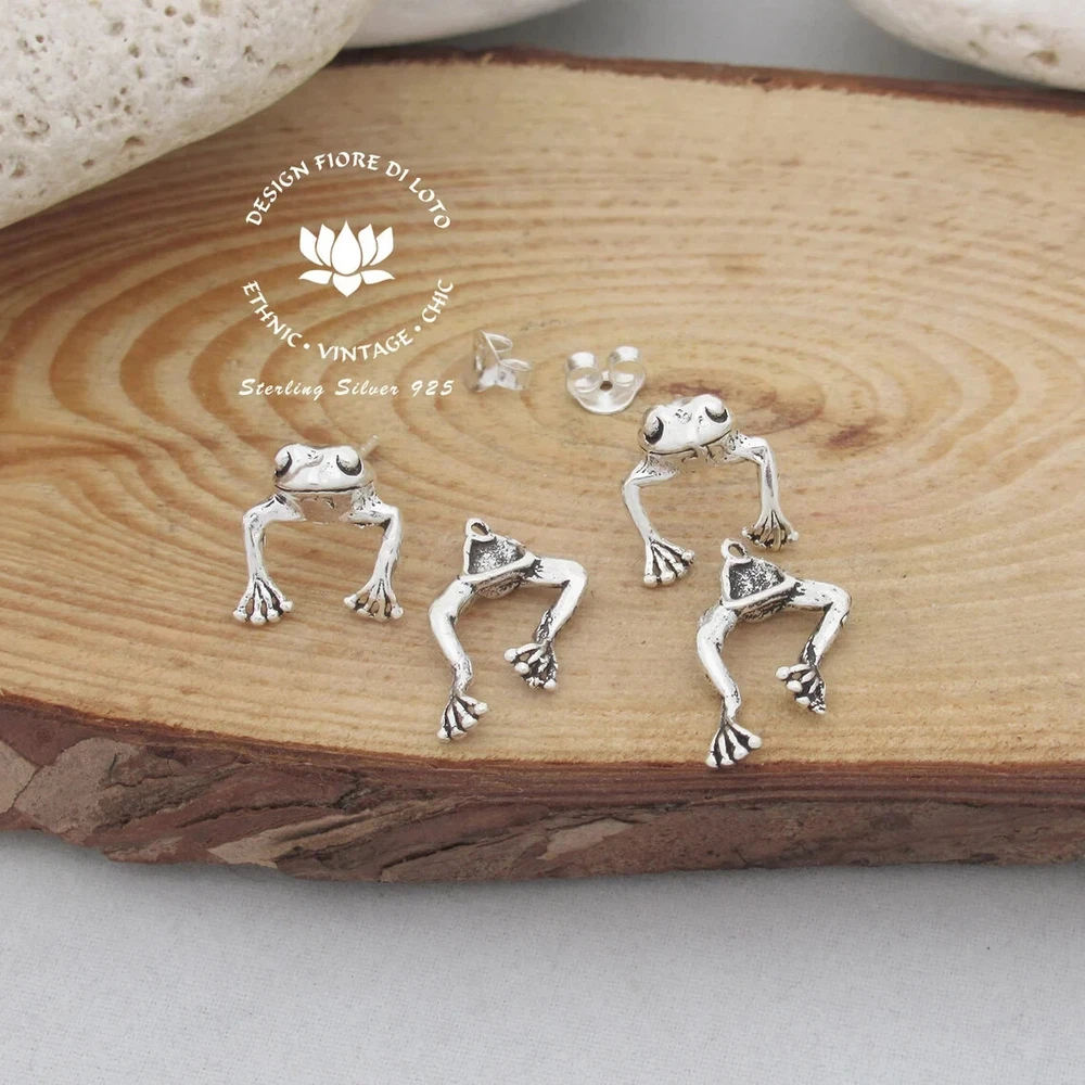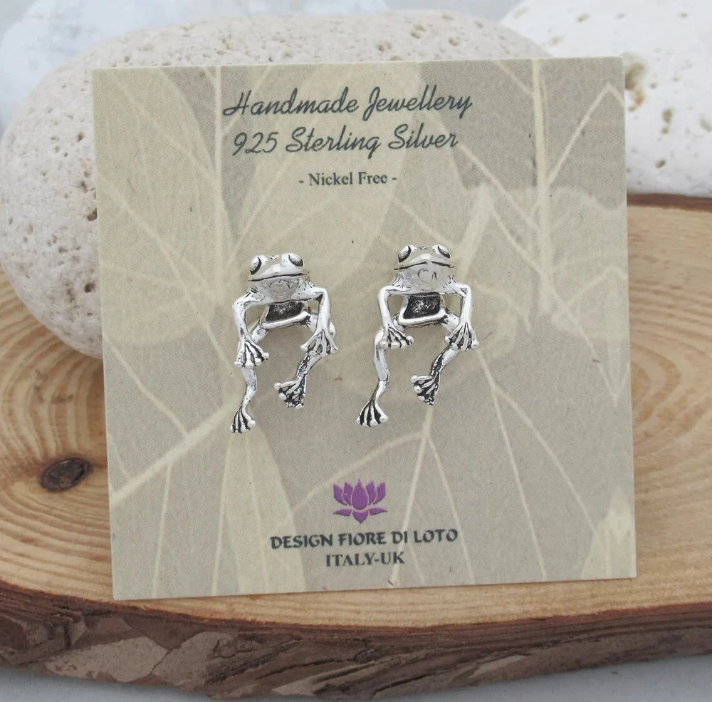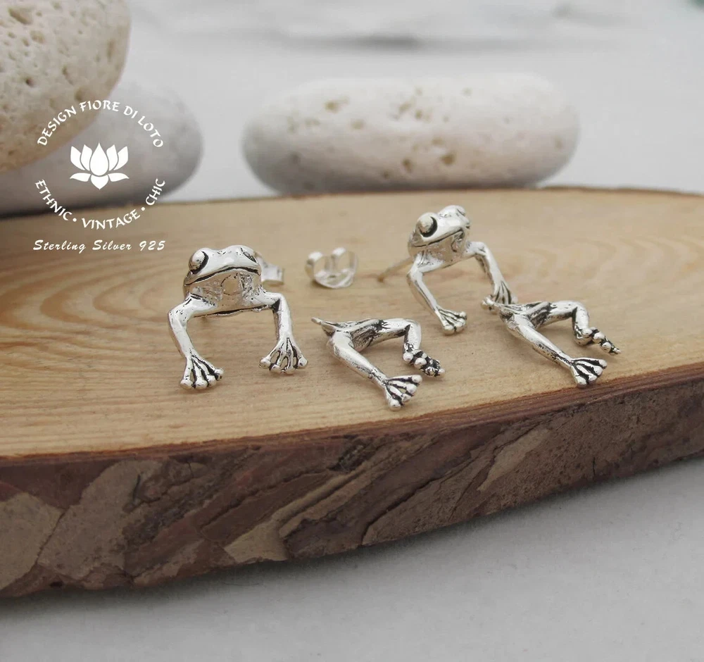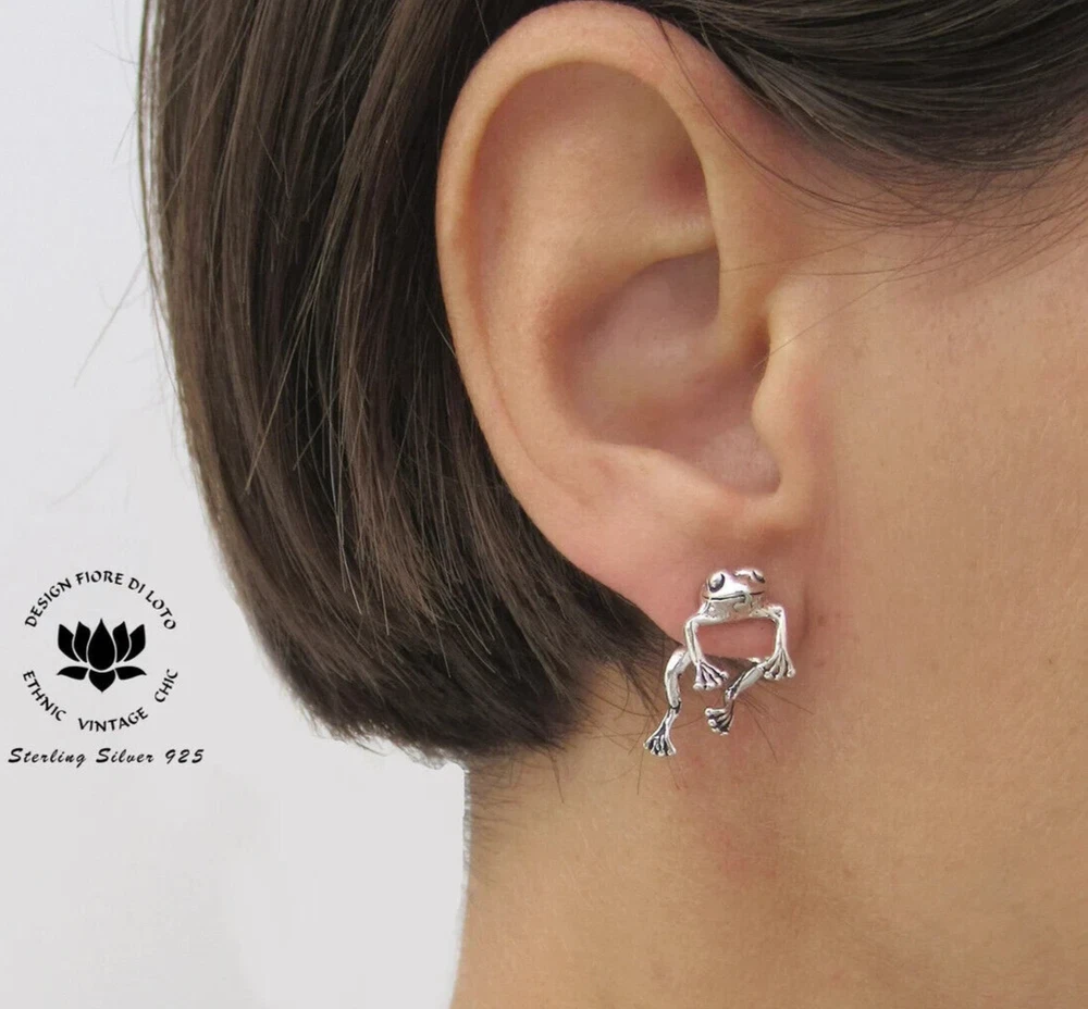 Frog Ear Jacket earrings sterling silver. Nickel FREE. Our stunning 925 sterling silver back and front frog earrings are a perfect jewelry gift for nature and frog lovers. These fun ear jacket fro gs have their heads showing in front of your ear, while their legs dangle behind. They make a great frog gift for your best friend or a trea t for yourself! Don't miss them Ear jacket earrings work like this: One part is the head with the the pin which goes through the "body" of the stud behind the earlobe. The butterfly encloses both pieces around the lobe. (Check all photos to see all pieces). You can use it like in the photos (earrings with head and body), or only the Frog head as a regular ear stud. Multi-buy discount available on this product! Dimensions: Height: 1.9 cm Width: 1.2 cm Weight per pair: 3.44 gram SOLD ONLY IN PAIRS! **Please see ALL listing photos for a better idea of proportion Delivery Information All items dispatched from the UK. Studs will come carefully wrapped in eco-packaging. Standard Tracked 48 Shipping with Royal Mail or Yodel included FREE. Tracking Number details will be sent after dispatch (which is usually within 1 working day of purchase. Weekends/festivities excluded). Faster shipping options also available for the UK. Worldwide shipping available with Royal Mail Tracked & Signed. Returns accepted within 14 days of receipt. At customers’ expense.