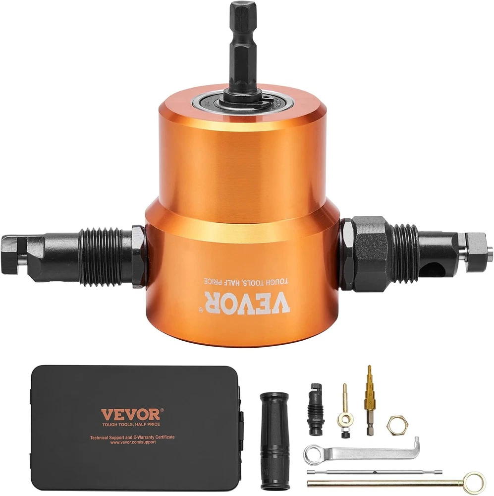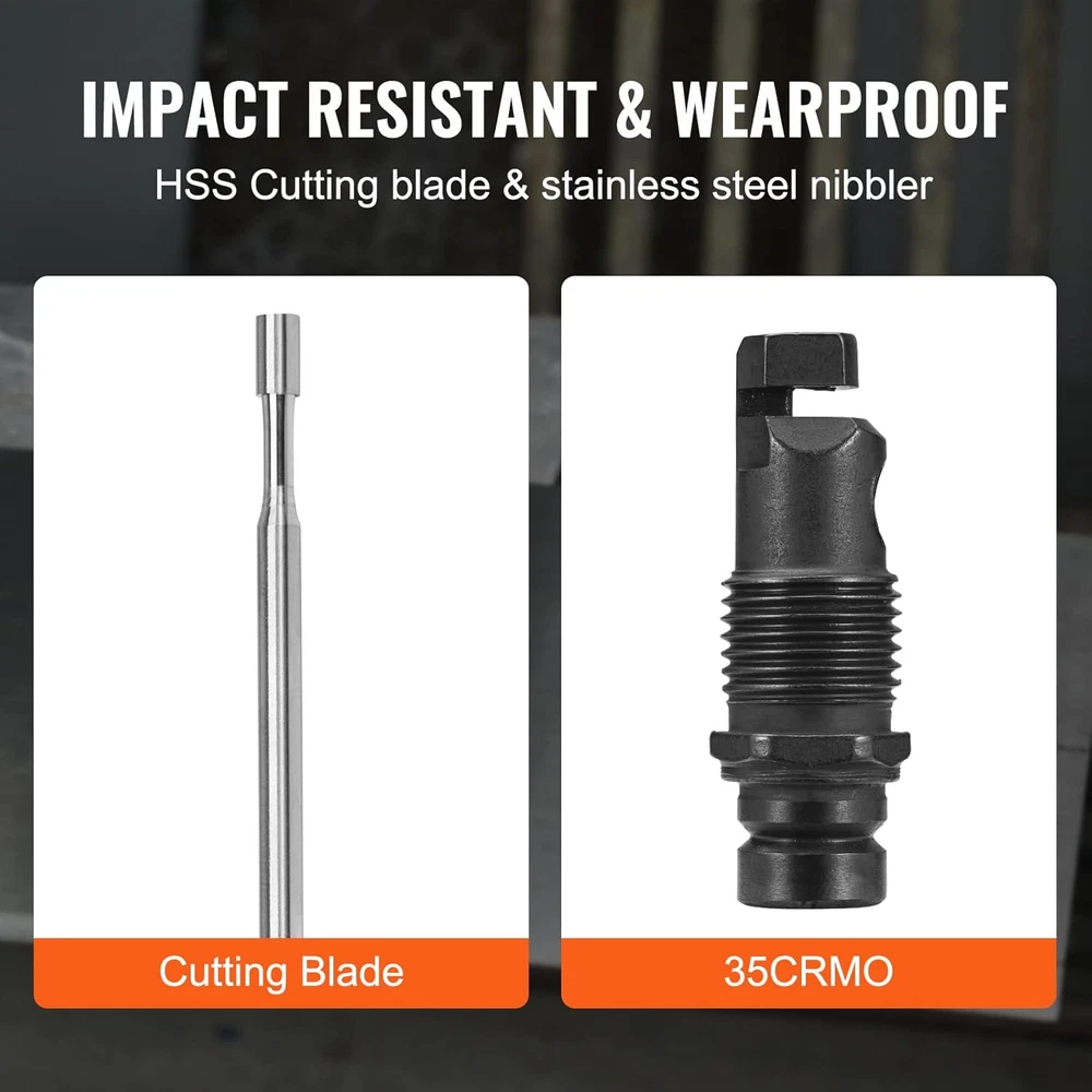 Combine and Adapt: Are you ready to drill? Effortlessly use our double head sheet metal nibbler cutter with a 1500-3000 RPM electric drill, drill press, or punching and cutting machine. Its high adaptability makes it perfect for automotive and household repairs, cutting various materials with precision. Cut Without Restrictions: When paired with an electric drill, this double head sheet nibbler can easily cut through carbon steel plates, stainless steel, copper plates, aluminum plates, plastic, and wood. It can cut through a maximum thickness of 0.06"/1.6mm for carbon steel plates, 0.05"/1.2mm for stainless steel, and 0.08"/2.0mm for plastic and wood. Flexible Cutting Options: With a 360-degree rotating cutting head, our metal nibbler drill attachment is perfect for cutting straight lines, curves, circles, and various shapes. It offers a cutting radius of up to 0.47"/12mm, ensuring exceptional precision and flexibility. Drill a Starting Hole: Easily drill smooth and burr-free circular holes with diameters of 0.16"/0.24"/0.31"/0.39"/0.47"(4/6/8/10/12mm) using our step drill bit. This tool allows for secure one-handed operation, ensuring precise and flawless results. Built to Tough: Our nibbler attachment kit comes with an HSS cutting blade, which is strong and does not easily break. The alloy steel nibbler is resistant to impact, wear, and tear. Plus, the semi-circular double-headed design ensures easy switching and a long service life. Note: NOT suitable for corrugated steel. Product Description Revolutionize Your Metal Cutting Experience Experience precision cutting like never before with VEVOR metal nibbler drill attachment. Compatible with electric drills at 1500-3000 RPM, perfect for automotive repair, home repair, and more. Elevate your cutting tasks. This double head sheet metal nibbler cutter will help you to cut through metals up to a maximum thickness of 1.6mm, ensuring that it meets your diverse needs. It provides unparalleled versatility, allowing you to effortlessly cut through metals, plastics, wood boards, etc. The cutting head can rotate 360°, making cutting straight lines, curves, circles, and other shapes easy. Our double head sheet nibbler is designed to handle whatever your project demands easily. Equipped with a step drill bit, you can effortlessly drill round holes with 4-12mm diameters. With a one-hand grip operation, you will achieve smooth, even holes without any burrs. Built with an HSS cutting blade and an alloy steel nibbler, this metal nibbler drill attachment is strong, durable, and has a long service life. Its sturdy structure ensures it can withstand high impact and wear, making it an excellent investment for your cutting needs. More choice for you Cutting Thickness 0.07 in / 1.8 mm Cutting Thickness 0.16 in / 4 mm Cutting Thickness 0.06-0.08 in / 1.6-2.0 mm Power 380W Power 625W Power Worked with an electric drill Output Speed 1800 RPM Output Speed 1000 RPM Output Speed 1500-3000 RPM Double Head No Double Head No Double Head Yes