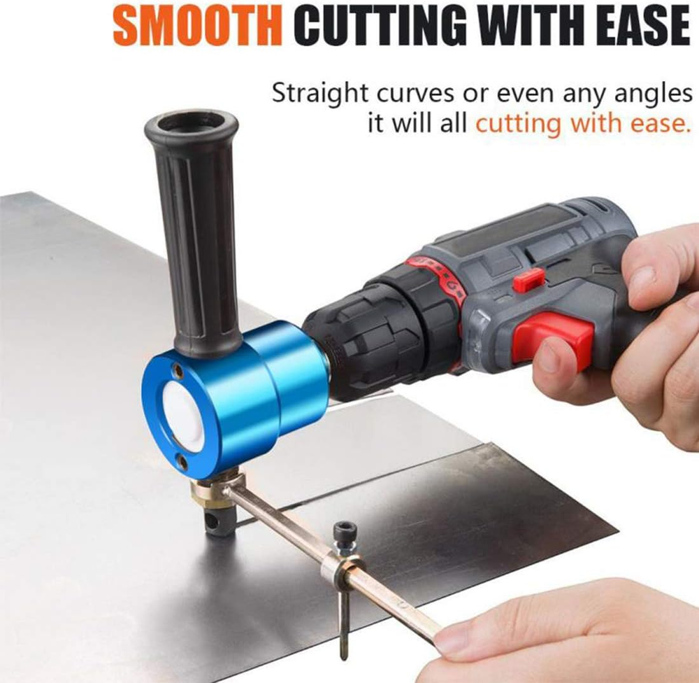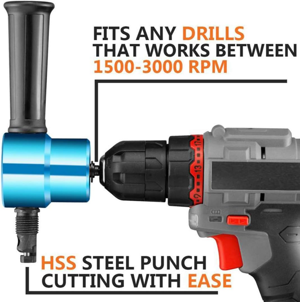 Easy and fast to cut 14 gauge material and creates a precision, burr free edge 360 degree double cutting head to cut straight line, curve line and circles HSS cutting blades to cut including but not limited to: Sheet metal, corrugated material, pipes, complex profiles, powder coated material, stainless steel, copper, aluminium, formica, plastic, fibreglass Fits any drill that works between 1500-3000 RPM, More easy and powerful than normal shears and snips REXBETI Metal Nibbler