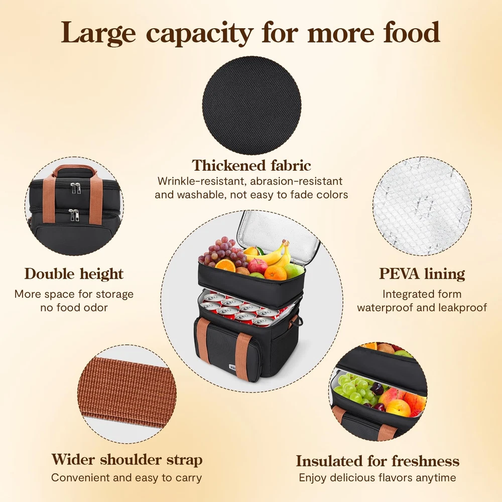 Product Name: Double Layer Heightened Crossbody Lunch Bag Product Shape With its sleek, layered cube design and smooth lines, this lunch bag blends beauty with practicality for your everyday carry needs Dimensions Measuring 25cmx 18cmx 27.5cm, this bag offers the perfect amount of space to hold your daily lunch essentials without being bulky and easy to carry around INTERIOR MATERIALS: The lining is made of high-quality snowflake-patterned aluminum foil and PEVA material. This combination not only insulates and keeps food fresh, but also ensures that your lunch tastes as good as when it was first made. Plus, it's easy to clean Exterior Fabric: The exterior is made of a stylish and durable cationic fabric mixed with a soft and comfortable non-woven fabric. The cationic fabric has excellent gloss and abrasion resistance, giving the bag a stylish appearance and durability. The non-woven fabric enhances the softness and breathability of the bag, ensuring a comfortable feel LARGE CAPACITY: The specially designed double-layer elevated structure provides amazing storage space, which can easily accommodate multi-layer bento boxes, fruits, beverages and cutlery to meet your diversified lunch combination needs Insulation: Aluminum foil and PEVA lining inside form an effective insulation layer to keep food warm and fresh for a long time even outdoors, enhancing your lunch experience STYLISH CROSSBODY DESIGN: Equipped with an adjustable shoulder strap, it supports crossbody, freeing your hands during busy commute or outdoor picnic DURABLE AND EASY TO CLEAN: The combination of cationic fabric and non-woven fabric is not only beautiful and durable, but also easy to take care of, stains can be easily wiped away, so the bag stays as good as new for a long time This double layered and heightened crossbody lunch bag is an indispensable companion in your daily life Now start enjoying the special dining pleasure ELEGANT DESIGN AND PRACTICAL: The double height crossbody lunch bag is stylishly designed and measures 9.8“ (L) x 7” (W) x 10.8” (H), which can hold your daily necessities without looking bulky. HIGH QUALITY INSULATION MATERIAL: Lined with high-quality aluminum foil and PEVA material, it is insulated to keep the food fresh and tasty, waterproof and leak-proof, easy to clean Durable and fashionable appearance: made of Oxford cloth, thickened cationic fabric is not only wrinkle-resistant, wear-resistant and washable, with good heat preservation, but also not easy to fade. SPACIOUS STORAGE SPACE: Double-layer construction provides ample storage space for multi-layer bento boxes, beverages and utensils. The insulated material keeps food warm and fresh for a long time, enhancing your lunch experience CONVENIENT SLANTED DESIGN: The lunch bag comes with an adjustable shoulder strap for easy slanting, freeing up your hands for busy commutes or outdoor picnics. This lunch bag is an indispensable companion in your daily life.
