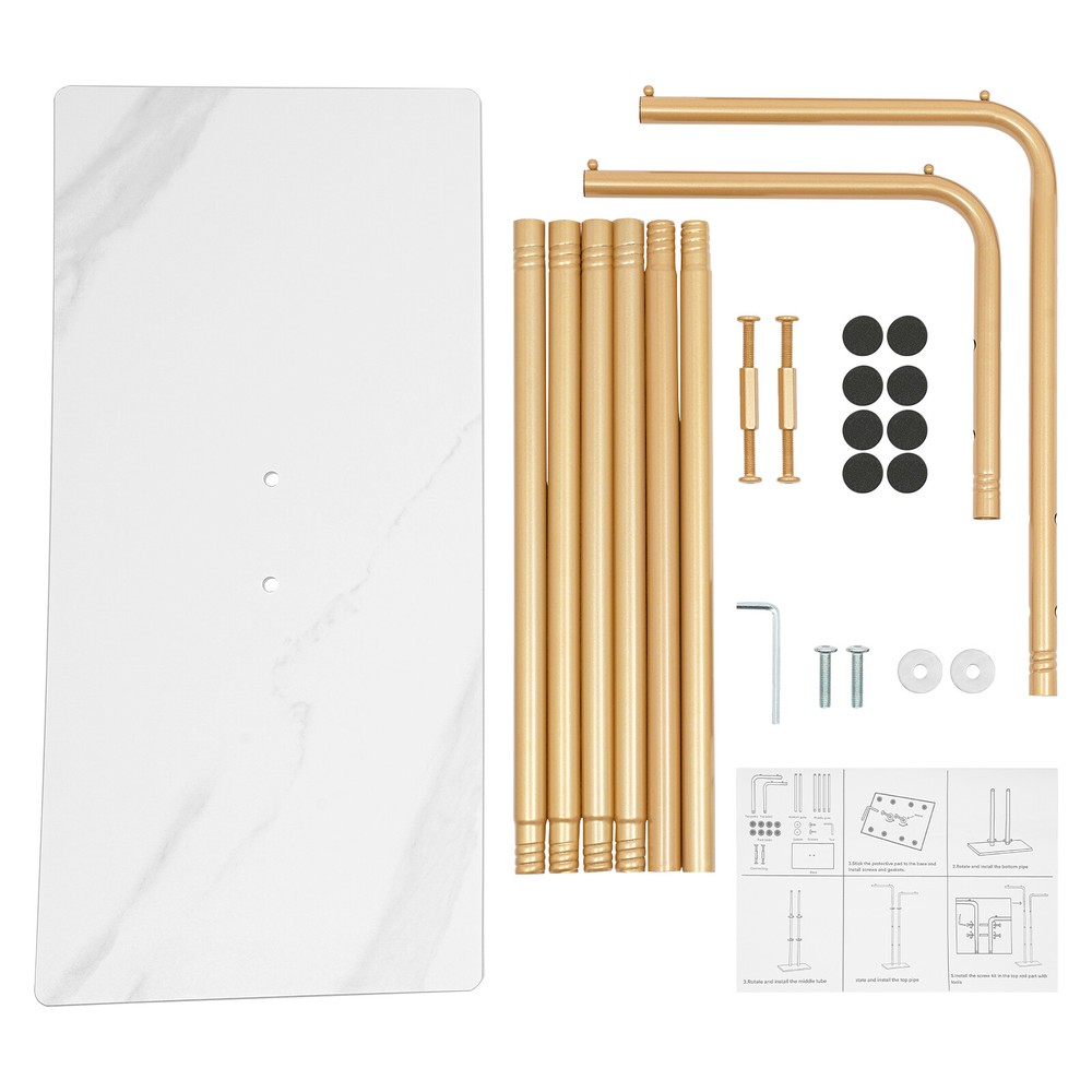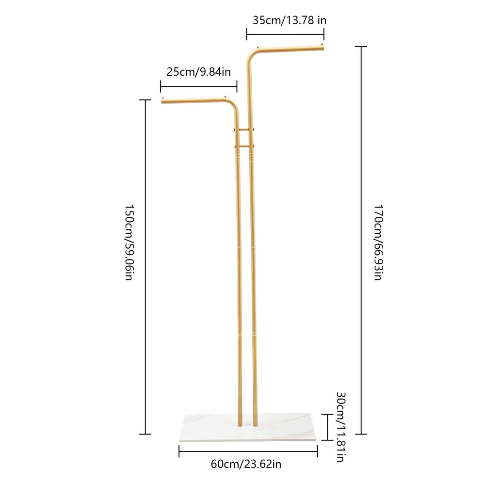 Double L-shaped Coat Rack Metal Coat Rack W/ Slate Base+8 Non-slip Foot Pads New Description A great coat rack is not only a caring steward for your clothes, but also an artistic accent to your home life. Our coat rack is designed for hanging clothes, hats, bags, scarves, and other items in an ordered manner. It is made of high-quality iron and slate , which is not only beautiful but also can be used for a long time. It can effectively help you hang and organize various types of clothes and solve the storage problem of a small house. Key Features Sturdy and Durable: Made of slate and iron with a high-temperature baking paint process, this product is wear-resistant , corrosion-resistant , and durable, ensuring your long-term use. Storage Assistant: The double L-shaped rods provide enough storage space to hang your clothes, bags (both are not included), etc, keeping your clothes tidy and organized for storage. Strong Load-bearing Capacity: The thickened iron pipes (thickness: 0.8mm, diameter: 0.87 in ches) make this product capable of bearing about 77.16 lbs , allowing you to use it with confidence. Space-Saving: This clothing rack features a compact and freestanding design, allowing it to fit seamlessly into any space. The unique dual-rod design maximizes hanging capacity while taking up minimal floor space, making it ideal for small apartments or offices. Generous Appearance: The white slate base, double L-shaped gold rods, and smooth lines give this product a generous appearance that can easily blend into your room. Appropriate Height: The appropriate height ( 59.06, 66.93 inches ) makes your long clothes less likely to fall and get dirty, and it is convenient for you to hang and retrieve clothes. Assembly in a Breeze: The simple structure, English installation diagram, and complete accessories allow you to easily and quickly assemble this product, saving time and effort. Effortless Cleaning: Thanks to the smooth surface, simple structure, and open design, you can easily wipe off the dirt on it with a soft cloth. Good Customer Service: We stand behind all our guests and look forward to assisting you with your purchase. It is our pleasure to answer your confusion and questions. The end of the story between us is not "we sell and you buy". Details Slate Base: The large rectangular base (23.62*11.81in) with eight non-slip foot pads can provide stable support to avoid tipping over due to heavy clothing. Smooth Edge: The rounded and smooth edges not only add to the aesthetics of the product but also improve the safety of use. Application It can be used in hallways, bedrooms, living rooms, bathrooms, entryways, foyers, study rooms, children's rooms, laundry rooms, offices, clothing stores, apartments, hotels, dormitories, etc. It can be used to hang coats, scarves, hats, school bags, handbags, purses, suits, garments, and so on. Specification Color: Golden, White Style: Modern Material: Slate, Iron Process: High-temperature Baking Paint Assembly Required: Yes Mount Type: Free Standing Total Load-bearing Capacity: About 35kg/77.16lbs Iron Pipe Thickness: 0.8mm/0.03in Iron Pipe Diameter: 22mm/0.87in Short Rod Size(L*H): 25*150cm/9.84*59.06in Long Rod Size(L*H): 35*170cm/13.78*66.93in Base Size: 60*30cm/23.62*11.81in Package Size: 69*37*15cm/27.17*14.57*5.91in Gross Weight: 6.5kg/14.33lbs Package Included 1* Coat Rack 8* Foot Pads 1* English Installation Diagram All Accessories for Installation Notes This product does not include other items. Please use this product within the load-bearing range. Please allow the slight color difference caused by the shooting light and the 1-3 cm error due to manual measurement, and make sure you do not mind before ordering. Payment Delivery details Terms of sales About us Contact us Payment We accept ebay payment 。 Fees such as import duties, taxes are not included in the item price or shipping costs. These charges are the buyer's responsibility. Delivery details Shipping: 2-9 working days to: USA Terms of sales We maintain high standards of excellence and strive for hundred percent customer satisfaction. Feedback is very important to us. We hope that you contact us immediately before you give neutral or negative feedback, so that we can address your concerns. It is impossible to address issues if we do not know about them! About us Your satis faction is our ultimate goal. We work hard to earn your trust and future business. Our certified technicians have tested each item before shipping. The unit comes with 1 year limited warranty on all manufacturing defects. a) If you receive a defective item, you may return it or ask for a discount. Please contact us within 14 days after you receive the package. b) What you returned must be intact and in its original packaging as re? u. Customer is responsible for shipping costs of the returned item. c) We will cover the cost of shipping back t with the shipping rate indicated in the registration page. We will send you a new unit or refund the full payment you paid. Thank you. Contact us Business Hour Business Hour: Monday To Friday: 8:30 AM to 5:00 PM (Beijing China time) Due to time zones, our reply to your questions may not be immediately. But within above working time, we will reply your email within 24 hours. If it's non-workdays, please kindly be patient and wait till Monday. Please contact us with ebay message. Please feel free to contact us if you have any questions. Monday To Friday: 8:30 AM to 5:00 PM (Beijing China time) Due to time zones, our reply to your questions may not be immediately. But within above working time, we will reply your email within 24 hours. If it's non-workdays, please kindly be patient and wait till Monday. Please contact us with ebay message. Please feel free to contact us if you have any questions. Brand Unbranded MPN N/A Type N/A Material Slate, Iron Process High-temperature Baking Paint Assembly Required Yes Color Golden, White Mount Type Free Standing Number of Pieces 1 Gross Weight 