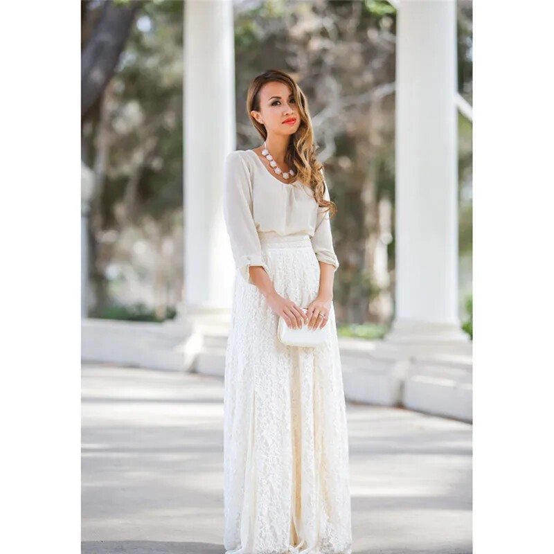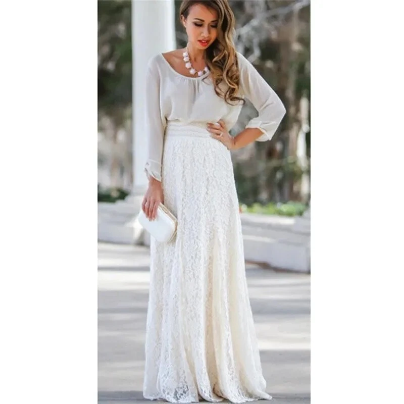 Double Lace Layer Chiffon Pleated Long Maxi Skirt Elastic Waist Long Skirt