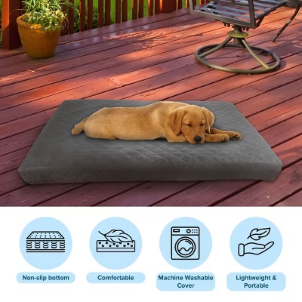 Description With a two-layer foam construction and a water-resistant inner lining, the Dog Crate Pad by is designed with comfort in mind. The crate bed features a 1.75-inch layer of memory foam at the base and another 1.75-inch-thick layer of high-density foam that can support pets weighing 40-75-pounds, perfect for larger dog breeds. The removable waterproof inner cover protects the dog mat from getting wet or soiled if your active pet is a swimmer or enjoys playing in the mud. The removable microsuede outer cover offers superior cuddling comfort, has a water-resistant and non-skid bottom, and is machine washable for convenience. These easy to care for dog beds are sure to be a hit for both you and your pet. Important: is committed to providing the consumer with the absolute best price and value on all of our products. Note: This is an exclusive product of and only Dog Beds Large Sized Dog by are guaranteed to be genuine. Avoid buying counterfeit products and transacting with unauthorized sellers. highlights WATER RESISTANT DOG BED - This dog crate bed features a removable water-resistant inner liner for use inside or outside without worrying about water damage. The large dog bed is perfect for use at home, in crates, or carriers to help contain accidents. MAXIMUM COMFORT - The orthopedic dog bed features 1.75-inches of memory foam at the base and 1.75-inches of high-density foam on top that offers joint support by gently cushioning pressure points, ideal for elderly pets or those suffering from arthritis. MACHINE WASHABLE COVER - This dog bed for crate has an attractive microsuede cover with a water-resistant and non-skid bottom, plus a wraparound zipper so it can be removed for easy cleaning as needed. For best results, machine wash or use a light vacuum. MULTIUSE - This washable dog bed is great for use inside the car, RV, or on trips to the lake; use it at home on a porch or patio for dogs that like to swim and play in the mud. This big dog bed can be used anywhere your furry friend likes to lounge. PRODUCT DETAILS - Materials: Microsuede, Polyurethane Foam, and Memory Foam. Dimensions: (L) 36" x (W) 27" x (H) 3.5". 's Large Dog Beds are Recommended for Pets Weighing 40-75lbs. Color: Gray. Dimensions: (L) 36 x (W) 27 x (H) 3.5 inches pets-beds- beds Bed Size Pet Weight (lbs.) S up to 20 M up to 30 L up to 45 XL up to 75 All sizes in inches unless otherwise noted.
