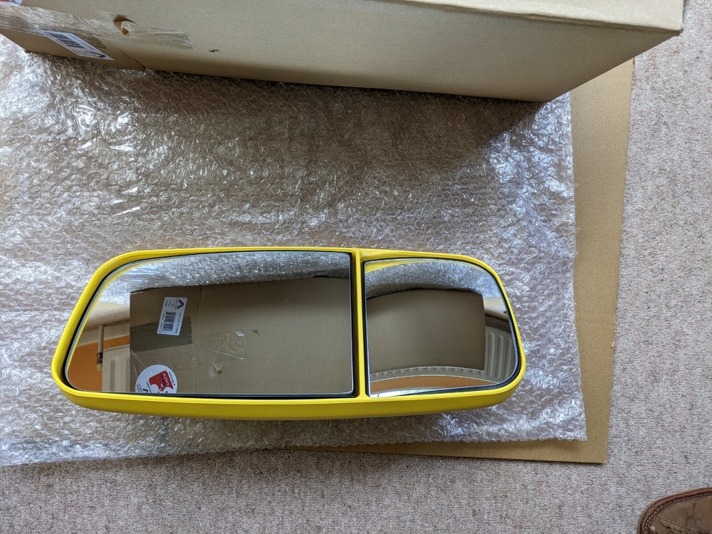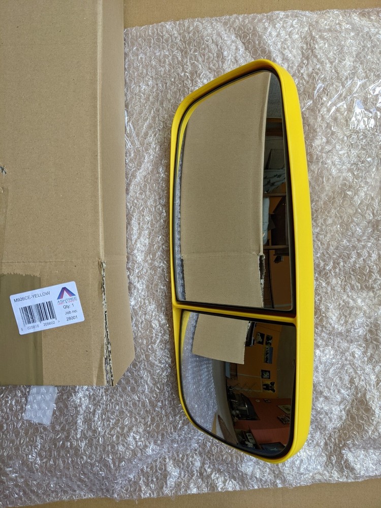 Yellow M926CE Manually adjustable Twin mirror class e11 II III &IV Ashtree Cyclesafe Mirror Main Mirror (1200 r) Wide Angle (300 r) Overall 384mm Tall x 184mm Wide Fits arms or poles 16 - 28mm Ø Post by Royal Mail/Evri/other No VAT