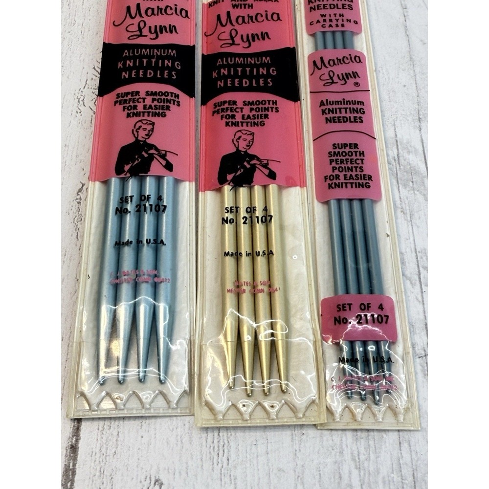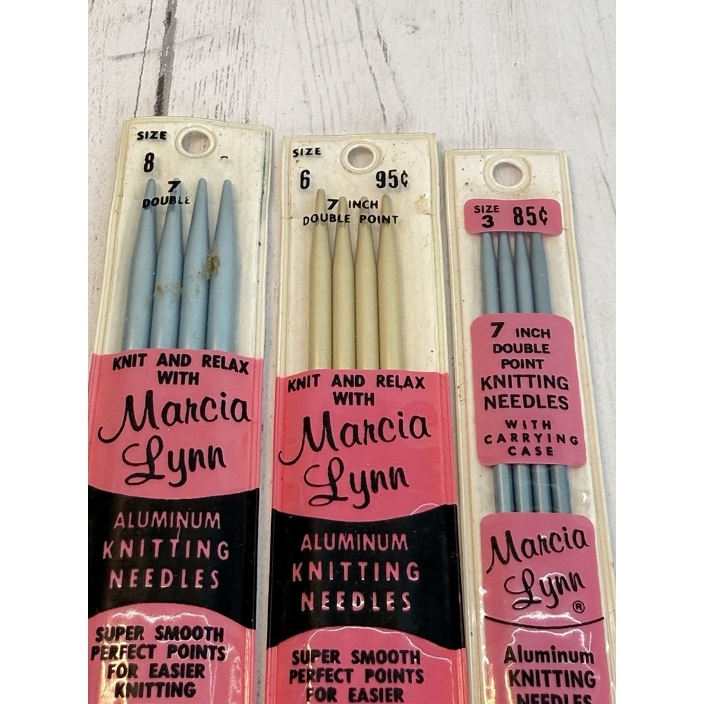 Double Point Aluminum Knitting Needles Pins 7" Marcia Lynn Sz 8 6 3 NEW Case Vintage new in carrying case - made in the USA double point, 7" 4 in each package Size 3, 6 and 8