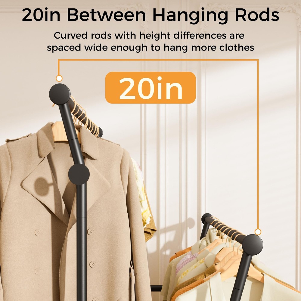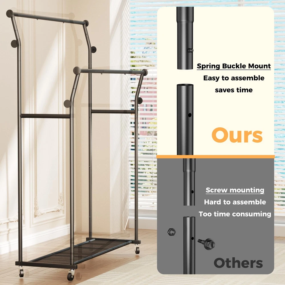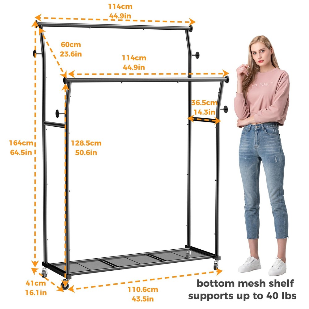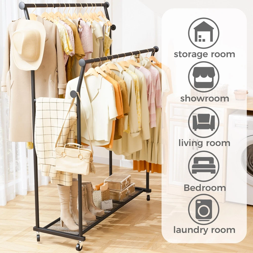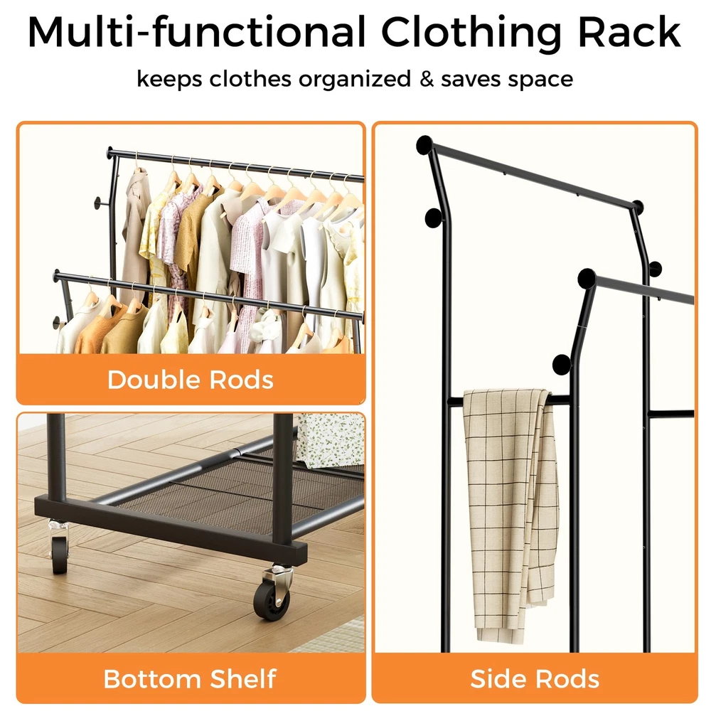 Maximize Your Storage with a Spacious, Heavy-Duty Clothes Rack This multifunctional clothing rack is designed to bring durability, convenience, and ample storage space to any room. Whether you're organizing your closet, bedroom, or laundry area, this rack offers the perfect blend of function and style. Spacious Double Bars: Features high and low hanging rods with a unique outward-curving top that expands hanging space. With 20 inches between the two rods, clothes can hang independently on both sides without crowding. The 64.5-inch height allows for long garments like dresses and pants to hang freely without touching the floor. Multi-Functional Storage: Includes 4 utility hooks and 2 side rods for easy access to bags, hats, belts, scarves, towels, and umbrellas. The bottom mesh shelf is ideal for shoes, boxes, and storage bins—preventing smaller items from slipping through. Heavy Load Capacity: Built with premium steel for maximum strength and stability. The coat rack supports up to 230 lbs, with 50 lbs allocated to the bottom shelf. Perfect for winter coats, full outfits, and more without fear of tipping or bending. Easy to Move & Lock: Equipped with 4 smooth-rolling 360° swivel wheels, including 2 lockable ones. Move it effortlessly between rooms and secure it in place wherever you need it. Ideal for bedrooms, living rooms, laundry rooms, storage rooms, balconies, porches, offices, and more. Quick Tool-Free Assembly: The main frame uses spring buckle connections—no screws or tools needed. Setup is fast, easy, and hassle-free. This rolling garment rack combines stability, versatility, and ease of use—an ideal choice for expanding your storage with style. double rod clothing garment rack on wheelsSpacious Double Rod Design: This rolling clothes rack features high and low double rods, with the top rod curved outward to maximize hanging space. The 20-inch gap between the rods allows garments to hang independently on both levels without tangling or overlapping. With a height of 64.5 inches, this coat rack is perfect for hanging longer items such as dresses, coats, and pants without touching the floor. The clothing racks for hanging clothes is tall enough to accommodate clothes of various lengths. Multifunctional Clothing Rack: This coat rack includes 4 utility hooks and 2 side rods—perfect for hanging bags, hats, belts, scarves, towels, umbrellas, and more. The mesh shelf at the bottom keeps small items from slipping through and provides extra storage space for shoes, boxes, or bags. High Load Bearing Capacity: Made of high-quality steel, this garment rack is built with a strong and stable structure. It supports up to 220 pounds overall, with the bottom shelf holding up to 40 pounds. Perfect for hanging all types of clothing without worrying about tipping or bending. Multi Scenario Use: This portable clothes rack features four 360-degree swivel wheels, including two with locking mechanisms, making it easy to move and secure in place. Ideal for bedrooms, living rooms, laundry rooms, storage areas, entryways, balconies, offices, and more. Easy Assembly: The main structure of this wardrobe rack for hanging clothes connects with spring-loaded clasps and comes with detailed instructions for quick and easy setup. If you have any questions before or after your purchase, feel free to contact us.