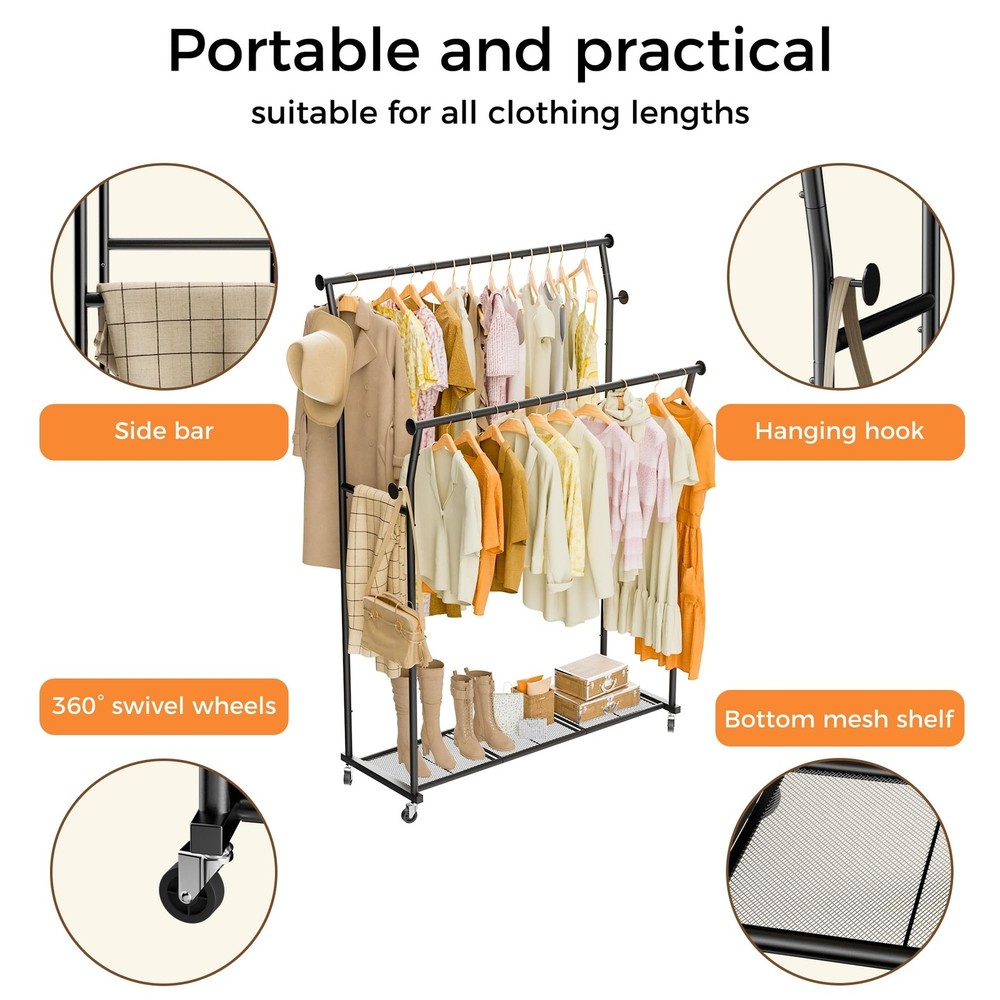 Double Rods Clothes Rack, Rolling Clothing Rack for Hanging Clothes with Hooks&Mesh Shelf, Portable Wardrobe Rack, Metal Coat Rack Sturdy Garment Rack for Bedroom Laundry Living Room Storage, Black Product Details Brand: TechSpanner Color: BLACK Material: Metal Recommended Uses For Product: Coats, General Clothing Storage, Hats, Shoes Product Dimensions: 14.57"D x 43.31"W x 64.56"H Brand: TechSpanner Color: BLACK Material: Metal Recommended Uses For Product: Coats, General Clothing Storage, Hats, Shoes Product Dimensions: 14.57"D x 43.31"W x 64.56"H Installation Type: Free Standing Special Feature: Portable Style: Double-Rod Finish Type: Painted Load Capacity: 220 Pounds Number of Shelves: 3 Furniture Finish: Iron Assembly Required: Yes Item Weight: 11.5 Pounds Maximum Weight Recommendation: 435 Pounds Manufacturer: TechSpanner Part Number: DRCR01 Item Weight: 11.5 pounds Country of Origin: China Item model number: DRCR01 Finish: Painted Item Package Quantity: 1 Special Features: Portable Included Components: Wheel, Rod Batteries Required?: No Warranty Description: 1 Year Manufacturer Date First Available: March 18, 2025 double rod clothing garment rack on wheelsSpacious Double Rod Design: This rolling clothes rack features high and low double rods, with the top rod curved outward to maximize hanging space. The 20-inch gap between the rods allows garments to hang independently on both levels without tangling or overlapping. With a height of 64.5 inches, this coat rack is perfect for hanging longer items such as dresses, coats, and pants without touching the floor. The clothing racks for hanging clothes is tall enough to accommodate clothes of various lengths. Multifunctional Clothing Rack: This coat rack includes 4 utility hooks and 2 side rodsperfect for hanging bags, hats, belts, scarves, towels, umbrellas, and more. The mesh shelf at the bottom keeps small items from slipping through and provides extra storage space for shoes, boxes, or bags. High Load Bearing Capacity: Made of high-quality steel, this garment rack is built with a strong and stable structure. It supports up to 220 pounds overall, with the bottom shelf holding up to 40 pounds. Perfect for hanging all types of clothing without worrying about tipping or bending. Multi Scenario Use: This portable clothes rack features four 360-degree swivel wheels, including two with locking mechanisms, making it easy to move and secure in place. Ideal for bedrooms, living rooms, laundry rooms, storage areas, entryways, balconies, offices, and more. Easy Assembly: The main structure of this wardrobe rack for hanging clothes connects with spring-loaded clasps and comes with detailed instructions for quick and easy setup. If you have any questions before or after your purchase, feel free to contact us.