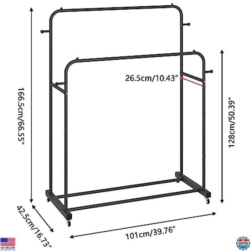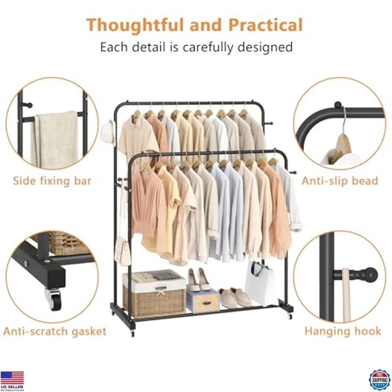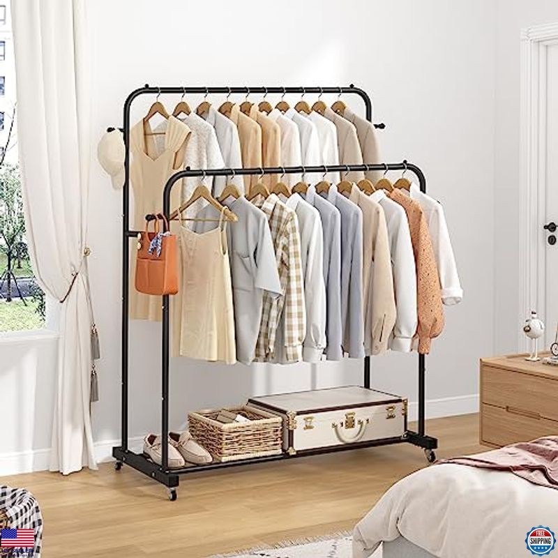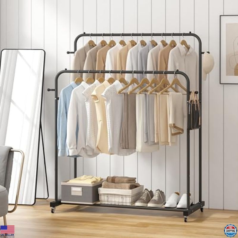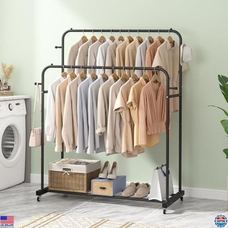 Laiensia Double Rods Garment Rack with Wheels, Clothing Rack for Hanging Clothes,4 Hooks, Multi-functional Bedroom Clothes Rack, Black Description Experience the perfect blend of style and functionality with our premium product. Crafted with attention to detail, this item enhances your everyday life while adding a touch of elegance. Don't miss the chance to own a piece that combines quality and sophistication—grab yours today! Product reference: B0BPGY8GGJ. Features Premium quality craftsmanship Stylish and elegant design Enhances everyday life Attention to detail in construction Combines functionality and sophistication Shipping Free & Fast Shipping: We offer free shipping to most of the USA with a normal delivery time of 3-7 days. However, due to the current situation, additional delivery time (up to 3 weeks) may be required for some items. Alternative Carriers: We may use alternative carriers (e.g., USPS, FedEx, UPS) to ensure your package arrives safely and on time. Due to the use of multiple carriers, we are unable to provide a tracking number automatically. Handling Time: Orders are processed and shipped within 1-2 business days of receiving cleared payment. Shipping Restrictions: Shipping to Alaska, Hawaii, Puerto Rico, Guam, and other US territories may incur shipping charges or delivery restrictions. Please contact us before ordering, or your order can be refunded/cancelled. State Restrictions: Certain items may not be shipped to California due to state regulations. Contact for Tracking Updates: If you require tracking updates or have any concerns about the delivery of your order, please feel free to contact us, and we will be happy to assist you. Return Policy 30-Day Hassle-Free Returns: If you are not completely satisfied with your purchase, you can return the item for free within 30 days of receiving it for a full refund or exchange. Easy Return Process: Contact us, and we will provide you with a prepaid return shipping label and detailed instructions. No Restocking Fee: There are no restocking fees for returns. However, the buyer is responsible for return shipping costs if the return is not due to a seller's error. Refund Processing: Refunds will be processed within 1 business day of receiving the returned item in its original condition. Payment We accept all major credit cards, PayPal, and Apple Pay for your convenience. Your payment information is secure and encrypted to ensure a safe and seamless transaction. Please complete your payment within 3 days of purchase to avoid any delays in shipping. Feedback Your feedback is extremely important to us. We strive to provide the best products and customer service possible. If you are satisfied with your purchase, please take a moment to leave us a positive review. If you have any concerns or issues with your order, please contact us before leaving negative feedback. We are committed to resolving any problems and ensuring your satisfaction. Contact Us If you have any questions or concerns, please feel free to reach out to our customer support team. You can contact us through the eBay messaging system. We are available Monday to Friday, 9:00 am to 5:00 pm EST, and we will do our best to respond to your inquiry within 24 hours. Thank you for supporting our small family business! See product images above for details.