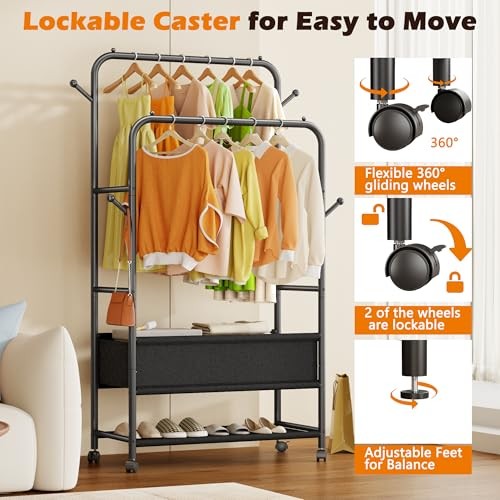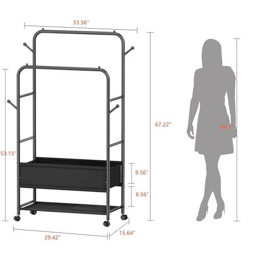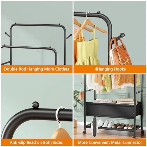 Menu 1. We require immediate payment. 2. We currently accept payment via eBay managed payments only. 3. Once payment is cleared, we will dispatch your shipment within 1-3 business days. Please refer to the "Shipping" tab for more information regarding shipping speed to your destination. Double Rods Clothing Garment Rack with Wheels and Storage Box, Clothing Rack for Hanging Clothes with 4 Hooks, Portable Rolling Closet Wardrobe Organizer for Bedroom, Living Room, Black Product description [Double Storage Space]: The garment rack has 2 hanging rods of different heights. Visual double storage space for easy sorting and putting away of clothes. The small footprint of the product can make full use of vertical space, so say goodbye to the trouble of piling up clothes! [Movable Wheels]: The clothes rack with 4 universal wheels, 2 of which are lockable, you can make it move or stand still as you like, making it easy to move to the yard to dry your clothes, and we also provide 4 adjustable feet to keep your balance even on uneven ground. Meet your diverse needs. [Adjustable Fabric Sotrage Bag]: Adjustable position storage bag underneath the clothes rack, you can place the storage position according to your needs, convenient for you to store folded clothes/shoes/boxes, make your home tidy and orderly. [3-in-1 Multi-functional Design]: 3-in-1 garment rack combines a coat rack, a shoe rack and a cloth rack in one simple and versatile structure, which can be perfectly integrated with bedrooms, living rooms, laundry rooms, entryway ,and can also as a portable closet/wardrobe in clothing shops, rental houses and flats. [Sturdy & Practical]: Clothes racks are made of high quality metal tubes, sturdy and durable, with anti-slip beads on both ends of the double rod to prevent clothes from slipping off. 4 hooks on the side for hanging bags, hats, keys and other items. Side rods can also store belts, scarves, etc. [Easy Assembly, Worry-Free Service]: The clothes rack size: 15.74 "D x 29.52 "W x 67.71 "H, comes with easy to understand instructions and required installation tools for quick assembly. If you have any questions, please feel free to contact us, we will handle it efficiently! PLEASE MESSAGE US IF YOU HAVE ANY OTHER QUESTIONS, AND MANY THANKS FOR READING ALL OF THIS. Copyright ©#. All Rights Reserved.