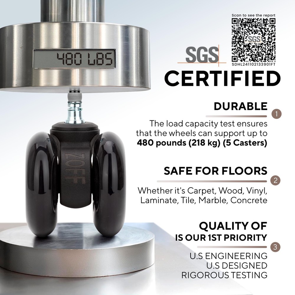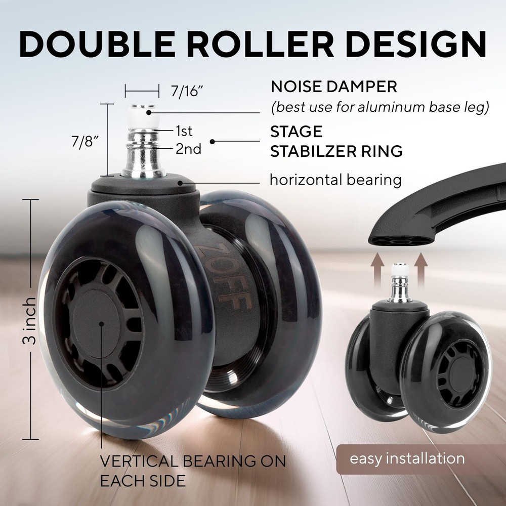 Looking for unmatched quality and performance in office chair wheels? The Double Rollerblade Casters set a new standard, being the only wheels certified by SGS for exceptional durability. Supporting up to 480 pounds across 5 wheels, these innovative casters feature a unique double roller design with both vertical and horizontal bearings for incredibly smooth movement. The advanced noise dampening system includes specialized stabilizer rings and a top damper, ensuring whisper-quiet operation. Safe for all flooring types from delicate hardwood to plush carpet, these casters won't mark or damage your surfaces. Backed by rigorous U.S. engineering and a 365-day warranty, they're built to eliminate the frustration of frequent replacements. Experience the perfect blend of durability, protection, and effortless mobility with casters - the professional choice for reliable office mobility. SGS Certified Performance - These casters are the only wheels to pass rigorous SGS durability testing, supporting up to 480 lbs across 5 wheels. Each caster features a dual roller design with vertical and horizontal bearings for superior stability and smooth movement Advanced Noise Reduction System - Engineered with a specialized noise damper and dual stabilizer rings optimized for aluminum base legs. The innovative DUO rings on the stem reduce vibration and base cavity wear, ensuring whisper-quiet operation during daily use. Multi-Surface Protection - Thoroughly tested for safety on all flooring types including carpet, wood, vinyl, laminate, tile, marble, and concrete. The specialized wheel design prevents scratching and marking while maintaining excellent mobility across any surface. Professional Engineering - Crafted with U.S. engineering expertise and rigorous testing standards. The 3-inch wheels feature a 7/16" stem diameter and 7/8" stem height for perfect fit and stability. Patent-pending design demonstrates our commitment to innovation. Hassle-Free Reliability - Backed by a comprehensive 365-day warranty against manufacturing defects. The durable construction eliminates the frustration of frequent replacements, allowing you to focus on your work without interruption. Not Compatible with IKEA chairs
