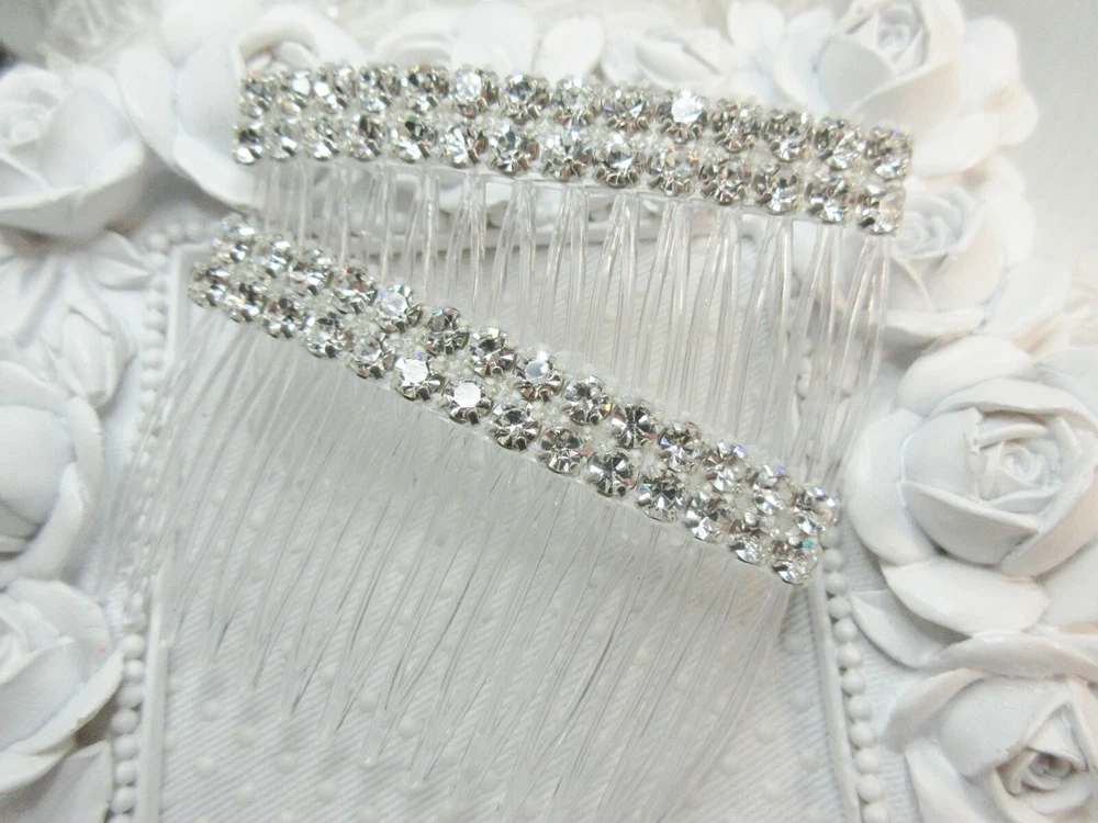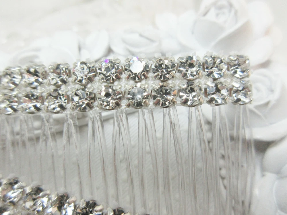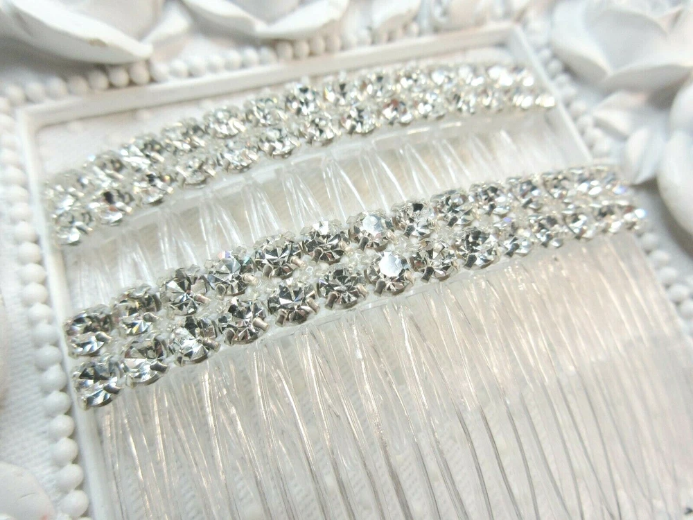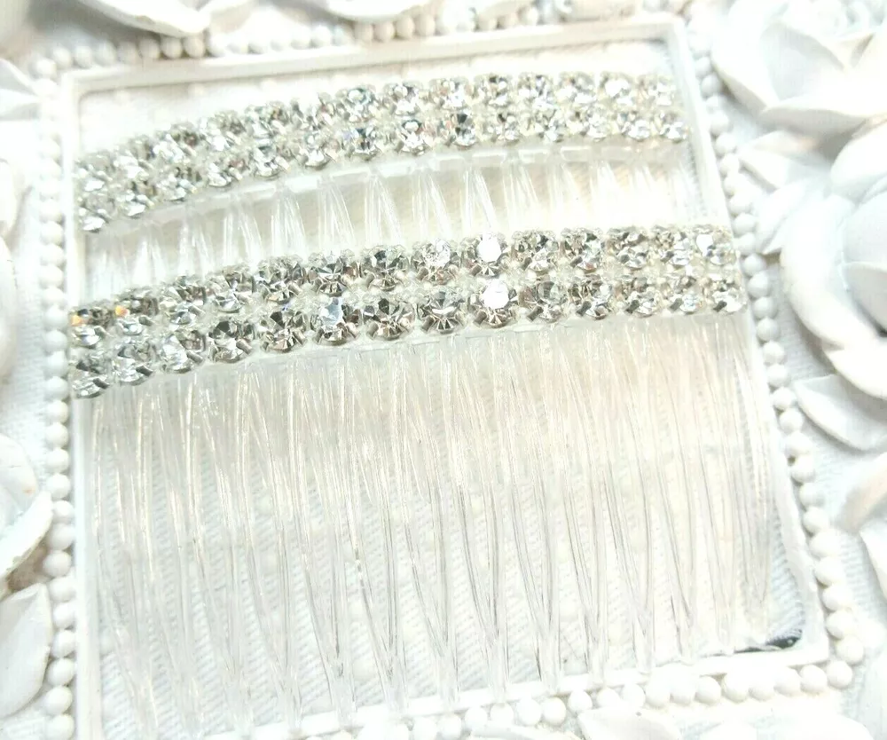 Kittenkat22 ~~~ Welcome to My Store! ~~~ Item Description This listing is for one pair of matching beautiful hair crystal rhinestone hair combs hand made by me. Each hair comb is made of a clear acrylic material and adorned with AAA quality Clear Swarovski crystal elements that are 5 mm each in a double row for extra bling (10 mm wide with two across the width). The crystals are connected by a white thread barely visible when worn. The crystals are set into a rhodium plated base metal (brass) setting and are three dimensional backs not flat. Each comb measures 2 3/4 inches wide by 1 5/8 inches long- from top to bottom (crystals to bottom of the teeth). Perfect for a bride or any special occasion. Comb is not made by Swarovski, no swan logo. I used Swarovski components in making this comb. Brand new and in perfect condition. Sent boxed for protection in shipping. All of my ads and my personal designs are copyright protected. All sales are final! I strive for FIVES in all Feedback categories. Buy with confidence! Terms of Sale Payment : Due at time of sale. Combined Shipping Discount: All items must be paid for in one transaction to take advantage of the discount- see shipping tab for discount. Shipping : Shipping is done via USPS and a tracking number is provided to you free of charge. Make sure your shipping address is correct. I only ship to the address on file at the time of purchase. If you need the item in a hurry please purchase PRIORITY USPS upgrade. Feedback : In the unlikely event there is a problem please contract me first so that I may correct it for you if that is possible- before leaving feedback. Miscellaneous Information : All sales are final, no refunds or exchanges. Be sure to ask all questions before you buy. Your purchase is your nonverbal agreement to these terms of sale. Seller is not responsible for use of any item once in the hands of the buyer or for buyers remorse. All questions are answered within 24 hours or less if possible. See questions section as it may answer any question you might have. I do not work for any company whose items I sell. All handmade items are made by me in my home studio. All items come from a smoke free environment but not pet free (pets are not allowed in my work area). Thank you for visiting my store!