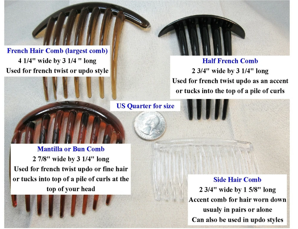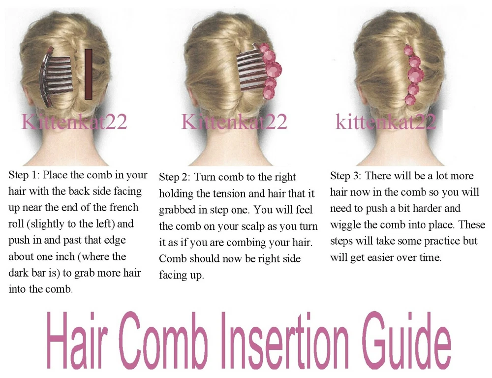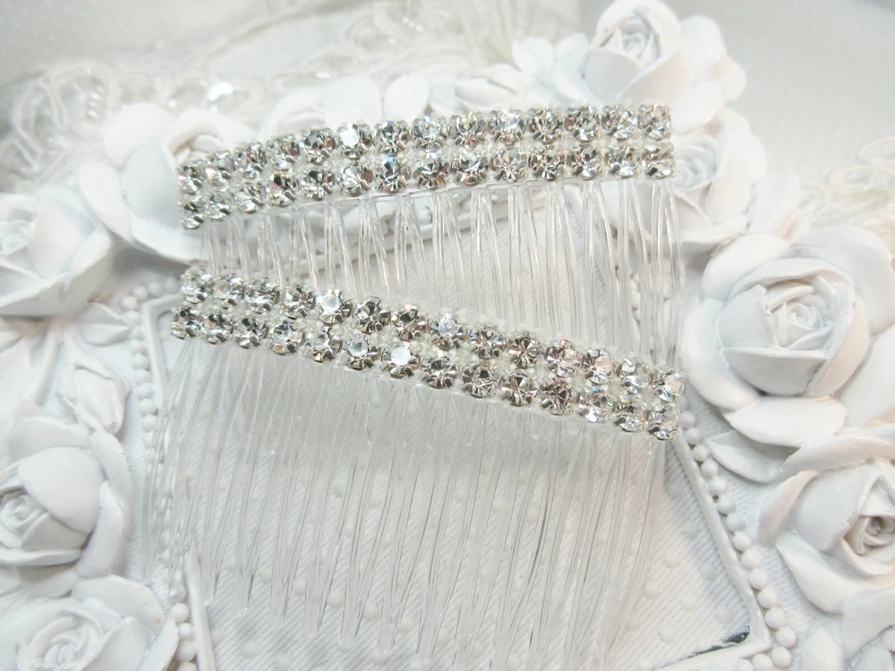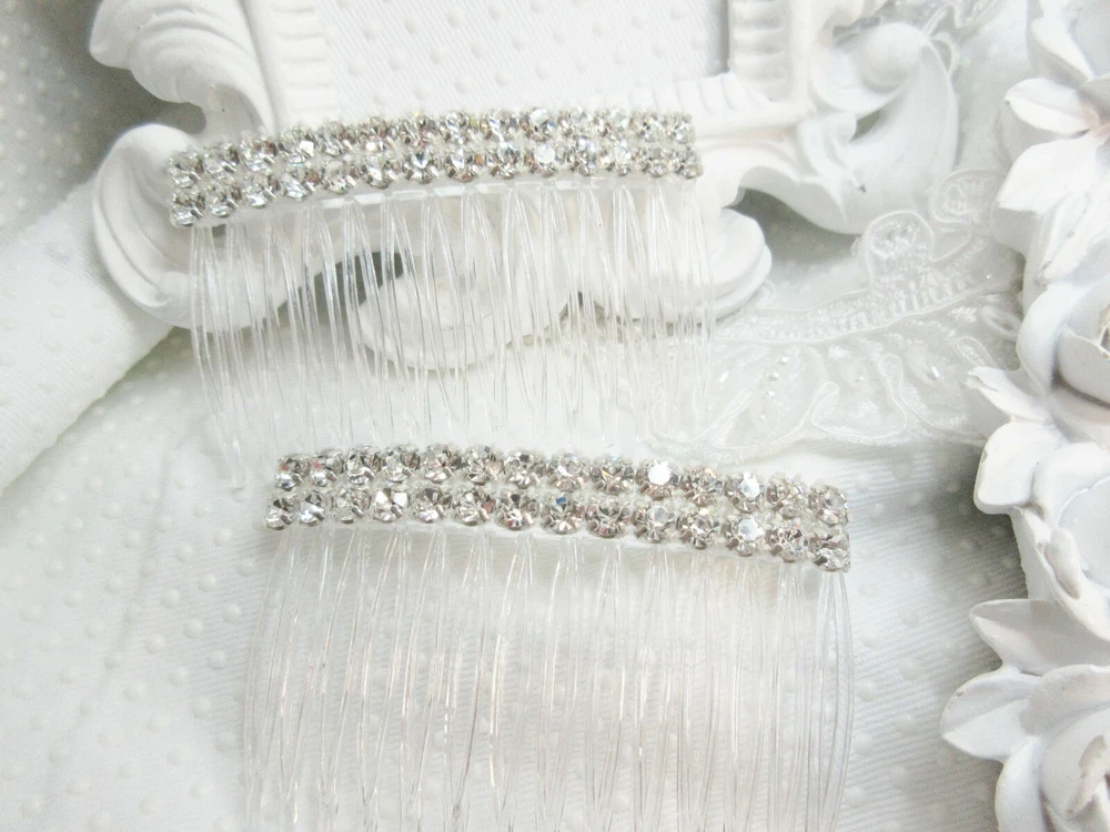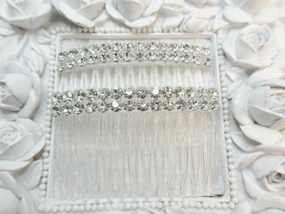 Kittenkat22 ~~~ Welcome to My Store! ~~~ Item Description This listing is for one pair of matching beautiful hair crystal rhinestone hair combs hand made by me. Each hair comb is made of a clear acrylic material and adorned with AAA quality Clear Swarovski crystal elements that are 5 mm each in a double row for extra bling (10 mm wide with two across the width). The crystals are connected by a white thread barely visible when worn. The crystals are set into a rhodium plated base metal (brass) setting and are three dimensional backs not flat. Each comb measures 2 3/4 inches wide by 1 5/8 inches long- from top to bottom (crystals to bottom of the teeth). Perfect for a bride or any special occasion. Comb is not made by Swarovski, no swan logo. I used Swarovski components in making this comb. Brand new and in perfect condition. Sent boxed for protection in shipping. All of my ads and my personal designs are copyright protected. All sales are final! I strive for FIVES in all Feedback categories. Buy with confidence! Terms of Sale Payment : Due at time of sale. Combined Shipping Discount: All items must be paid for in one transaction to take advantage of the discount- see shipping tab for discount. Shipping : Shipping is done via USPS and a tracking number is provided to you free of charge. Make sure your shipping address is correct. I only ship to the address on file at the time of purchase. If you need the item in a hurry please purchase PRIORITY USPS upgrade. Feedback : In the unlikely event there is a problem please contract me first so that I may correct it for you if that is possible- before leaving feedback. Miscellaneous Information : All sales are final, no refunds or exchanges. Be sure to ask all questions before you buy. Your purchase is your nonverbal agreement to these terms of sale. Seller is not responsible for use of any item once in the hands of the buyer or for buyers remorse. All questions are answered within 24 hours or less if possible. See questions section as it may answer any question you might have. I do not work for any company whose items I sell. All handmade items are made by me in my home studio. All items come from a smoke free environment but not pet free (pets are not allowed in my work area). Thank you for visiting my store!