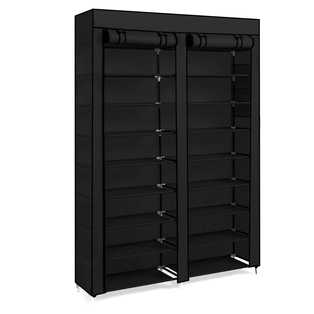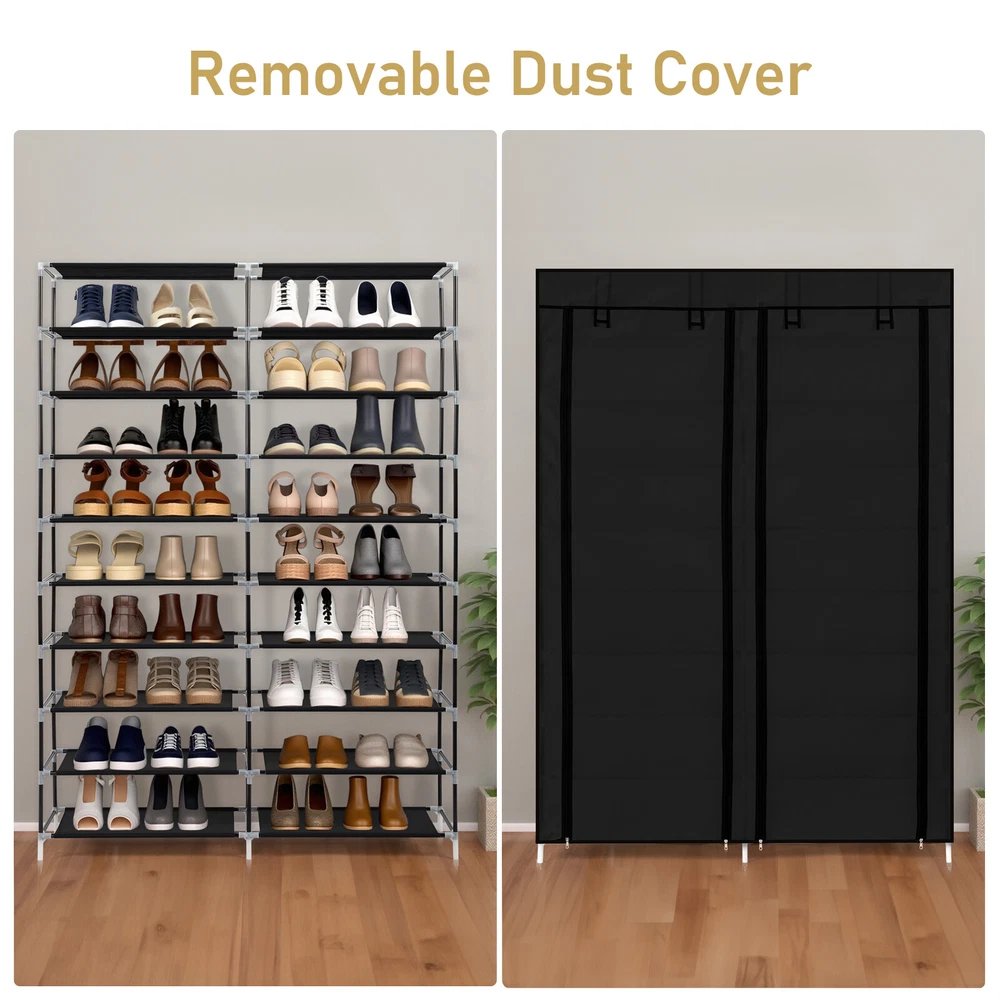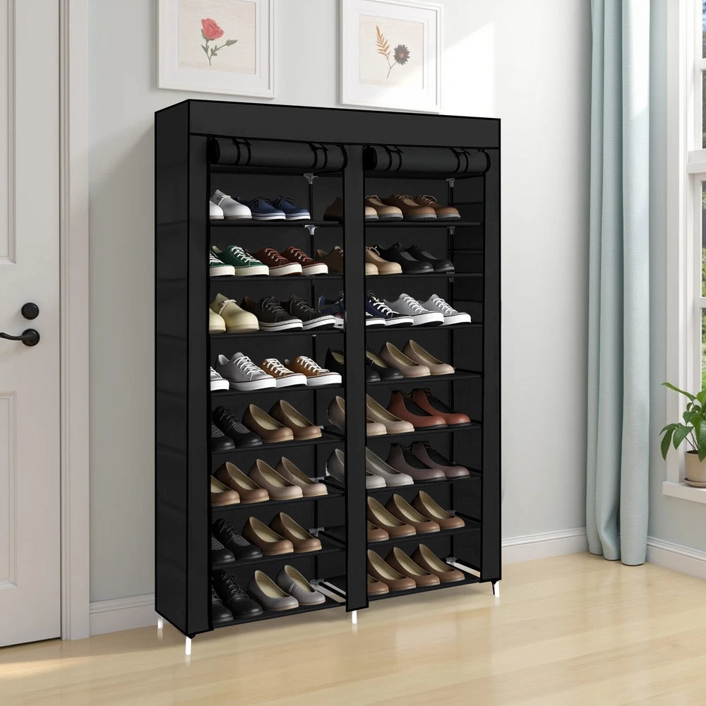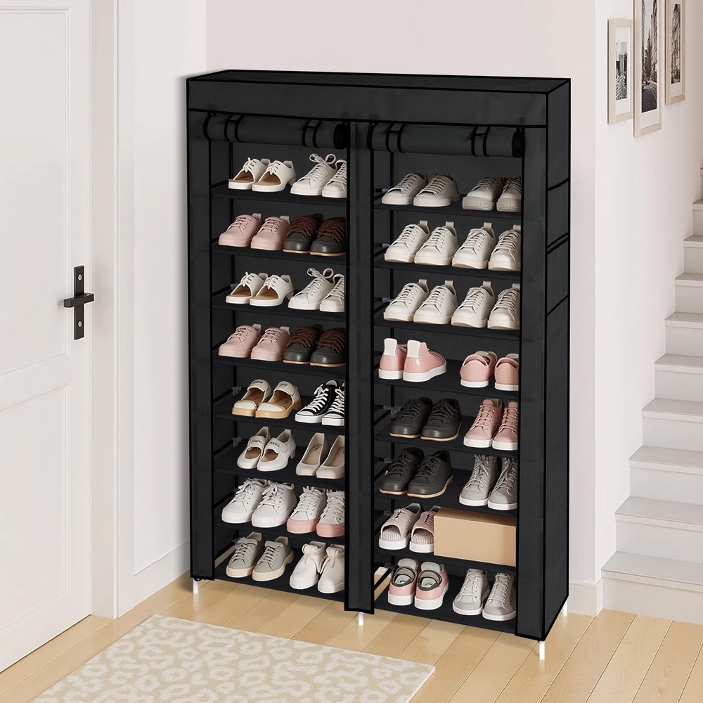【Key Features】 •Entryway Storage: This double row, 10-tier shoe cabinet is designed to provide ample storage space right at your entryway, keeping footwear neatly organized and out of sight. •Home Storage Solution: Perfect for home use, offering a practical way to manage shoes and maintain a tidy living environment. •Space-Saving Design: Compact yet spacious, the shoe cabinet efficiently utilizes vertical space without taking up too much floor area. •Stylish Appearance: The sleek black finish adds a modern touch to any interior decor while being unobtrusive. •Durable Construction: Built from iron pipes for stability, combined with durable non-woven fabric and plastic components for a lightweight yet sturdy structure. 【Specification and Dimensions】 •Dimensions: The shoe cabinet measures 160.00cm (height) * 115.00cm (width) * 30.00cm (depth). •Total Weight: The entire shoe cabinet weighs only 2.6kg, making it easy to move and place wherever needed.