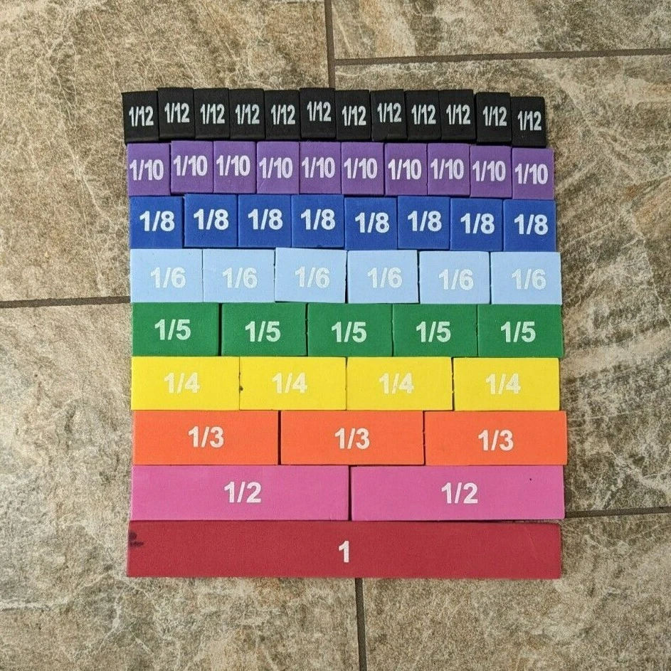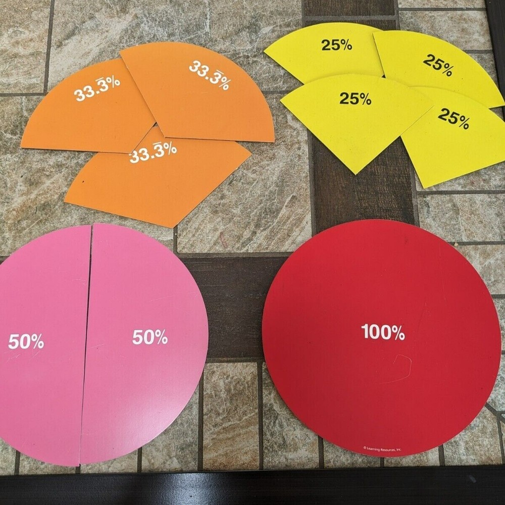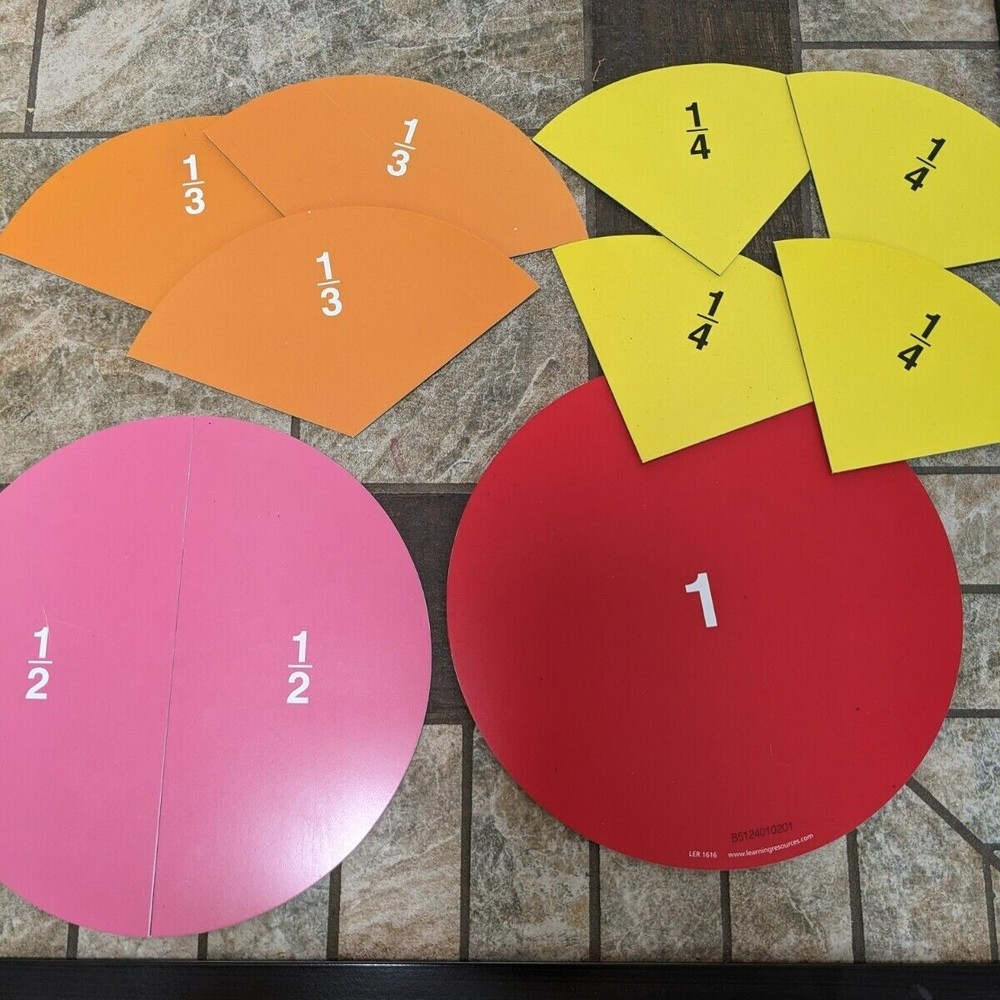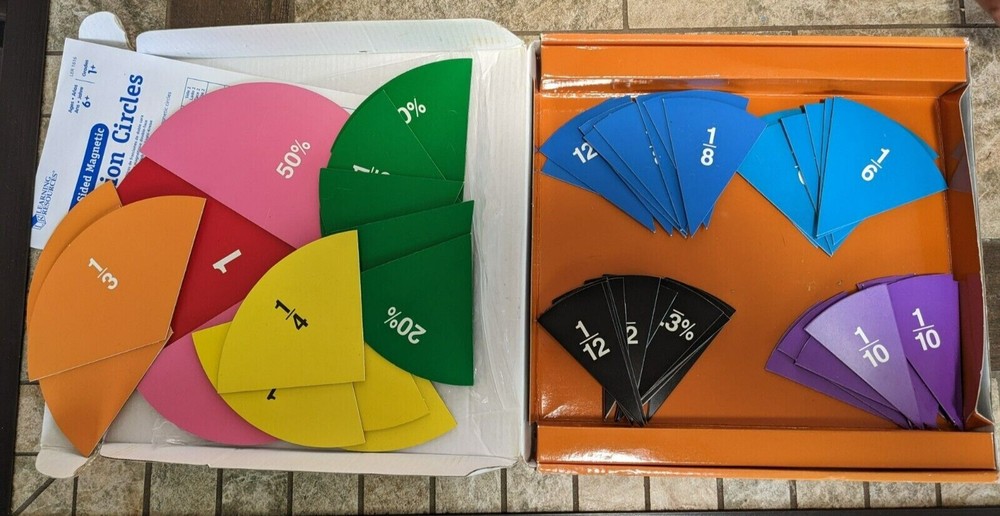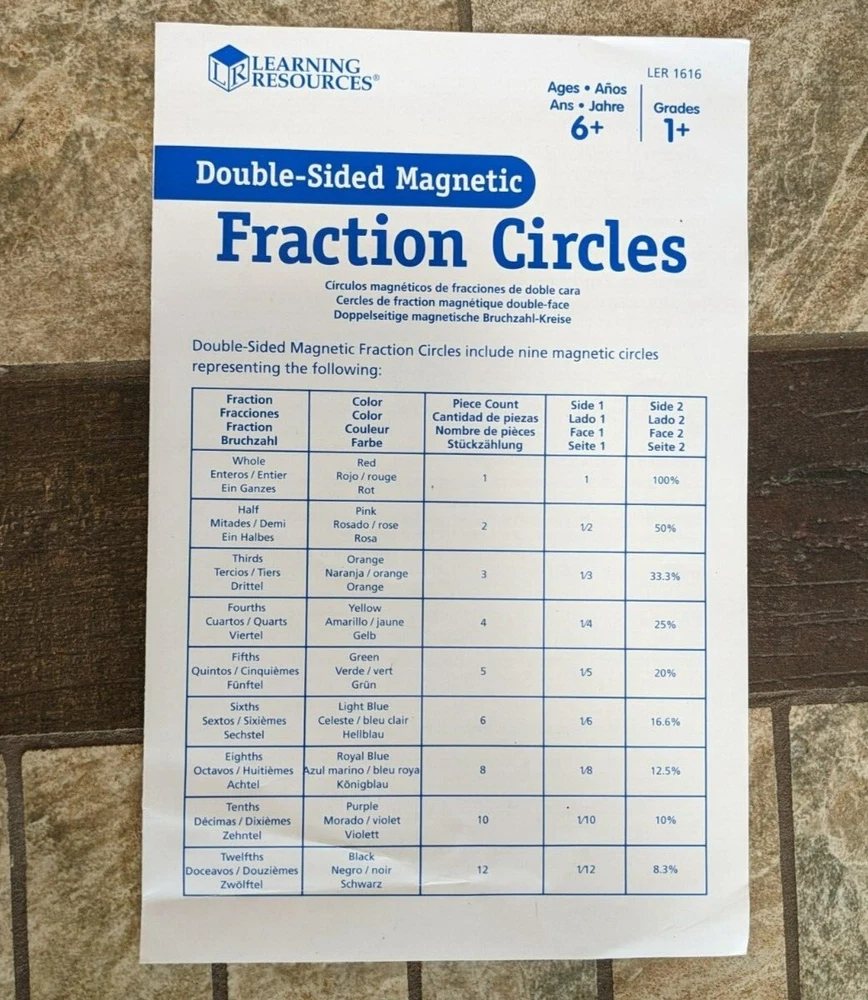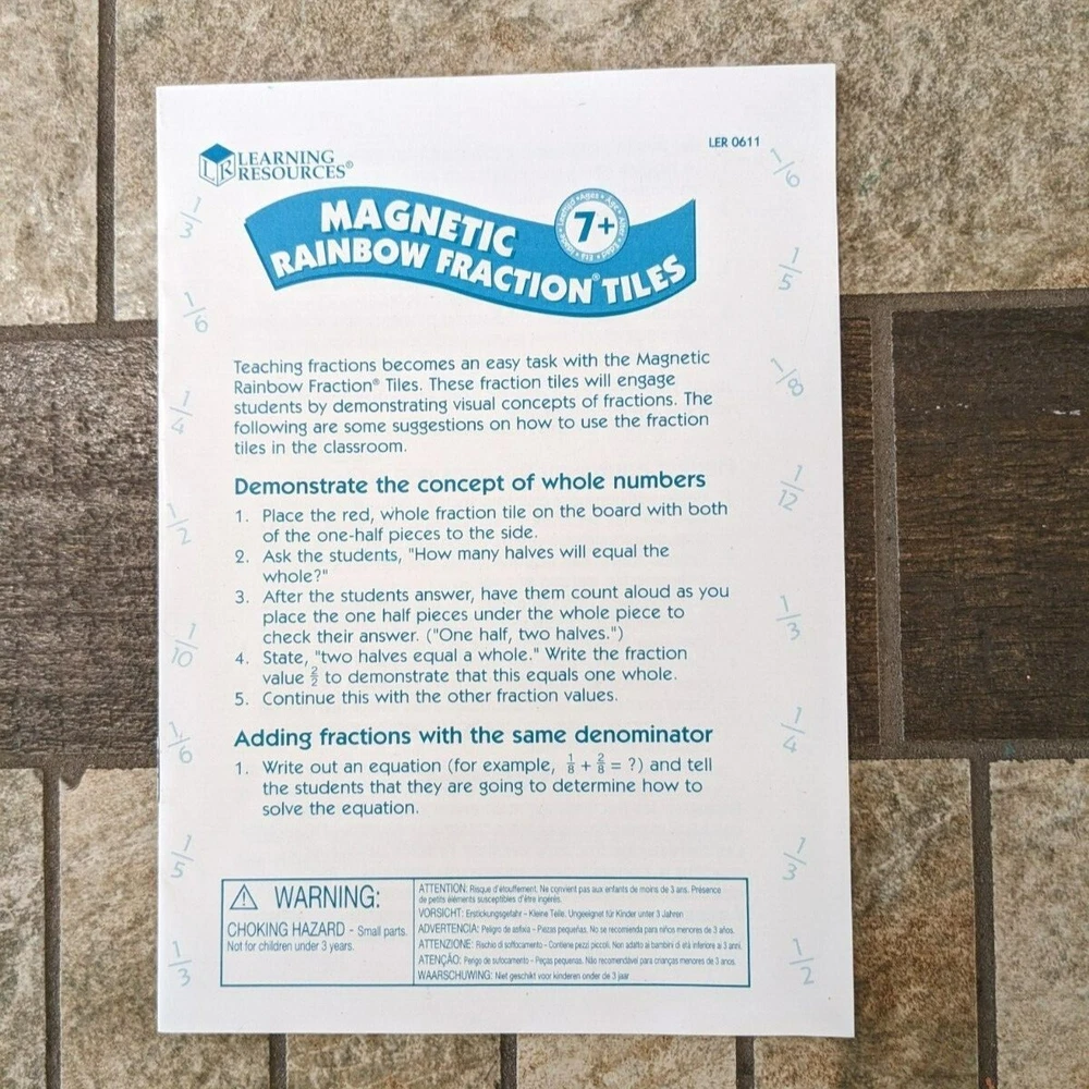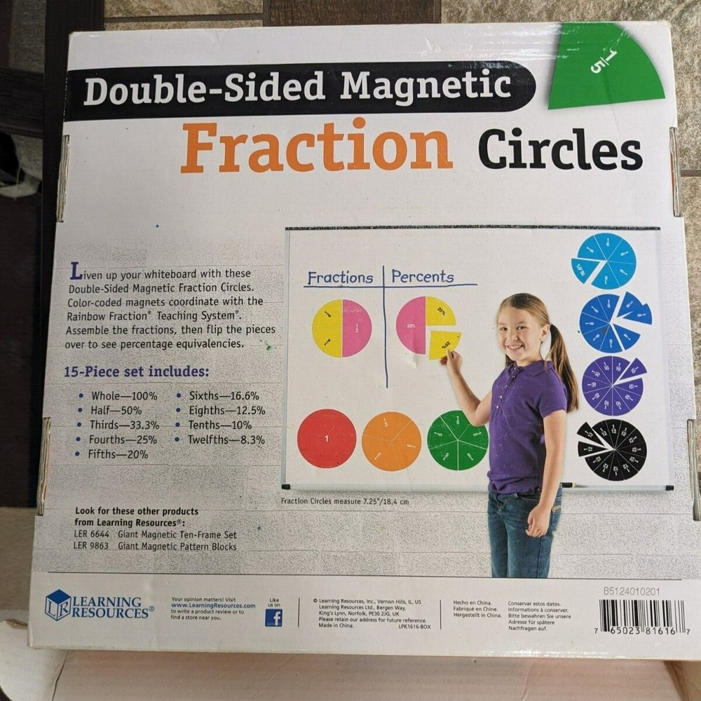 This set of magnetic fraction circles and tiles by Learning Resources is a must-have for any math enthusiast, whether you're a student or a teacher. With bright and bold colors, these manipulatives are perfect for teaching fractions in a fun and engaging way. The circles are double-sided, with one side showing the fraction and the other side showing the corresponding visual representation, making it easy to understand and visualize fractions. The tiles are also magnetic, allowing for easy demonstration on a whiteboard or other magnetic surface. The set is recommended for ages 5 and up and is perfect for both classroom and homeschool use. Made in China, this educational toy is sure to be a hit with children and adults alike. Take advantage of this reduced price and add this set to your collection today! Double Sided Magnetic Fraction Circles and Magnetic Rainbow Fraction Tiles. Fraction Circles are double sided, includes fraction and percent value. Magnetic Rainbow Fraction Tiles includes Fractions, are made of Foam and Magnets Used, but in Great Condition No bends, small mark on fraction tile for 100%, otherwise no other marks, no tears or rips in instruction booklet Box has obvious signs of wear, but still is usable.