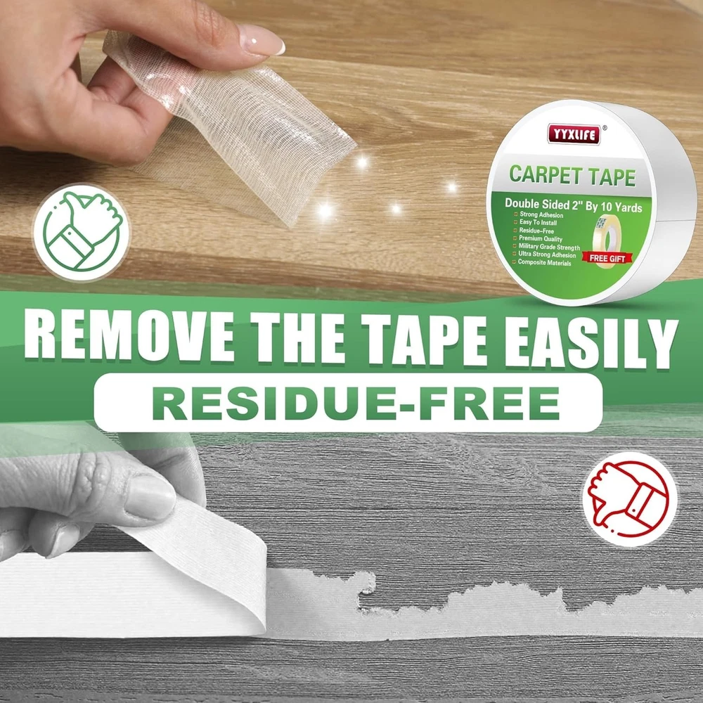 Double Sided Removable Rug Tape - Carpet Adhesive for Hardwood Floors,Non Slip Anti Curling Floor Tape for Area Rugs,Mats,Carpets - No Residue Strong Hold for Tile, 2Inch x 10Yards,White ULTIMATE HOLDING POWER: Experiencing the market-leading adhesion with our Heavy Duty Double Sided Rug Tape! Being designed to firmly secure rugs, carpets, and runners; Being the strongest anti-slip solution available. Easily cut to size for a perfect fit to keep your floors safe and clutter-free. RESIDUE-FREE & DAMAGE-FREE REMOVAL: Enjoying peace of mind with our unique adhesive. It bonds powerfully yet peels away cleanly when needed, leaving no marks or sticky residue behind. The convenient paper liner makes application and removal by effortless, so that you can change your decor or relocate rugs hassle-free! ENHANCED SAFETY FOR YOUR HOME: Reducing slips and trips with our reliable rug tape. It provides crucial stability on hardwood floors, tile, vinyl, and more. Perfect for high-traffic areas such as entries, stairs, and bedrooms, it can help create a safer environment for your family. VERSATILE SURFACE COMPATIBILITY:Where can you use it? Almost anywhere! This tape works effectively on tile, vinyl, concrete, wood, cement, as well as most other indoor/outdoor hard surfaces and carpet backings – all without causing damage. UNMATCHED PERFORMANCE & SATISFACTION SATISFACTION GUARANTEE:We firmly believe in the extreme holding power of our multi-purpose carpet tape. It is designed to stay put until you decide to remove it. Go beyond rugs: secure carpets, doormats, craft projects, etc! If you are not satisfied, please contact me for support. NOTE:Which carpet types are more suitable?Adhering best to fabric-backed carpets (cotton, felt, tufted, jute). Avoiding using on anti-slip carpets with rubber, PVC, or silicone backings. These materials have lower surface energy, compromising tape adhesion.