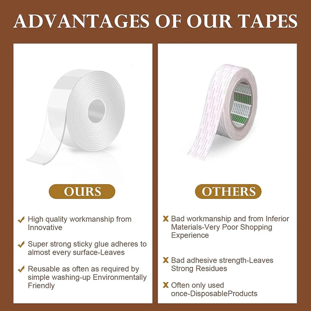 Double-sided tape is designed to be the most durable and strongest tool for sticking objects. Hang photos and posters, stick objects on the wall, and fix carpet mats or decorations in your home, office, or even your car. Easy to use: 1. It is easy to cut to any size! 2. It is ease stick to any surface! Removable and no traceless: It is easy to remove without damage your surface and no leaving a trace. The Right Method to Tear off the Our Tape: Slowly remove the item from the tape at time shake the item up and down or left and right. Then slowly pull it up from the bottom to tear off the tape from the wall. Important hint: 1. Do not use on uneven surfaces, such as brick walls, stone walls, whitewashed walls, greasy and wet surfaces, lime walls, rough surfaces, and granular surfaces.because the paint may be torn off when removing the tape or hanging heavy objects. 2. Please do not use it on powdered/wet/dirty/uneven walls and rough surfaces. These surfaces may reduce the viscosity of the double-sided tape. 3. After sticking the double-sided tape, please press the item hard for 60 seconds to achieve the best adhesion between the item and the tape. 4. If the object to be hung is heavy, please use double-sided tape to cover more surfaces. 5.in a normal cool environment,avoid direct sunlight. If the tape is directly exposed to sunlight for a prolonged period, the colour of the tape’s surface may turn yellow. However, yellowing of the tape will not affect the normal use of the product,the adhesive properties of the tape will perform properly in use Specification: Material: Acrylic material Length: 10 feet*4 Width: 0.8inch Thickness: 1mm Color: transparent Superb adhesion: Double-sided tape provides instant bonding, no or drying stage required. High bonding ability for various surfaces Tear off without marks: Transparent tape is easy to remove and leaves no residue or damage on smooth and sturdy surfaces Reusable: Tape can be cleaned with water, regaining stickiness after washing and drying. Suitable for continuous use year : High-quality tape, reusable and durable. us for any product-related inquiries or concerns