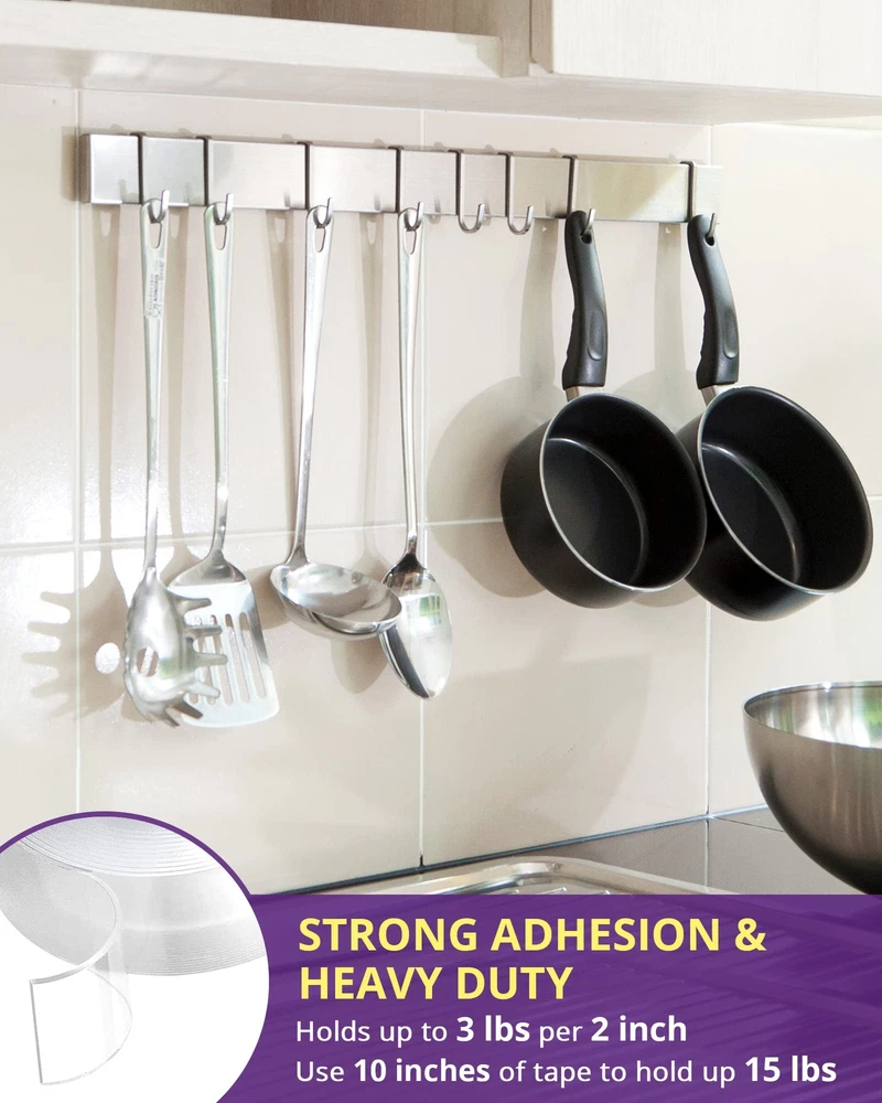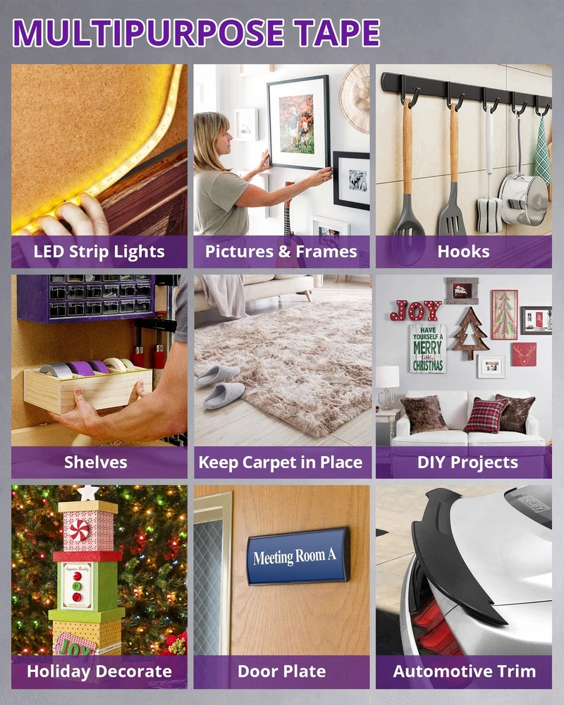 Super Strong Tape: Made of premium acrylic material. Holds up 3 Ibs per 2 inches, use only 10 in of tape to hold up to 15 lbs. This industrial strength heavy duty mounting tape allows bonding more effectively with a variety of surfaces, ideal for your DIY projects Removable & No Residue & Traceless: This removable two sided tape leaves no residue, easy to remove with no damaged surfaces. The transparent looks can make the tapes well hidden, they are nearly invisible, which can always keep your DIY projects clean and pretty Perfect Tools-free Mounting Solution: The sticky tape is easy to install, just peel off the tape and stick it to the surface. And it is easy to reposition when it’s not fully compressed and repositioning will not reduce adhesion durability. No drilling, no screwing, no gluing. Tough, weatherproof, works indoors and outdoors Multipurpose Tape: This 2 sided tape can be used for a variety of surfaces, such as signs, nameplates, hooks, scrapbooking, cards making, carpet fixing, wall decor like LED strip lights installation and posters/picture frame hanging, doors and windows decoration for home, school and office, automotive trim, etc Warm Tips: For maximum bonding strength, before applying the tape to surface, please clean with rubbing alcohol to remove grime and dust to allow the tape to bond to the surface. Please do not hang heavy objects immediately after tape applying and be patient for another 72 hours. Not suggested for wallpaper, paint wall, powder wall, fabrics