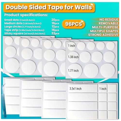 Return Policy Fast Delivery Trusted seller Double Sided Tape for Walls, Picture Hanging Strips Removable Mounting Dots Adhesive Heavy Duty, Removable for Art Craft, Decoration, Party Supplies, Multipurpose Product Description Strong adhesive acrylic double sided tape: This thin double-sided adhesive tape is very suitable for hanging and stick small and medium-sized objects because of its excess adhesive force. You can use multiple tape strips combinations to ensure that things do not fall off No residue: This adhesive mounting squares are suitable for smooth and flat surfaces such as plastic, glass, metal, fabric, wood, ceramic tiles For hanging stuffs, making crafts, party decoration: Multipurpose adhesive tape, you can use it to hang pictures, posters, balloons, socket; You can also stick art crafts, mirrors, and carpets. Tape for home, office, school, party, wedding, decoration and organization Removable, washable, reusablz: This transparent adhesive tape strip can be reused. You only need to rinse it with water, and then wait for it to dry to regain its stickiness T are 48 circles, 16 strips, and 32 squares, a total of 96 pieces. You can use multiple tape strips combinations to ensure that things do not fall off Shipping Returns Payment Shipping Shipping is FREE to all addresses other than APO/PO boxes in the lower 48 states. All our stock ships from US-based warehouses. Shipped via USPS or UPS (depending on location and package weight) Unless stated otherwise, all orders will ship within 24-72 hours of your payment being processed. Check our feedback to see the great reviews of FAST shipping we offer. Returns Seller does not accept returns Payment We currently accept payment via eBay managed payments only. Once payment is cleared, we will dispatch your shipment within 1-3 business days. Please refer to the "Shipping" tab for more information regarding shipping speed to your destination.