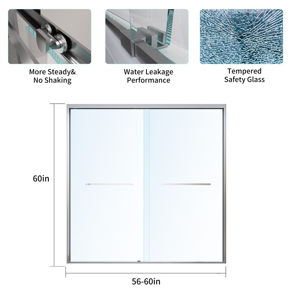 ✨ Premium Double Sliding Soft-Close Shower Door | Brushed Nickel | 6mm Tempered Glass | Easy Installation | 1-Year Warranty & 30-Day Free Return ✨ Upgrade your bathroom with our modern, space-saving double sliding shower door—designed for both style and functionality, perfect for any contemporary bathroom decor. Crafted with high-quality materials and thoughtful details, this shower door keeps your bathroom dry, safe, and looking sleek for years to come. Key Specifications Feature Details Origin China Color/Finish Brushed Nickel (matte, corrosion-resistant) Material Stainless Steel (main structure) + 6mm SGCC Tempered Glass (panel) Style Modern & Minimalist Application Bathroom (ideal for tub/shower combos or standalone showers) Assembled Dimensions Length: 60.00 inches | Height: 60.00 inches | Width: Not Applicable Product Weight 94.58 lbs Package Dimensions Length: 62.80 inches | Width: 36.22 inches | Height: 2.76 inches Package Weight 103.40 lbs Product Highlights Space-Saving Double Sliding Design : 56-60 inches in length and 60 inches in height, with a brushed nickel finish that complements any modern bathroom. The sliding mechanism saves valuable floor space (no outward-swinging door) and features a sturdy metal profile that mounts securely to the wall—creating a tight water barrier to prevent leaks and keep your bathroom floor dry. Sleek, practical, and designed to maximize bathroom space utilization. Tool-Free Friendly Easy Installation : No professional plumber needed! Each shower door comes with a complete package including ALL necessary hardware and components. We’ve also included a clear, step-by-step installation guide (with simple instructions and component illustrations) to make setup smooth and hassle-free—even for beginners. Safe & Durable 6mm Tempered Glass : Made with 1/4" (6mm) SGCC-certified tempered glass, this shower door offers superior impact resistance and safety—if broken, it shatters into small, rounded pieces (not sharp shards) to protect you and your family. The clear glass panel is easy to clean and maintain (resists water spots and stains), keeping your shower looking fresh and tidy with minimal effort. High-Quality Brushed Nickel & Stainless Steel : The main structure is crafted from lightweight yet durable stainless steel, paired with a sophisticated brushed nickel finish. This combination delivers excellent corrosion and oxidation resistance—perfect for humid bathroom environments—ensuring long-term stability, durability, and no deformation over time. The brushed nickel finish also adds a touch of elegance to your bathroom decor. Soft-Close Function : The double sliding doors feature a smooth soft-close mechanism, preventing slamming and reducing noise—ideal for busy households or late-night showers. It also extends the life of the door by reducing wear and tear on the frame and hardware. Warranty & Return Policy (Buy with Confidence!) 1-Year Manufacturer Warranty : We stand behind our product quality! Enjoy a 1-year warranty against manufacturing defects (including hardware and glass). If you encounter any issues with your shower door within 1 year of purchase, we’ll provide free replacement parts or repair services. 30-Day Free Return & Exchange : Not satisfied with your purchase? No problem! You can return or exchange the shower door within 30 days of delivery, free of charge (subject to our return policy—items must be in original packaging and unused). We want you to love your new bathroom upgrade! Why Choose Our Double Sliding Shower Door? It’s the perfect blend of style, safety, and convenience—designed to transform your bathroom into a modern, functional space. With high-quality materials, easy installation, and our risk-free warranty/return policy, you can buy with total confidence. 📦 Fast Shipping | 🛠️ Easy Installation | 🛡️ 1-Year Warranty | ✅ 30-Day Free Return