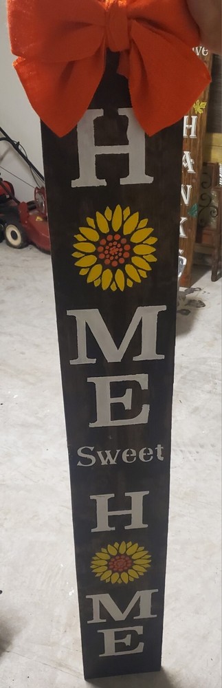 Size: one size Item Length: 60 Personalize: No Care Instructions: Clean with Damp Cloth, Easy Care Product Dimensions: 60 x 9 x 1 Customized: No Color: Brown Material: Wood Country/Region of Manufacture: United States Orientation: Vertical EAN: Does Not Apply Subject: Home Sweet Home Additional Parts Required: No Theme: Art, Floral & Garden, Flowers Style: Farmhouse Item Height: 60 UPC: Does Not Apply Features: Decorative, Hand Painted, Indoor, Outdoor, Rusted Look, Waterproof Customer Reviews: 4.3 out of 5 stars Handmade: Yes Room: Porch, Foyer, Entryway, Indoor/Outdoor, Outdoor, Outside, Patio, Sunroom Pattern: Sunflower Item model number: does not apply Brand: Handmade Mounting: Free Standing Item Width: 9 Manufacturer: handmade Finish: Semi-Gloss MPN: Does Not Apply Character: sunflowers Type: Sign Shape: Rectangular gtin13: Does Not Apply Battery Type: none Engraved: No Vintage: No