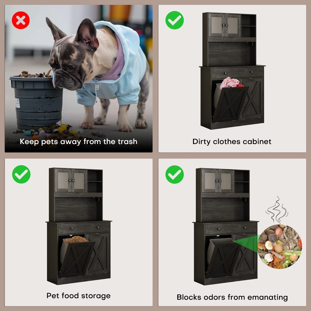 【Ample Storage Space】 This tilt out trash can cabinet features a top storage area, storage shelves, and 2 storage drawers that allow you to neatly display or store kitchen accessories or essential cooking tools, keeping them easily accessible. In the middle, you will find a generous storage cabinet surface that provides ample space for various kitchen appliances or essentials, such as a microwave, a coffee maker or a toaster . This central area acts as a convenient workspace, making meal prep and kitchen tasks more efficient. 【Hidden Trash Can Cabinet Design 】 This kitchen trash can storage cabinet features a hidden design for the trash cans, ensuring that unsightly waste is discreetly concealed. This innovative approach not only keeps your kitchen looking tidy and organized but also prevents odors from escaping, ensuring a fresh and clean atmosphere in your cooking space. Each storage cabinet can hold up to 10 gallons of trash cans. 【Versatile Use】 This multi-purpose storage cabinet is not limited to just trash cabinet. It can effortlessly accommodate a laundry basket for dirty clothes or serve as a food storage bin for your pet's supplies. Its versatility makes it a valuable addition to any home, adapting to your needs with ease. 【Sturdy Construction】 Crafted from a high-quality MDF board, this garbage can cabinet boasts a robust and solid structure. T he combination of materials ensures long-lasting durability, providing you with a reliable storage solution that can withstand the daily demands of a busy kitchen. 【2 AC Outlets 125V/12A】 Our cabinet is equipped with 2 AC outlets, 1 Type C port and 1 USB port, allowing you to conveniently and safely use electrical appliances without worrying about a shortage of outlets or their distance. On Jan 24, 2025 at 00:09:14 PST, seller added the following information: