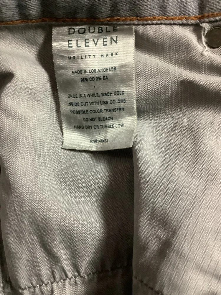 Title:Double eleven Utility Mark Men's size 34 x 32 measured Grey denin Pants Made in Los Angeles. Size: 34 x 31.5-32 Condition: Great condition, minimal wear noted with slight darker pigmentation noted on button area above zipper. Stretch and comfortble Item previously used or worn. Please review photographs, we do our best to describe, measure and show any imperfections if noted. Items kept in clean, smoke free environment. We offer 30 day returns for unused item. Please notify us of concerns or questions We ship USPS Ground advantage, within 1-2 days, unless specified or requested prior to shipping.