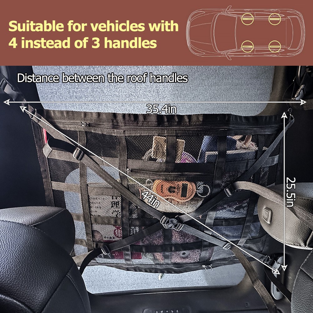 Description: Made of high quality polyester, with good breathability and durability. Double-layer net, large capacity, can accommodate a variety of light products, clothing, daily necessities, etc., saving space inside the car. Zip closure, items will not move. 4 buckles for easy connection to the roof rail, sturdy and secure. It can also be used as a storage bag in the trunk. Suitable for most vehicles. Specs: Item Name: Car Roof Storage Bag Material: Polyester Mesh Cloth Color:Black Features: Easy to install, durable, save space Size: 35x25 inches Package includes: 1 x Car Roof Storage Bag