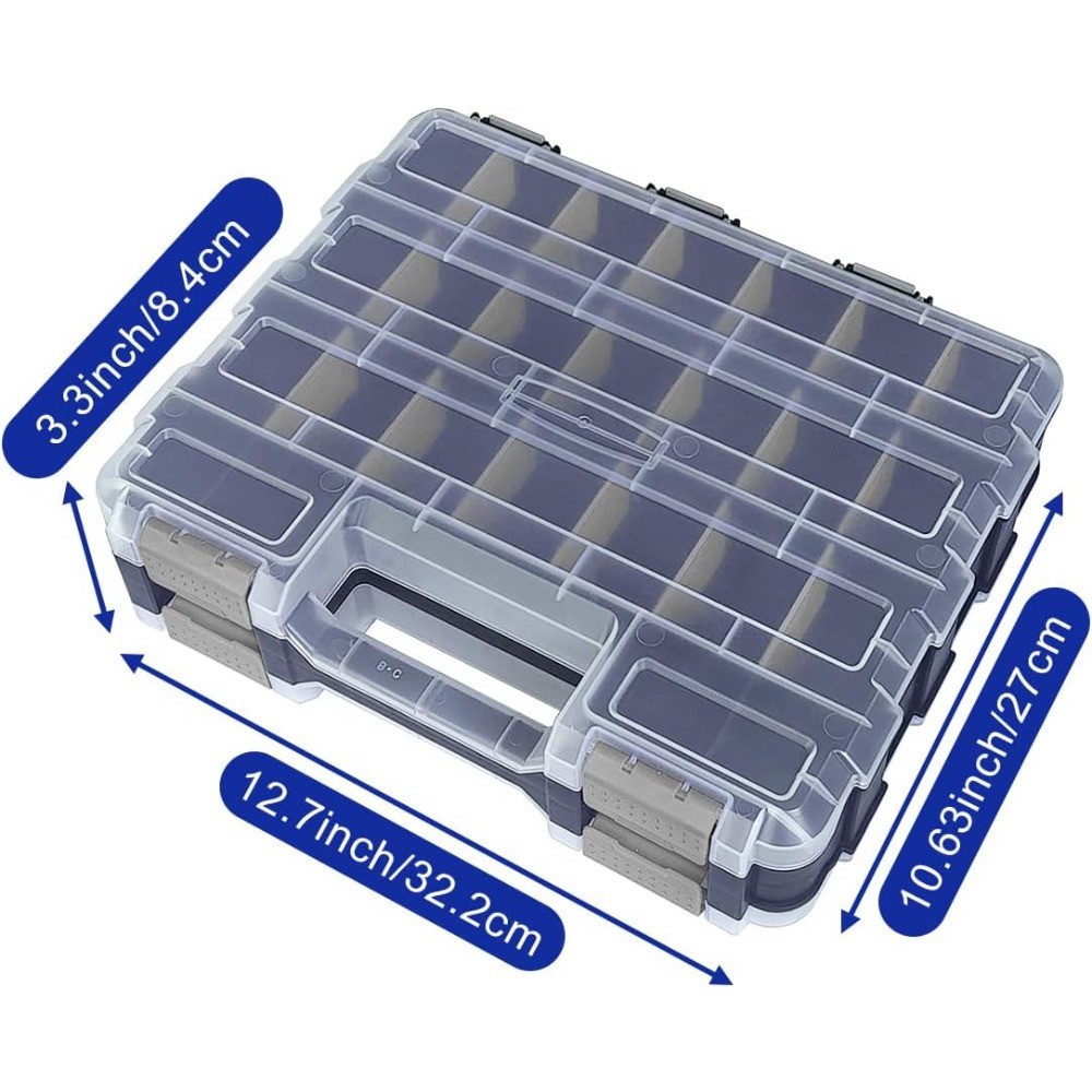 Premium Materials: Hardware storage organizer made of durable and heavy duty plastic material, these tool box are lightweight and portable for home or travel use, easily store it in your garage, closet, shed, or vehicle Design: Grey safety clasp and compartment, black body, perfect blend of colors. It is easier to identify the tools or screws inside with a transparent lid, help you find the right parts quickly and efficiently. Great for personal or professional use Multiple Use Options Parts Organizer: 50-Compartment Double Sided Organizer with removable dividers of this organizer allow you to extend your garage storage options, declutter a storage cabinet, carry fishing lures, or Screws, Bolts, Nails, Beads, Jewelry. All removable dividers are easily slide on and off to customize the storage space Locking Latches: This screw organizer box has 4 Locking Latches, the powerful lock device can fix it in the locked state to prevent damage caused by falling when everything needs to be placed correctly.