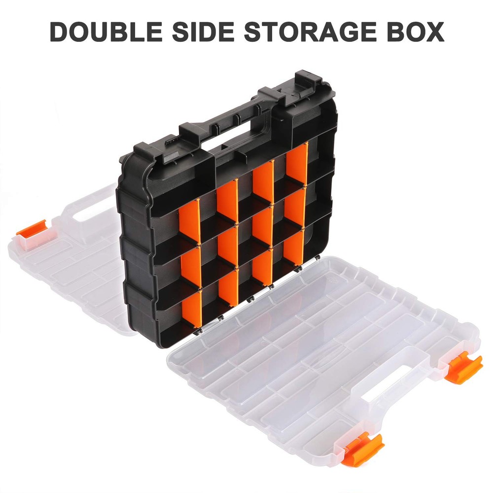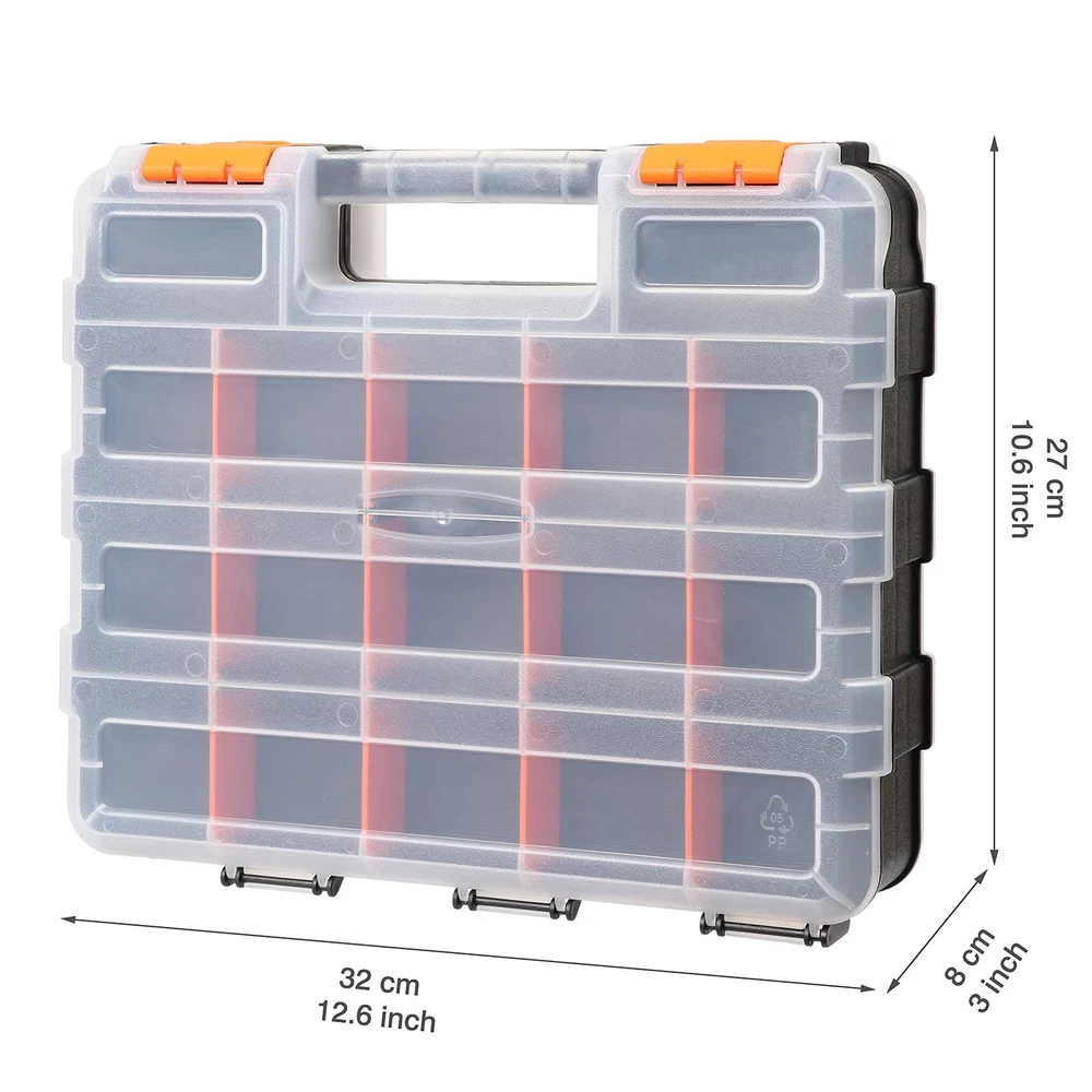 Made of durable and heavy duty plastic material. Double side design with professional looking. An attractive color combination in black body, clear lids, orange closure and divider pieces Including total 24 removable dividers and 4 fixed sections. All removable dividers are easily slide on and off to customize the storage space. The fixed sections add an extra space for special need Features the transparent cover allows you to see everything at a glance. Two secure latches can open and close smoothly to prevent the inner items fall off while carrying. The top handle can easy to carry the storage organizer This handy and versatile container is perfect for parts, fasteners, screws, nails, nuts, bolts, electrical connectors, hair accessories, bead storage, fishing tackle, and various other smaller construction items Approximate outer box dimensions 12.6” L x 10.6” W x 3” H, approximate adjustable compartment size 2.56” L X 2.36” W