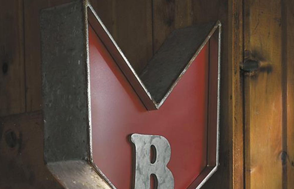 Bar Lighted Marquee Point the way to the bar with this marquee sign! The two-sided giant arrow sign sports BAR graphics, distressed steel, and three bright LED bulbs. It's powered by two AA batteries (not included) and measures 10 in. x 30 in. Great man gift for man cave , game room , or bar. Fast and Free Shipping!