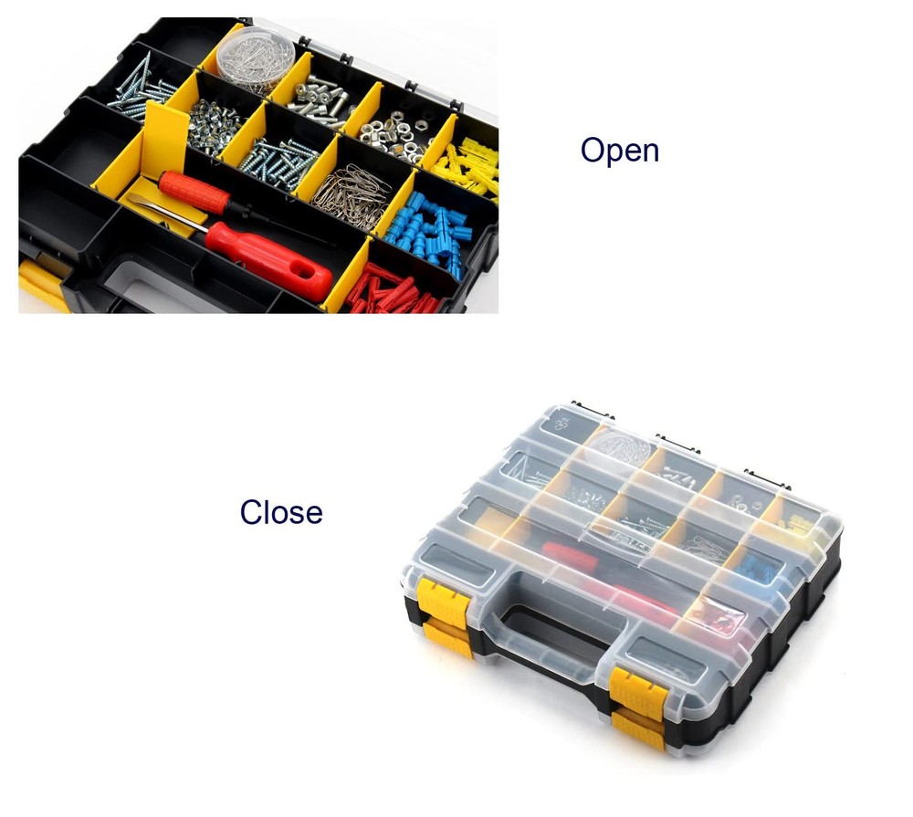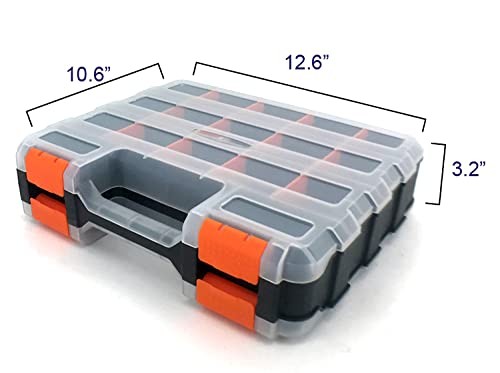 Double Sided Small Parts Tool Box Features Double side with 34 compartments, all removable dividers are easily slide on and off to customize the storage space. The fixed sections add an extra space for special need. Made of durable and heavy-duty plastic material. Black orange mix color body, transparent lids, orange closure and divider pieces. With the robust latch system keeps the organizer locked down and the storage box tightly sealed. The transparent cover allows you to see everything at a glance. The top handle can easy to carry the storage organizer. This handy and versatile container is perfect for parts, fasteners, screws, nails, nuts, bolts, electrical connectors, hair accessories, bead storage, fishing tackle, and various other smaller construction items. Production Specifications Material: PP Color: Black + Orange Size: 12.6" x 10.6" x 3.2" Compartments measure approximately 2.6" x 2.4" What’s in the box 1 x Components Storage Box Double side design with 17 whole compartments. All removable dividers are easily slide on and off to customize the storage space. The fixed sections add an extra space for special need The tool storage box is made of eco-friendly PP, good toughness, sturdy and durable, and less prone to breakage and damage when dropped. Suitable for tool storage, consolidation and classification, perfect for home, truck, office, patio, garage and workshop use. Ideal for storing a range of items including nuts, bolts, screws, nails, general fixings and components The transparent cover allows you to see everything at a glance. The top handle can easy to carry the storage organizer, a robust latch system keeps the organizer locked down. The box size is about 12.6" x 10.6" x 3.2". Compartments measure approximately 2.6" x 2.4".