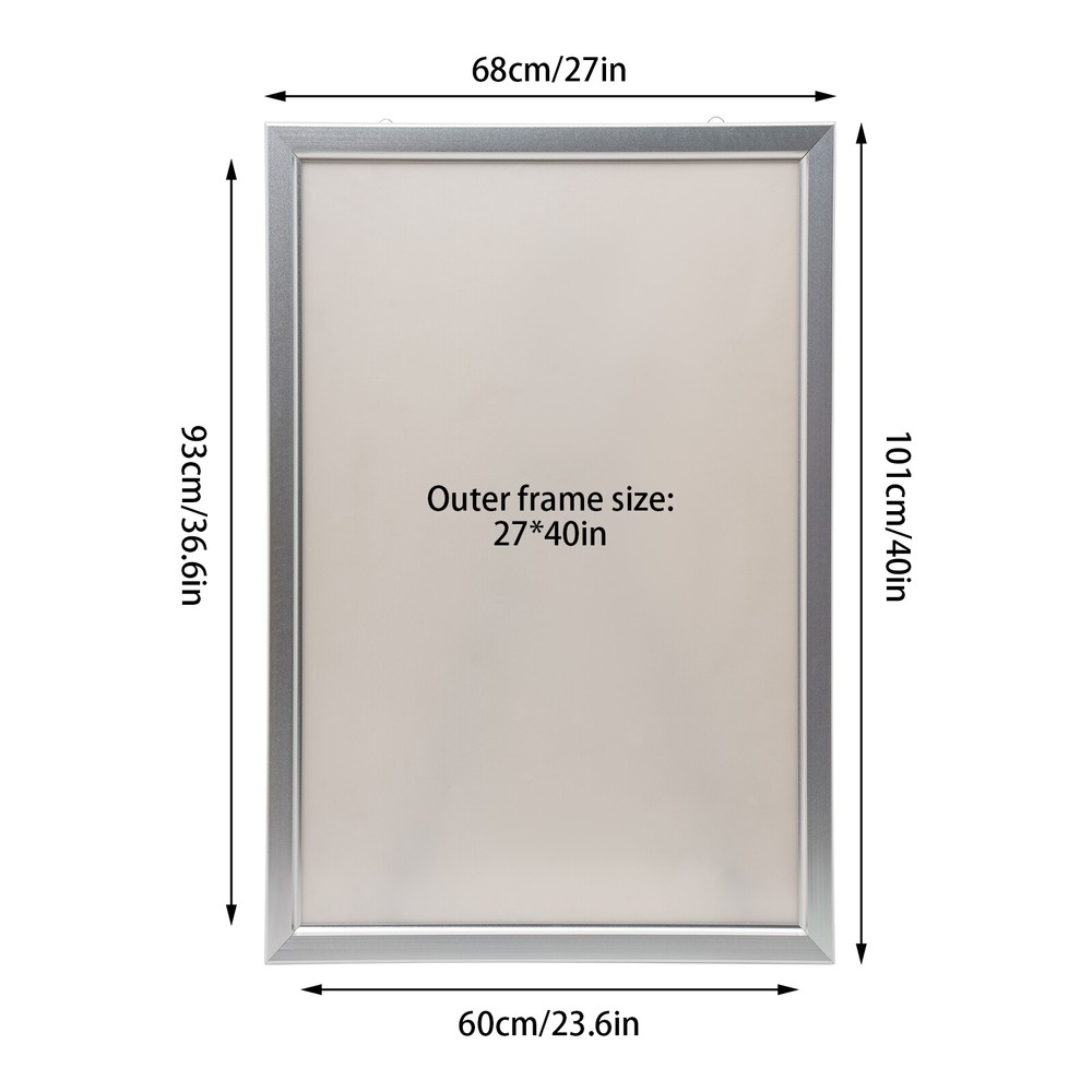 Dourable 27x40" Movie Poster Art Picture Frame LED Light Box Advertising Display LED Poster Movie Frame Backlit Light Box Advertising Sign Display 27"x40'' Description Good advertising is essential to attract more customers. How to make your advertising stand out is a challenge. But with this LED poster frame, this problem is easily solved! It can provide eye-catching but not dazzling lighting effects for your advertisements and posters, making it stand out among a group of advertisements and giving your customers a more intuitive and clear selling point! Key Features Ultra-thin Design: Its thickness is only 1.1 inches , and hanging on the wall will not cause unnecessary trouble due to too much protrusion, and it ensures ornamental value. Excellent Light Source: Using high-quality chips and energy-saving and environmentally friendly 18W LED light source (9000-10000K), this product can generate uniform lighting without shadow and hot spots on the surface of the poster, protecting the eyes and saving costs. In addition, it features fast heat dissipation, low light attenuation, and long service life. Selected Material: Its frame is made of lightweight and durable aluminum alloy, and th e waterproof a crylic panel can prevent the poster from getting wet. The PVC base plate is sturdy and durable, and combined with the oxidation and baking varnish process, it can perform well for a long time. Convenient& Flexible Installation: The two hooks above are easy for you to install. You can use glass glue or screws (both are not included) to fix it, and it also supports vertical or parallel installation to meet your various needs. Flip Design: The flip design allows you to quickly and easily replace signs and posters without the need for tools, and is also easy to assemble and maintain. Simple Appearance: The low-key and minimalist black frame can effectively highlight the content of the poster, making people pay attention to the content you want to promote at a glance. Powerful Assistant: It can help your customers quickly and better understand your selling points, thereby promoting your business. In addition, it can add a unique atmosphere to the bedroom and showcase your elegant attitude toward life to everyone. Protective Packaging: This product comes in bubble wraps, pearl cotton, and clear films that resist common compression and fall to prevent product damage in transit. Details Uniform brightness: The LED lighting brightness is uniform on each side, not dazzling. Extended Power Cord: A 3.93ft long power cord combined with an 11.81 inches connecting wire can reduce installation location restrictions, and you don't have to worry about the distance between the sockets being too far. Round Corners: With fine processes, it has smooth and round corners that can better ensure safety, providing you with a compatible user experience . Application It is very suitable for home theaters, interior decoration, retail stores, elevators, art exhibitions, trade shows, hospitals, libraries, counters, offices, companies, menu boards, jewelry stores, hotels, studios, cinemas, restaurants, hair salons, game rooms, supermarkets, airports, parking lots, and other home and commercial fields. Specification Color: Sliver Material: Acrylic, PVC, Aluminum Alloy Surface Treatment: Oxidation, Baking Paint Power Source: Corded Electric Plug Type: US Standard Light Source Type: LED Shape: Rectangular Efficiency: E Mounting Type: Free Standing Frame Type: Poster Frame Power: 18W Adapter Model: YOUHONG-1201 Input: AC100-240V, 50/60Hz Output: 12V, 1.5A Number of Items: 1 Power Cord Length: 1.2m/3.93ft Connecting Wire Length: 30cm/11.81in Size: 27''x40'' Gross Weight: 10kg/22lbs Net Weight: 9kg/19.8lbs Frame Size: 68*101cm/27*40in Screen Size: 60*93cm/23.6*36.6in Product Thickness: 2.8cm/1.1in Package Size: 73*111*6cm/28*43.7*2.36in Package Included 1*LED Poster Frame 1*Adapter Notes This product is applied to 24in x 33in/ 27in x 40in poster or picture, but the display size will be a litter smaller than it. Please note that this product does not include pictorials, posters, etc. Before using it, you need to tear off the film on the surface to make the poster more clear. Please allow the slight color difference caused by the shooting light and 1-3cm error due to manual measurement, and make sure you do not mind before you order. Payment Delivery details Terms of sales About us Contact us Payment We accept ebay payment 。 Fees such as import duties, taxes are not included in the item price or shipping costs. These charges are the buyer's responsibility. Delivery details Shipping: 2-9 working days to: USA Terms of sales We maintain high standards of excellence and strive for hundred percent customer satisfaction. Feedback is very important to us. We hope that you contact us immediately before you give neutral or negative feedback, so that we can address your concerns. It is impossible to address issues if we do not know about them! About us Your satis faction is our ultimate goal. We work hard to earn your trust and future business. Our certified technicians have tested each item before shipping. The unit comes with 1 year limited warranty on all manufacturing defects. a) If you receive a defective item, you may return it or ask for a discount. Please contact us within 14 days after you receive the package. b) What you returned must be intact and in its original packaging as re? u. Customer is responsible for shipping costs of the returned item. c) We will cover the cost of shipping back t with the shipping rate indicated in the registration page. We will send you a new unit or refund the full payment you paid. Thank you. Contact us Business Hour Business Hour: Monday To Friday: 8:30 AM to 5:00 PM (Beijing China time) Due to time zones, our reply to your questions may not be immediately. But within above working time, we will reply your email within 24 hours. If it's non-workdays, please kindly be patient and wait till Monday. Ple