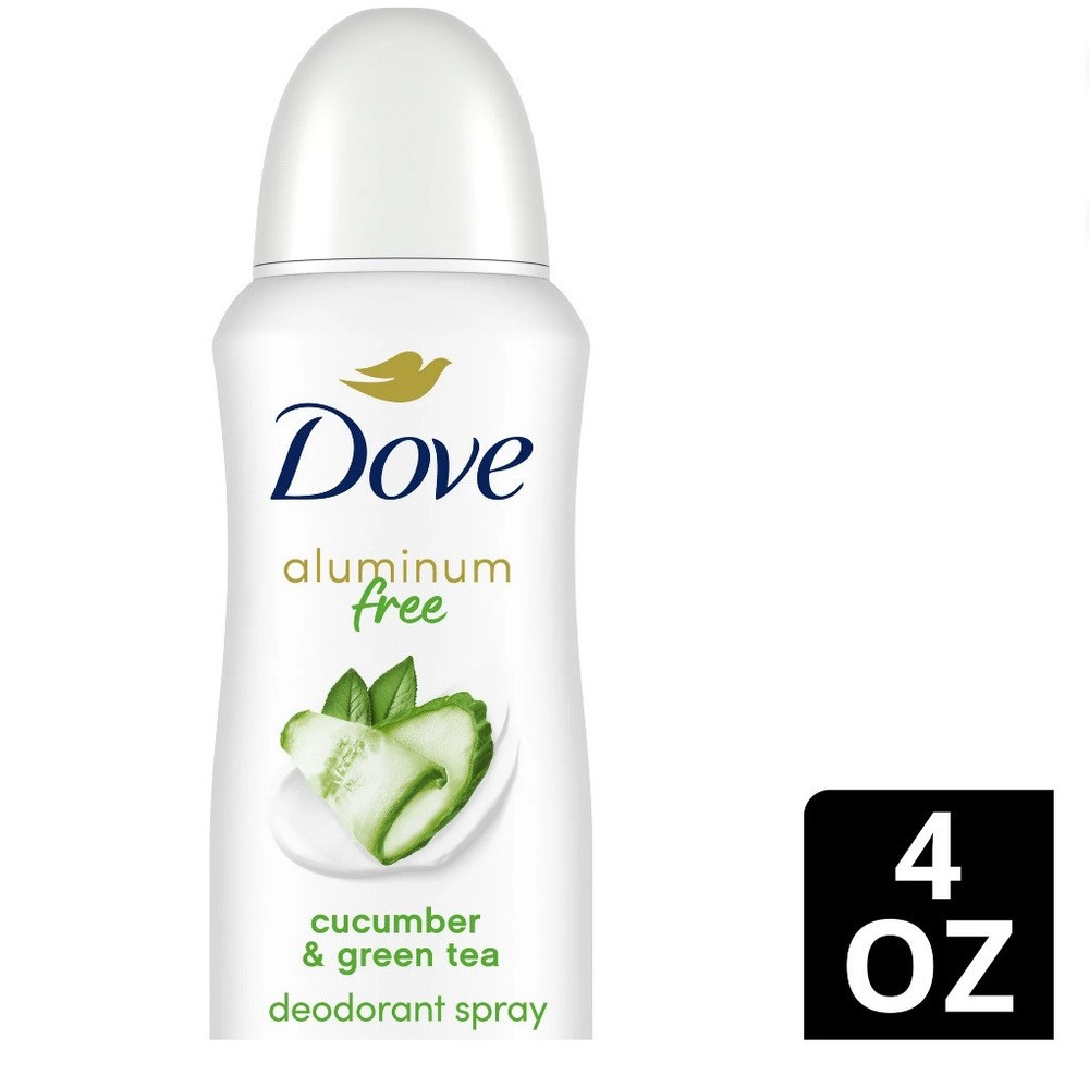 Dove Beauty 0% Aluminum Cucumber & Green Tea 48 Hour Deodorant Spray - 4oz. Dove Deodorant Spray for Women Cucumber & Green Tea Aluminum Free, 4 oz. Your delicate underarm skin deserves the same care you give the rest of your body. Dove 0% Aluminum Deodorant Spray with Cucumber and Green Tea gives long-lasting freshness, gentle underarm care, and superior odor protection day and night. When you spray your deodorant, you want freshness that lasts. This 48-hour deodorant for women protects against odor no matter what the day brings – one spray is enough to keep the worry of odor away. That’s not all – enriched with ¼ moisturizers, this aluminum free deodorant spray also cares for your skin while it protects against odor. Reliable long-lasting freshness will leave you feeling confident and clean – all day long. For adult use. Dove Deodorant Spray for Women Cucumber & Green Tea Aluminum Free, 4 oz EFFECTIVE ODOR PROTECTION: Dove 0% Aluminum Deodorant Spray provides superior 48h odor protection KIND TO SKIN : Dove deodorant spray has a kind-to-skin formula with no aluminum LONG-LASTING FRESHNESS: Aluminum free deodorant formula is infused with a refreshing cucumber and green tea scent CARING FORMULA : Dove Spray deodorant with no aluminum is formulated with ¼ moisturizers for underarm care EASY TO APPLY: Dove 0% Aluminum Deodorant sprays are easy to apply and dry quickly CRUELTY FREE: Globally, Dove deodorant is not tested on animals and is certified cruelty-free by PETA For adult use.