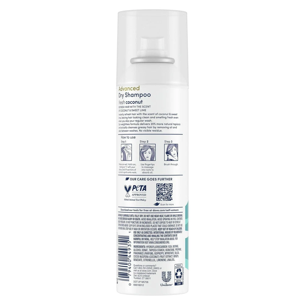 Dove Advanced Dry Shampoo Spray, Fresh Coconut, Absorbs Excess Oil, Refresh Without Water, 5 Ounce (Pack Of 6) Dove Advanced Repairing Dry Shampoo, Fresh Coconut, Need to get ready in a hurry? Pressed for time after a gym session? Whatever the reason, now you can have hair that looks and feels clean without having to wash it using this waterless shampoo spray. Dove Volume Fullness Dry Shampoo Hair Volumizer Spray works with just a few quick sprays and leaves you with hair that is volumized and looks and feels beautiful, healthy and full of body. About this item Dove Advanced Fresh Coconut Dry Shampoo absorbs excess oil to refresh and revive hair between washes, leaving it looking beautiful and soft This dry shampoo features a weightless formula that instantly absorbs oil to rejuvenate hair between washes Dove Advanced Fresh Coconut Dry Shampoo features the light scent of coconut and sweet lime to leave hair smelling fresh and clean Our weightless formula delivers 20% more natural tapioca and actually cleanses greasy hair by removing oil and odor between washes Spritz this waterless dry shampoo at the roots in sections. Massage into roots and brush through hair. For best results, spray this dry shampoo 8-12 inches from hair This dry shampoo spray is the perfect addition to your cruelty-free hair care collection Dry shampoo spray will save you time and ensure you stay confident with the way your hair looks and feels. When you don't have time for a full hair wash with water, Dove volumizing dry shampoo quickly helps to reduce the oily, greasy feel of unwashed hair, leaving it easy to style and manage. Ingredients Isobutane, Propane, SD Alcohol 40-B (Alcohol Denat.), Aluminum Starch Octenylsuccinate, Butane, Fragrance (Parfum), Isopropyl Myristate, Silica, Cocos Nucifera (Coconut) Fruit Extract|Ingredients correct at time of publishing. Always check product packaging.