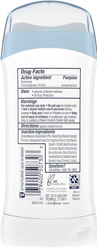 Manufacturer:Unilever Home and Personal Care - North AmericaSize:2.6 Ounce (Pack of 6)Product Dimensions:6.7 x 5.5 x 2.2 inches; 15.6 ouncesIs Discontinued By Manufacturer:NoFormulation:Stickgtin13:711181282009Material Type Free:Alcohol FreeBrand:DoveSpecial Feature:Cruelty FreeDepartment:WomenType:Does not applyItem model number:10079400507300Item Form:SolidBatteries:A batteries required.Scent:CleanUPC:711181282009
