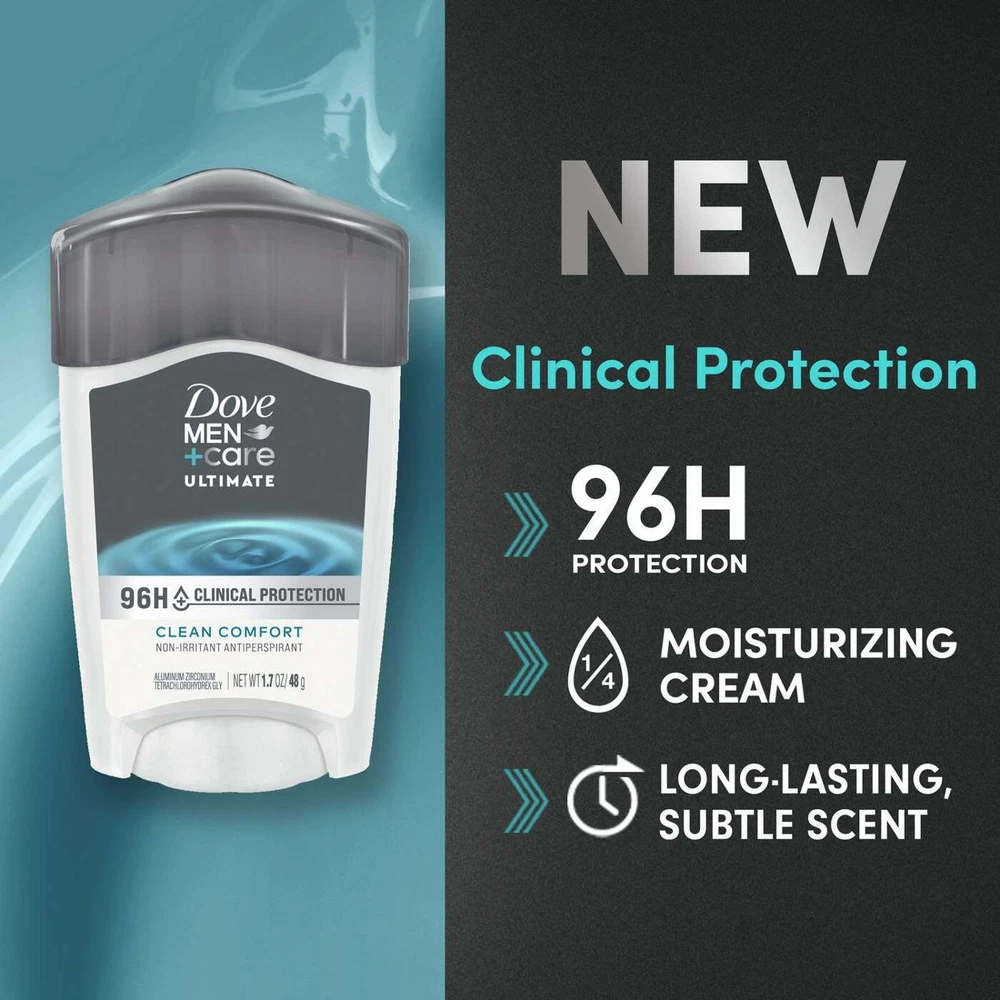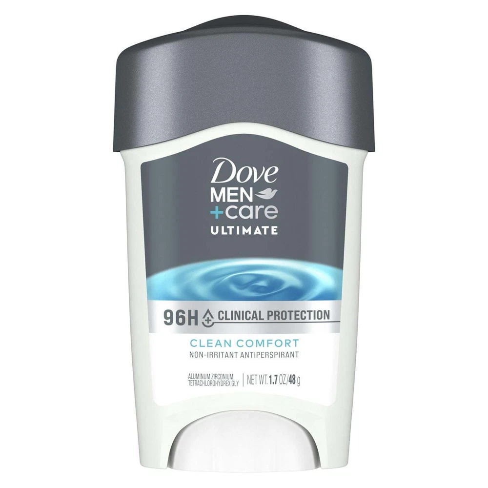 Product Description Dove Men+Care Clinical Protection Antiperspirant & Deodorant Stick, Sweat and Odor Protection, Clean Comfort, 1.7 Ounce (Pack Of 5) Dove Men+Care Clinical Protection Clean Comfort Antiperspirant Stick gives you 96h sweat protection while caring for sensitive skin. This antiperspirant stick is formulated with 1/4 Moisturizing Cream to help retain skin moisture and help protect against irritation for more comfortable underarms. This Clinical Strength antiperspirant features a long-lasting subtle fragrance to keep you feeling fresh and confident all day. Simply apply this clinical strength antiperspirant in an even layer onto each of your underarms to help soothe and protect your underarms from sweat and odor for lasting confidence around the clock. POWERFUL CLINICAL PROTECTION: Dove Men+Care Clinical Protection Clean Comfort Antiperspirant Stick gives you 96h sweat protection while caring for sensitive skin. NON-IRRITANT FORMULA: This Antiperspirant stick is formulated with 1/4 Moisturizing Cream to help retain skin moisture and help protect against irritation for more comfortable underarms. LONG LASTING FRAGRANCE: Dove Men+Care Clinical Protection Clean Comfort Antiperspirant Stick features a long-lasting subtle fragrance to keep you feeling fresh and confident all day. HOW TO USE: Apply this Clinical Strength Antiperspirant Stick on your underarms. CARE FOR THE PLANET: Each Dove Men+Care antiperspirant stick can be recycled. Follow the How2Recycle instructions on the back. Dove Men+Care antiperspirants are PETA-certified Cruelty-Free. CLEAN COMFORT RANGE: Try the full range of Dove Men+Care products, including antiperspirant deodorants, dry spray antiperspirant deodorants, face and body bars, and other hair and skin care products.. Ingredients Active Ingredient: Aluminum Zirconium Tetrachlorohydrex GLY (20.0%);Inactive Ingredients: Cyclopentasiloxane, Dimethicone, Paraffin, Microcrystalline Wax, Fragrance (Parfum), Silica, Helianthus Annuus (Sunflower) Seed Oil, Dimethicone Crosspolmer, BHT.