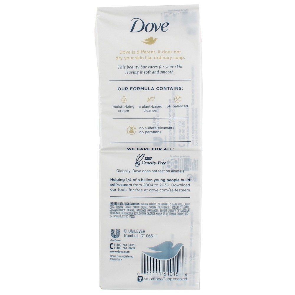 Product Description Dove Pink Beauty Bar combines a gentle cleansing formula with our signature 1/4 moisturizing cream to hydrate and nourish skin, instead of leaving skin feeling dry and tight like an ordinary bar soap might. It's the classic Dove Beauty Bar formula with a delicate pink hue. Dove mild cleansers help skin retain its natural moisture, which helps keep skin hydrated, and Dove Beauty Bar even helps replenish skin-natural nutrients that can be lost during the cleansing process. Use your Beauty Bar as a facial cleanser or as a gentle skin cleanser for your body and hands. For best results, rub between wet hands and massage the smooth, creamy lather over your skin before rinsing thoroughly. The secret to beautiful skin is moisture, and no other bar hydrates skin better than Dove. Formulated with mild cleansers that care for skin as you cleanse, this moisturizing bar helps deliver nourishment and leave your face and body feeling soft and smooth and looking more radiant than ordinary soap does. Our vision is of a world where beauty is a source of confidence, and not anxiety. Our mission is to help the next generation of women develop a positive relationship with the way they look, helping them raise their self-esteem and realize their full potential. LOCK IN MOISTURE: The classic Dove Beauty Bar, with a delicate blush of color, nourishes and pampers skin to give you softer, smoother, more radiant looking skin than ordinary bar soap. RICH HYDRATION: Help maintain your skin's natural moisture barrier and hydration with this beauty bar ideal to use as a facial cleanser and body soap. #1 DERMATOLOGIST RECOMMENDED: Formulated with mild cleansers and moisturizing cream, Dove moisturizing beauty bar leaves skin instantly soft and smooth with lasting nourishment. GENTLE CLEANSING The luxurious lather of this Dove Beauty Bar won't dry skin like an ordinary bar soap. Dove Beauty Bar is also effective at cleansing hands. THOUGHTFULLY MADE: This beauty bar is PETA-certified cruelty-free so you can feel good about switching from ordinary soap to Dove Beauty Bar. CARE AS YOU CLEAN: The cleansing efficacy and skin care you need, all in one product. 1/4 Moisturizing cream With mild cleansers Promotes beautiful skin Ingredients Sodium Lauroyl Isethionate, Stearic Acid, Lauric Acid, Sodium Oleate, Water (Agua), Sodium Isethionate, Sodium Stearate, Cocamidopropyl Betaine, Fragrance (Fragancia), Sodium Laurate, Tetrasodium Etidronate, Tetrasodium EDTA, Sodium Chloride, Red 4 (CI 14700), Red 33 (CI 17200), Titanium Dioxide (CI 77891). Product Description Dove Pink Beauty Bar combines a gentle cleansing formula with our signature 1/4 moisturizing cream to hydrate and nourish skin, instead of leaving skin feeling dry and tight like an ordinary bar soap might. It's the classic Dove Beauty Bar formula with a delicate pink hue. Dove mild cleansers help skin retain its natural moisture, which helps keep skin hydrated, and Dove Beauty Bar even helps replenish skin-natural nutrients that can be lost during the cleansing process. Use your Beauty Bar as a facial cleanser or as a gentle skin cleanser for your body and hands. For best results, rub between wet hands and massage the smooth, creamy lather over your skin before rinsing thoroughly. The secret to beautiful skin is moisture, and no other bar hydrates skin better than Dove. Formulated with mild cleansers that care for skin as you cleanse, this moisturizing bar helps deliver nourishment and leave your face and body feeling soft and smooth and looking more radiant than ordinary soap does. Our vision is of a world where beauty is a source of confidence, and not anxiety. Our mission is to help the next generation of women develop a positive relationship with the way they look, helping them raise their self-esteem and realize their full potential. LOCK IN MOISTURE: The classic Dove Beauty Bar, with a delicate blush of color, nourishes and pampers skin to give you softer, smoother, more radiant looking skin than ordinary bar soap. RICH HYDRATION: Help maintain your skin's natural moisture barrier and hydration with this beauty bar ideal to use as a facial cleanser and body soap. #1 DERMATOLOGIST RECOMMENDED: Formulated with mild cleansers and moisturizing cream, Dove moisturizing beauty bar leaves skin instantly soft and smooth with lasting nourishment. GENTLE CLEANSING The luxurious lather of this Dove Beauty Bar won't dry skin like an ordinary bar soap. Dove Beauty Bar is also effective at cleansing hands. THOUGHTFULLY MADE: This beauty bar is PETA-certified cruelty-free so you can feel good about switching from ordinary soap to Dove Beauty Bar. CARE AS YOU CLEAN: The cleansing efficacy and skin care you need, all in one product. 1/4 Moisturizing cream With mild cleansers Promotes beautiful skin Ingredients Sodium Lauroyl Isethionate, Stearic Acid, Lauric Acid, Sodium Oleate, Water (Agua), Sodium Isethionate, Sodium Stearate, Cocamidopropyl Betaine, Fragrance (Fragancia), Sodium Laurate, Tetrasodium Etidronate, Tetrasodium EDTA, Sodium Chloride, Red 4 (CI 14700), Red 33 (CI 17200), Titanium Dioxide (CI 77891). Warnings CAUTION: AVOID CONTACT WITH EYES. RINSE THOROUGHLY WITH WATER. IF YOU EXPERIENCE DISCOMFORT, PLEASE DISCONTINUE USE. Disclaimer The product descriptions and instructions provided by Vitabox are for informational purposes only and are qualified in their entirety by the information available from manufacturers of the products. You should carefully read all product packaging, and contact the manufacturer with any questions before using a product. While we endeavor to ensure that product descriptions are current, manufacturers sometimes change their products. We are not liable for inaccuracies or misstatements about products. We do not provide medical advice or recommendations. You should not use the information provided by Vitabox for diagnosing or treating a health problem or disease. If you have or suspect that you have a medical problem, imm