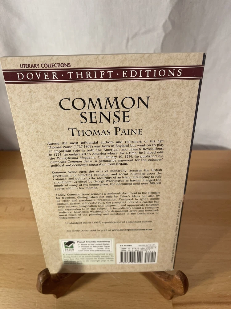 Genre:Political Science, HistoryFormat:Trade PaperbackPublisher:Dover Publications, IncorporatedBook Series:Dover Thrift Editions: Political Science Ser.Author:Thomas PaineNumber of Pages:64 PagesItem Height:0.2 inTopic:United States / Revolutionary Period (1775-1800), History & Theory, American Government / General, Colonialism & Post-ColonialismItem Weight:1.8 OzPublication Year:1997ISBN:9780486296029Item Width:5.1 ingtin13:9780486296029Language:EnglishItem Length:8.3 inBook Title:Common Sense