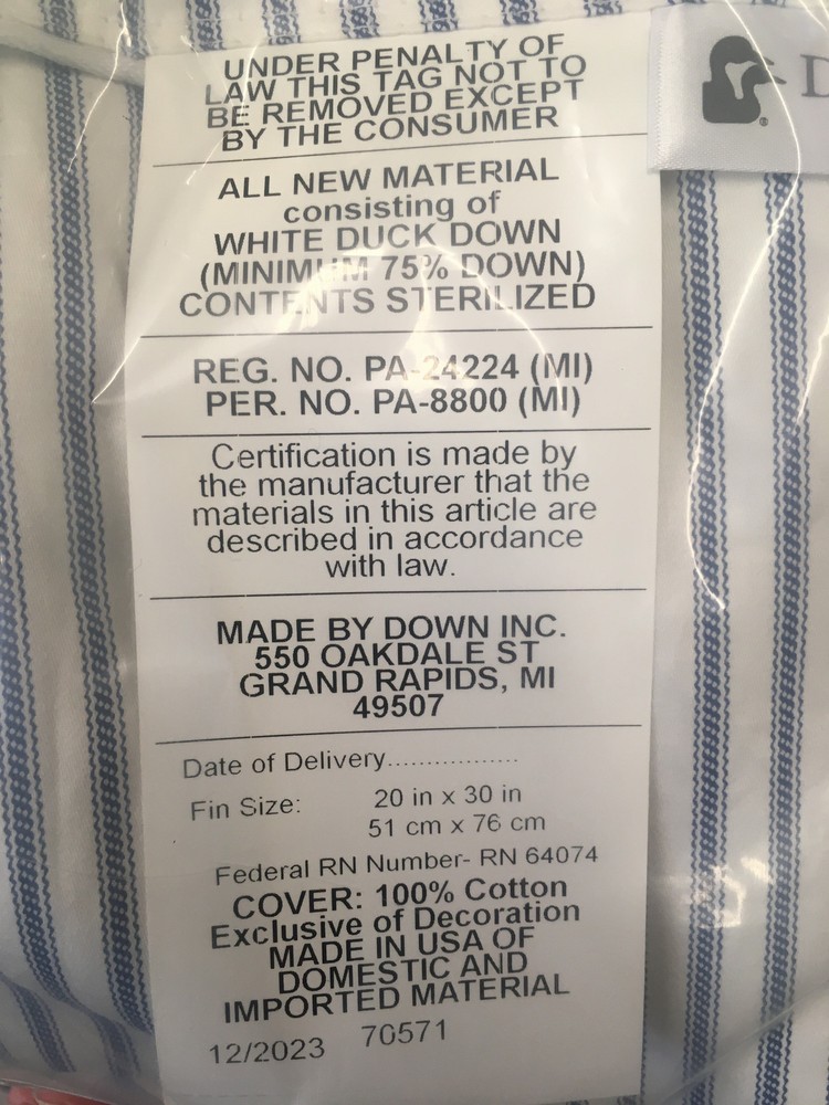 Pioneer folks didn't have lots of luxuries, but many did enjoy the simple pleasure of sleeping on a good down pillow. Now you can indulge in the "everyday extravagance" of premium down bed pillows. So incredibly fluffy and inviting, they might make you want to drop everything and give them a try! 30"L x 20"W (18" depth), 1-1/2 lb. 230 thread count. 100% Cambric cotton shell. Generously filled with premium snow white down (minimum 75% down). White down is washed to meticulous standards. Soft, clean and completely odorless. Traditional blue-striped 100% cotton ticking cover (not removable) has double-stitched edges with cotton cording. Spot clean with mild soap or detergent. Assembled in the USA with imported materials. Visit Our Store Contact Us Premium Down Pillow - Queen Size Pioneer folks didn't have lots of luxuries, but many did enjoy the simple pleasure of sleeping on a good down pillow. Now you can indulge in the "everyday extravagance" of premium down bed pillows. So incredibly fluffy and inviting, they might make you want to drop everything and give them a try! 30"L x 20"W (18" depth), 1-1/2 lb 230 thread count 100% Cambric cotton shell Generously filled with premium snow white down (minimum 75% down) White down is washed to meticulous standards Soft, clean and completely odorless Traditional blue-striped 100% cotton ticking cover (not removable) has double-stitched edges with cotton cording Spot clean with mild soap or detergent Assembled in the USA with imported materials