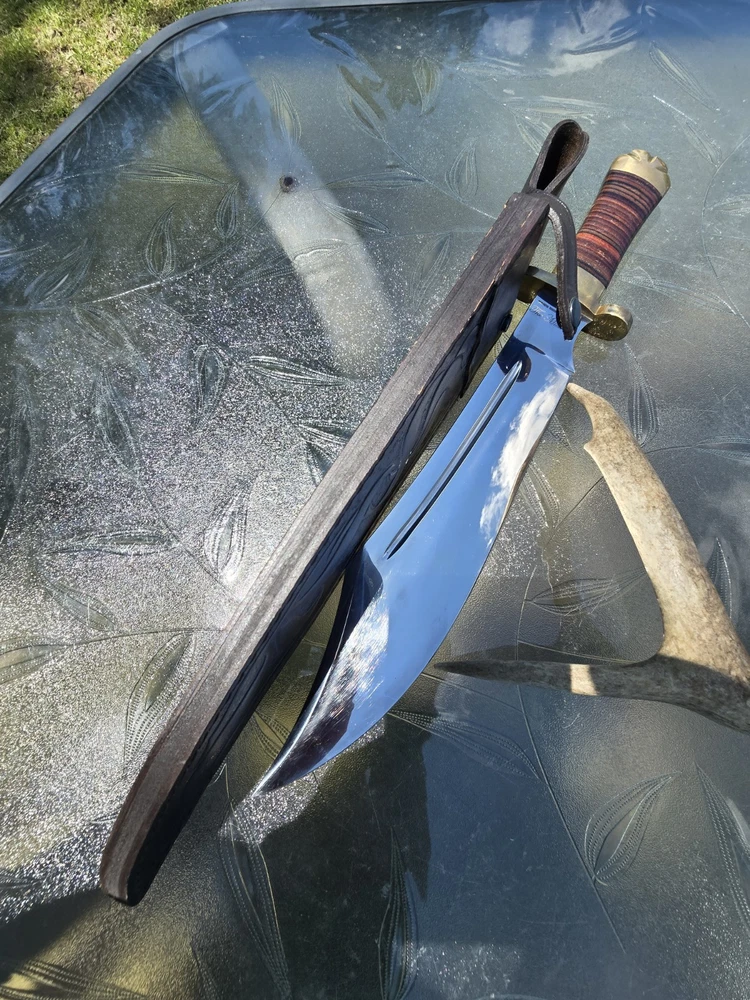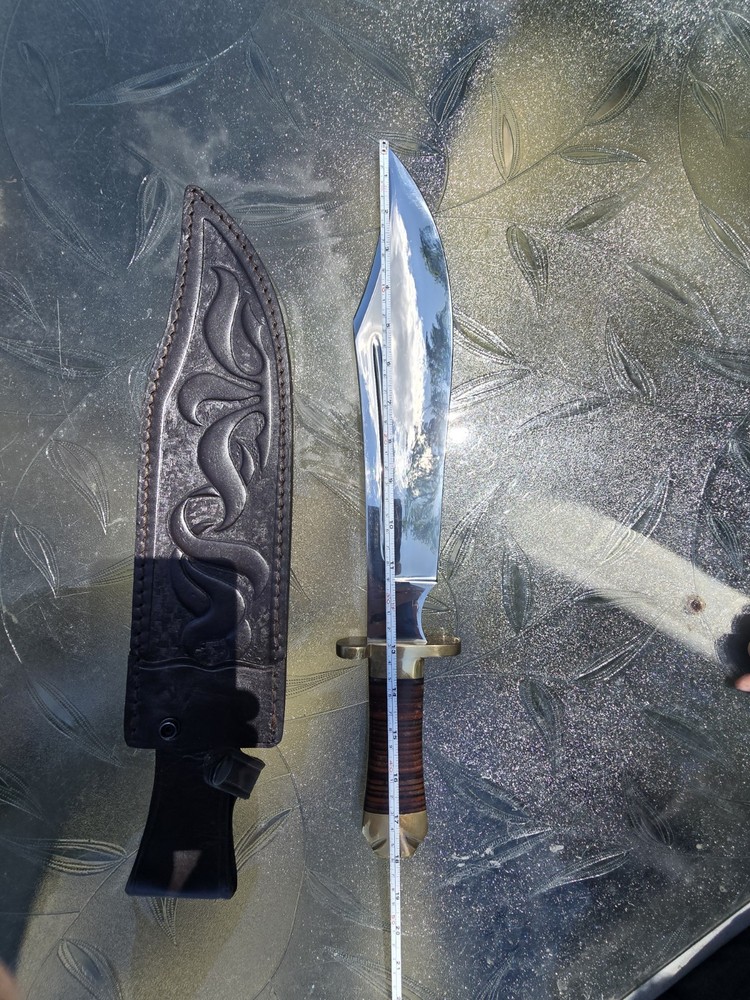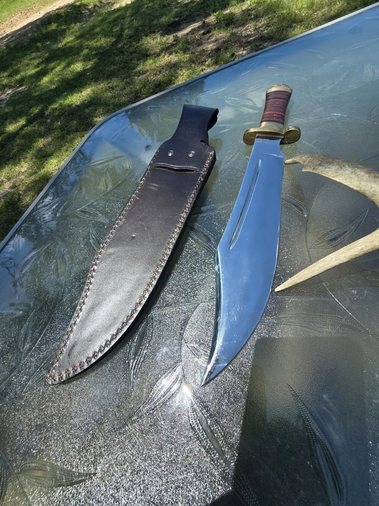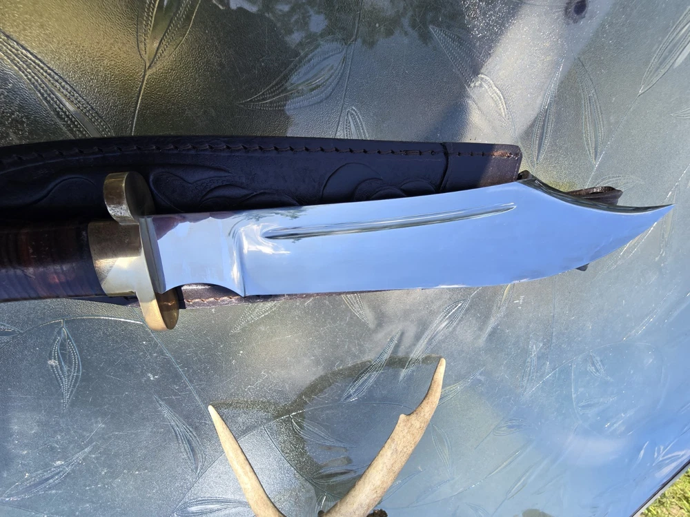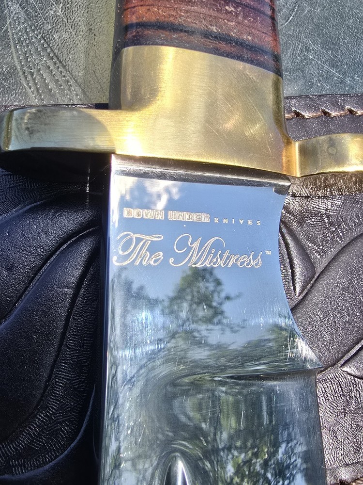 THE MISTRESS, A Very large Bowie made by Down Under Knives. Listed as used because of handling marks but looks unsharpened and I don't believe it has done any cutting or chopping. Cutting edge of blade is 11 1/4 inches, 18 inches overall. Very nice tooled leather sheath. Stacked leather handle. There is slight tarnish on the brass finger guard. Please see photos for condition as part of the description. No international shipping.