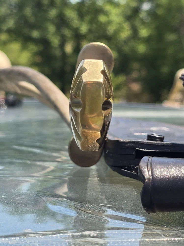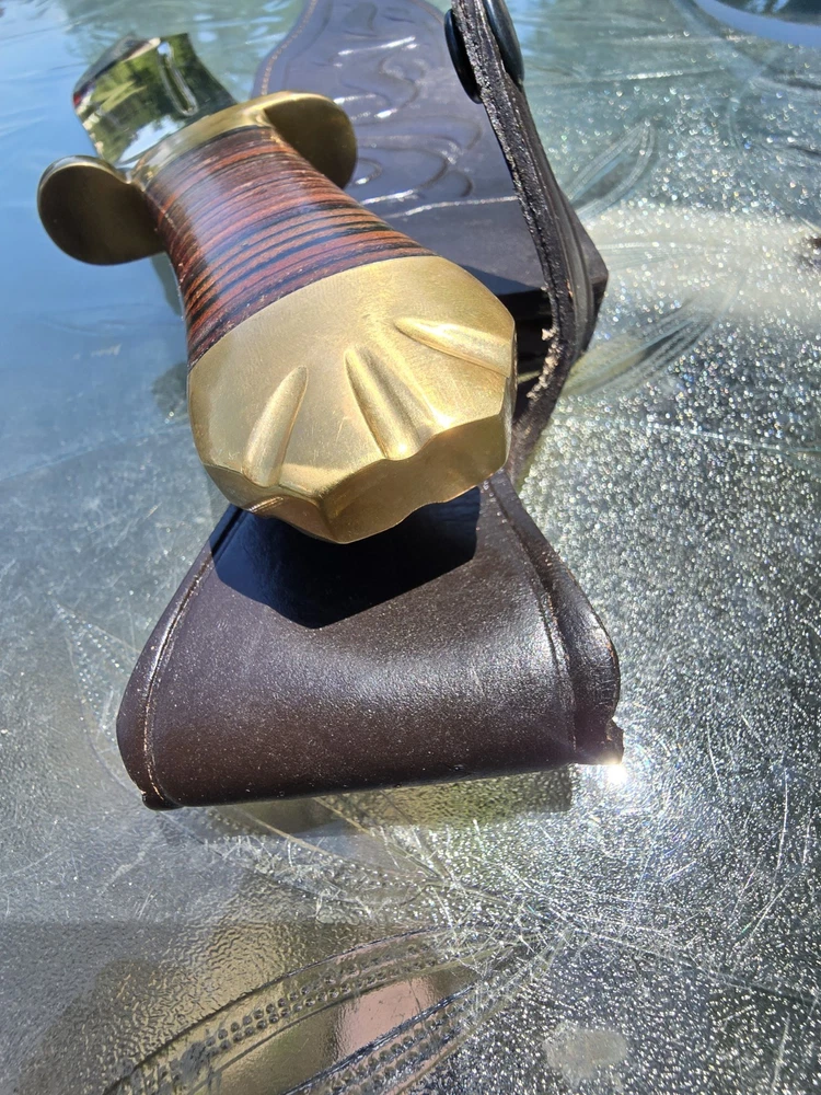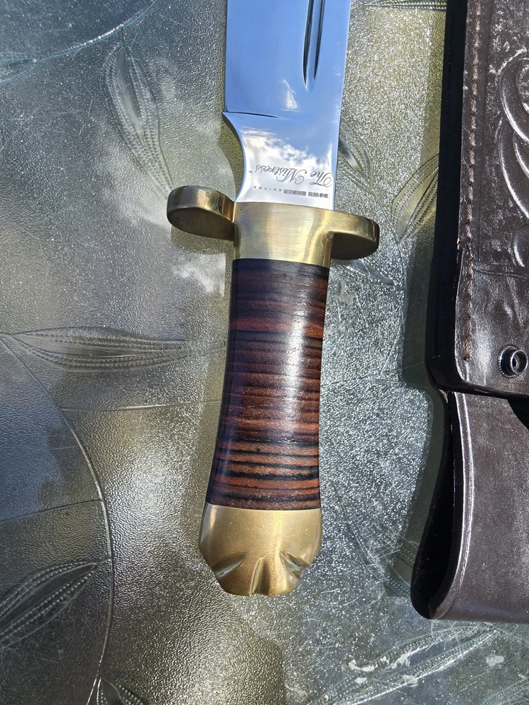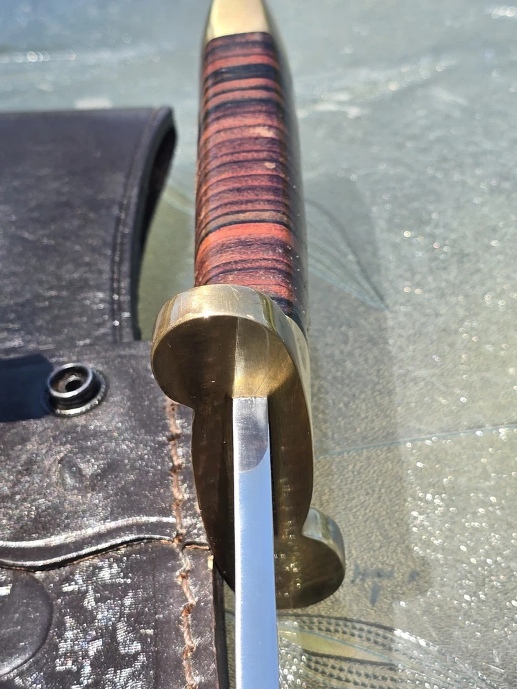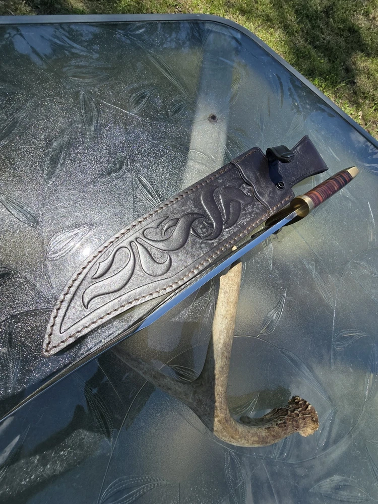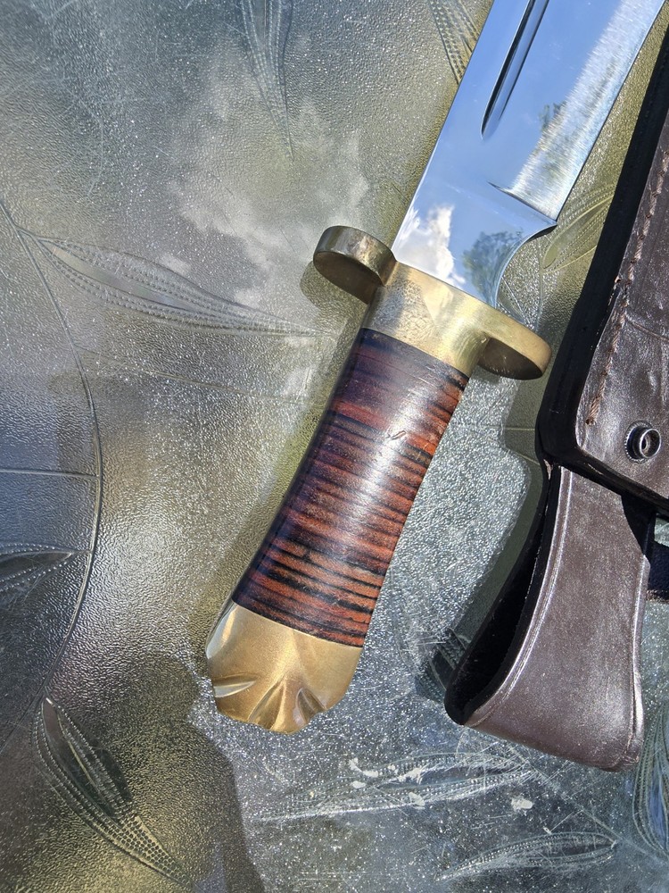 THE MISTRESS, A Very large Bowie made by Down Under Knives. Listed as used because of handling marks but looks unsharpened and I don't believe it has done any cutting or chopping. Cutting edge of blade is 11 1/4 inches, 18 inches overall. Very nice tooled leather sheath. Stacked leather handle. There is slight tarnish on the brass finger guard. Please see photos for condition as part of the description. No international shipping.