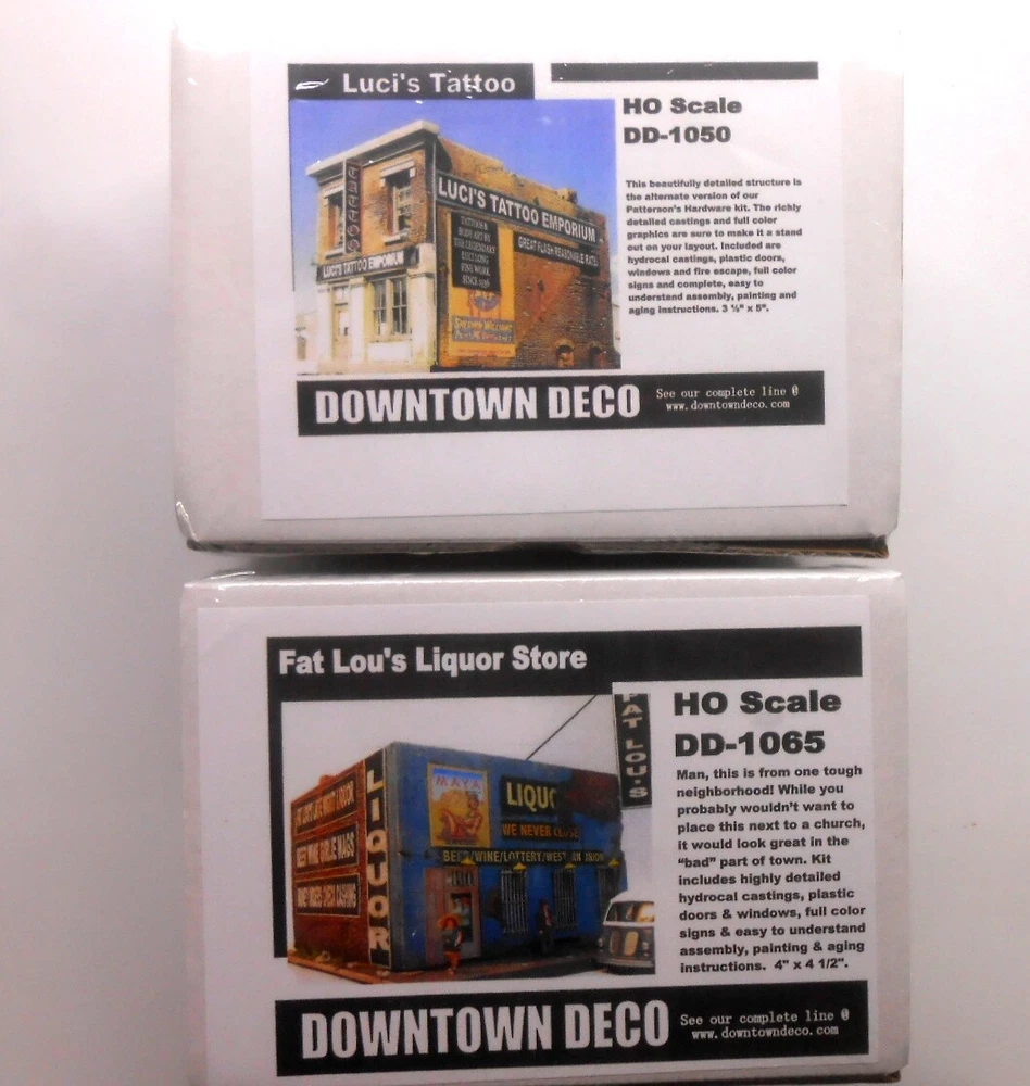 Special priced 2 building kit set + Free Extra Bonus of your choice. 3 great kits, one low price! You get: Fat Lou's Liquor ($35.00 suggested retail) + Luci's Tattoos ($45.00 suggested retail) + a 3rd Bonus/kit of your choice at no extra charge! Simply buy the listing, then when you pay, tell us which 1 of the follow bonus items that you'd like us to send along at no extra charge; A. The First Timer Bar ($30 suggested retail) B. 60 piece unpainted detail set ($25 suggested retail) C. Full set of deteriorated sidewalks ($25 suggested retail) or D. Kitty Korner Bar ($40 suggested retail) Save $20 off retail + get the extra bonus! The best kits you can buy for 3 reasons!! One. Attention to detail & realism. All of the original pattern work is hand carved by an artisan for maximum realism. This allows Downtown Deco kits to include details you'll never find in other kits. Missing and chipped bricks, "ghost' staircases and walls, crumbling stucco and cracked and weathered concrete. If you can find it in real life you'll see it in a Downtown Deco kit! Two. Ease of construction. We try & keep the kits simple so you can get to the fun part (painting & weathering the buildings) in about 30 minutes. Our instructions are second to none, with complete, easy to understand instructions that walk you through each and every step along the way, from basic assembly to painting & weathering the model. Three. Customer service. Got a question about weathering your model? Give us a call. End up with a broken part somehow? We'll replace the parts for free. Paint your first hydrocal kit & you're unhappy with the way it came out? Drop us an email & we'll send you a second set of castings so that you can try again. Why do we do this? Because we want you to have fun with our kits and to be happy with your finished results. If you need anything at all touch base with us & we'll help you out. Our customer service is second to none. 100% positive feedback! If you want your layout to stand out & are sick of seeing the same handful of buildings on every HO Scale layout you see these kits are the ones for you!! Take a good look at the detail & be honest with yourself, wouldn't these look better on your layout than the run of the mill plastic kits everyone else has? The kits feature hydrocal castings chock full of the funky detail we're known for, full color signs, plastic doors & windows & complete, easy to understand instructions.