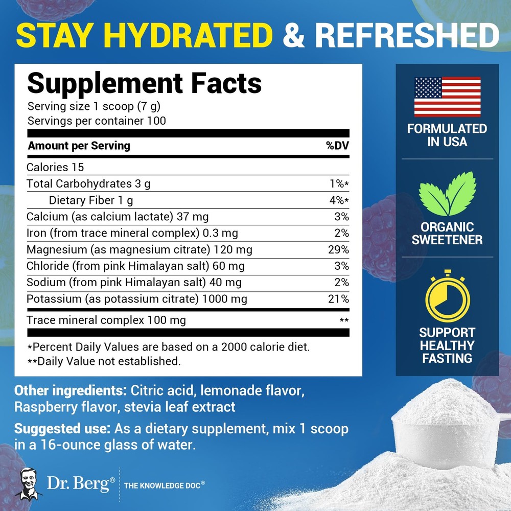 Dr. Berg Zero Sugar Hydration Keto Electrolyte Powder - Enhanced w/ 1000 mg of Potassium & Real Pink Himalayan Salt (NOT Table Salt) - Raspberry & Lemon Flavor Hydration Drink Supplement, 100 Servings ๐๐๐๐๐ง๐ฅ๐ข๐๐ฌ๐ง๐๐ฆ ๐ฃ๐ข๐ช๐๐๐ฅ ๐ก๐ข ๐ฆ๐จ๐๐๐ฅ - Each serving is loaded with 1,000 mg of potassium as opposed to only 250 mg other brands offer. Additionally, this electrolytes powder offers a very unique blend of Calcium, Magnesium, Chloride (from Pink Himalayan Salt - NOT table salt other brands offer) and an amazing Trace Mineral Complex. This refreshing and delicious Raspberry and Lemon flavor includes 100 servings. ๐ ๐๐ซ๐๐ก๐ ๐๐ก๐ฆ๐ง๐ฅ๐จ๐๐ง๐๐ข๐ก๐ฆ - Add one scoop to 16 oz of water. Shake or stir well. Allow 5โ10 minutes for full dissolution, as no dissolving agents are used. ๐๐ก๐๐ฅ๐๐๐๐๐๐ ๐๐ก๐๐ฅ๐๐๐๐๐ก๐ง๐ฆ - We're sorry to say it, but if youโre looking for cheap, youโre in the wrong place. We search far and wide, domestic and international, to provide high-quality ingredients for which your body will thank you. Unfortunately, getting the best ingredients from domestic and international farms can come at a higher-than-normal cost. If quality, satisfaction, and results are essential to you, youโre in the right place! ๐ช๐๐ฌ ๐ช๐โ๐ฅ๐ ๐๐๐๐๐๐ฅ๐๐ก๐ง - Also known as The Knowledge Doc, Dr. Berg has spent most of his life researching and providing natural solutions to everyday health problems. This extensive research and thousands of hours working with patients are what sets us apart from other brands, as it has allowed us to create proprietary blends you canโt get anywhere else. ๐ฏ๐ฌ-๐๐๐ฌ ๐๐๐ฎ๐ฟ๐ฎ๐ป๐๐ฒ๐ฒ - If for any reason you're not happy with the results you experience within the first 30 days, we're happy to give you a full refund! Send us a message, and the refund will be processed as long as it's requested within 30 days of purchase. Shipping We offer FREE shipping on all orders! We ship within Three business days of payment, usually sooner. We use a selection of shipping services such as UPS, FedEx, USPS etc. We only ship to the lower 48 states, no APO/FPO addresses or PO Boxes allowed. Local pickups and combined shipping options are not provided at this time. Return You can return a product for up to 30 days from the date you purchased it. Any product you return must be in the same condition you received it and in the original packaging. Please keep the receipt. Payment We accept payment by any of the following methods: PayPal Please pay as soon as possible after winning an auction, as that will allow us to post your item to you sooner! Feedback Customer satisfaction is very important to us. If you have any problem with your order, please contact us and we will do our best to make you satisfied. Contact Us If you have any queries, please contact us via ebay. We usually respond within 24 hours on weekdays. Please visit our eBay store to check out other items for sale! Thank you for shopping at our store.