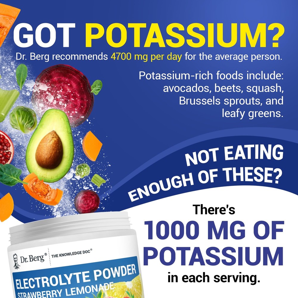 ๐—˜๐—Ÿ๐—˜๐—–๐—ง๐—ฅ๐—ข๐—Ÿ๐—ฌ๐—ง๐—˜๐—ฆ ๐—ฃ๐—ข๐—ช๐——๐—˜๐—ฅ ๐—ก๐—ข ๐—ฆ๐—จ๐—š๐—”๐—ฅ - Each serving is loaded with 1,000 mg of potassium as opposed to only 250 mg other brands offer. Additionally, this electrolytes powder offers a very unique blend of Calcium, Magnesium, Chloride (from Pink Himalayan Salt - NOT table salt other brands offer) and an amazing Trace Mineral Complex. This refreshing and delicious Strawberry Lemonade flavor includes 50 servings. ๐—จ๐—ฆ๐—” ๐—š๐— ๐—ฃ ๐—–๐—˜๐—ฅ๐—ง๐—œ๐—™๐—œ๐—˜๐—— ๐— ๐—”๐—ก๐—จ๐—™๐—”๐—–๐—ง๐—จ๐—ฅ๐—œ๐—ก๐—š - Our state-of-the-art manufacturing facilities are located in the US and are staffed with highly trained individuals who formulate superior products. Being certified under US laws and regulations (GMP Certified), these facilities are uncompromising when it comes to cleanliness and quality control. ๐—œ๐—ก๐—–๐—ฅ๐—˜๐——๐—œ๐—•๐—Ÿ๐—˜ ๐—œ๐—ก๐—š๐—ฅ๐—˜๐——๐—œ๐—˜๐—ก๐—ง๐—ฆ - We're sorry to say it, but if youโ€™re looking for cheap, youโ€™re in the wrong place. We search far and wide, domestic and international, to provide high-quality ingredients for which your body will thank you. Unfortunately, getting the best ingredients from domestic and international farms can come at a higher-than-normal cost. If quality, satisfaction, and results are essential to you, youโ€™re in the right place! ๐—ช๐—›๐—ฌ ๐—ช๐—˜โ€™๐—ฅ๐—˜ ๐——๐—œ๐—™๐—™๐—˜๐—ฅ๐—˜๐—ก๐—ง - Also known as The Knowledge Doc, Dr. Berg has spent most of his life researching and providing natural solutions to everyday health problems. This extensive research and thousands of hours working with patients are what sets us apart from other brands, as it has allowed us to create proprietary blends you canโ€™t get anywhere else. ๐Ÿฏ๐Ÿฌ-๐——๐—”๐—ฌ ๐—š๐˜‚๐—ฎ๐—ฟ๐—ฎ๐—ป๐˜๐—ฒ๐—ฒ - If for any reason you're not happy with the results you experience within the first 30 days, we're happy to give you a full refund! Send us a message, and the refund will be processed as long as it's requested within 30 days of purchase.