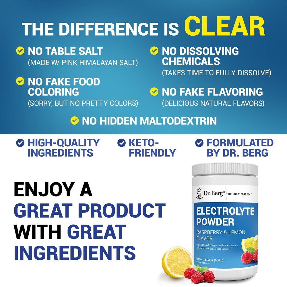 Dr. Berg Zero Sugar Hydration Keto Electrolyte Powder - Enhanced w/ 1000 mg of Potassium & Real Pink Himalayan Salt (NOT Table Salt) - Raspberry & Lemon Flavor Hydration Drink Supplement, 100 Servings Product Details Flavor Name: Raspberry & Lemon - 100 Servings Brand: Dr. Berg Nutritionals MPN: EP-RL-REG25 UPC: 672975261184 EAN: 0672975261184 Brand: Dr. Berg Nutritionals Flavor: Raspberry & Lemon - 100 Servings Primary Supplement Type: Potassium Unit Count: 23.28 Ounce Item Form: Powder Item Weight: 1.5 Pounds Diet Type: Keto Product Benefits: Support Muscle Health, Energy Management Age Range (Description): Adult Package Information: Canister Package Dimensions : 5.79 x 3.74 x 3.58 inches; 1.52 Pounds Item model number : EP-RL-REG25 Date First Available : September 9, 2020 Manufacturer : The Health & Wellness Inc. Best Sellers Rank: #744 in Health & Household (See Top 100 in Health & Household) #2 in Sports Nutrition Endurance & Energy Powders #2 in Sports Nutrition Endurance & Energy Powders Customer Reviews: 4.3 4.3 out of 5 stars 26,412 ratings ELECTROLYTES POWDER NO SUGAR - Each serving is loaded with 1,000 mg of potassium as opposed to only 250 mg other brands offer. Additionally, this electrolytes powder offers a very unique blend of Calcium, Magnesium, Chloride (from Pink Himalayan Salt - NOT table salt other brands offer) and an amazing Trace Mineral Complex. This refreshing and delicious Raspberry and Lemon flavor includes 100 servings. MIXING INSTRUCTIONS - Add one scoop to 16 oz of water. Shake or stir well. Allow 510 minutes for full dissolution, as no dissolving agents are used. INCREDIBLE INGREDIENTS - We're sorry to say it, but if youre looking for cheap, youre in the wrong place. We search far and wide, domestic and international, to provide high-quality ingredients for which your body will thank you. Unfortunately, getting the best ingredients from domestic and international farms can come at a higher-than-normal cost. If quality, satisfaction, and results are essential to you, youre in the right place! WHY WERE DIFFERENT - Also known as The Knowledge Doc, Dr. Berg has spent most of his life researching and providing natural solutions to everyday health problems. This extensive research and thousands of hours working with patients are what sets us apart from other brands, as it has allowed us to create proprietary blends you cant get anywhere else. 30-DAY Guarantee - If for any reason you're not happy with the results you experience within the first 30 days, we're happy to give you a full refund! Send us a message, and the refund will be processed as long as it's requested within 30 days of purchase.