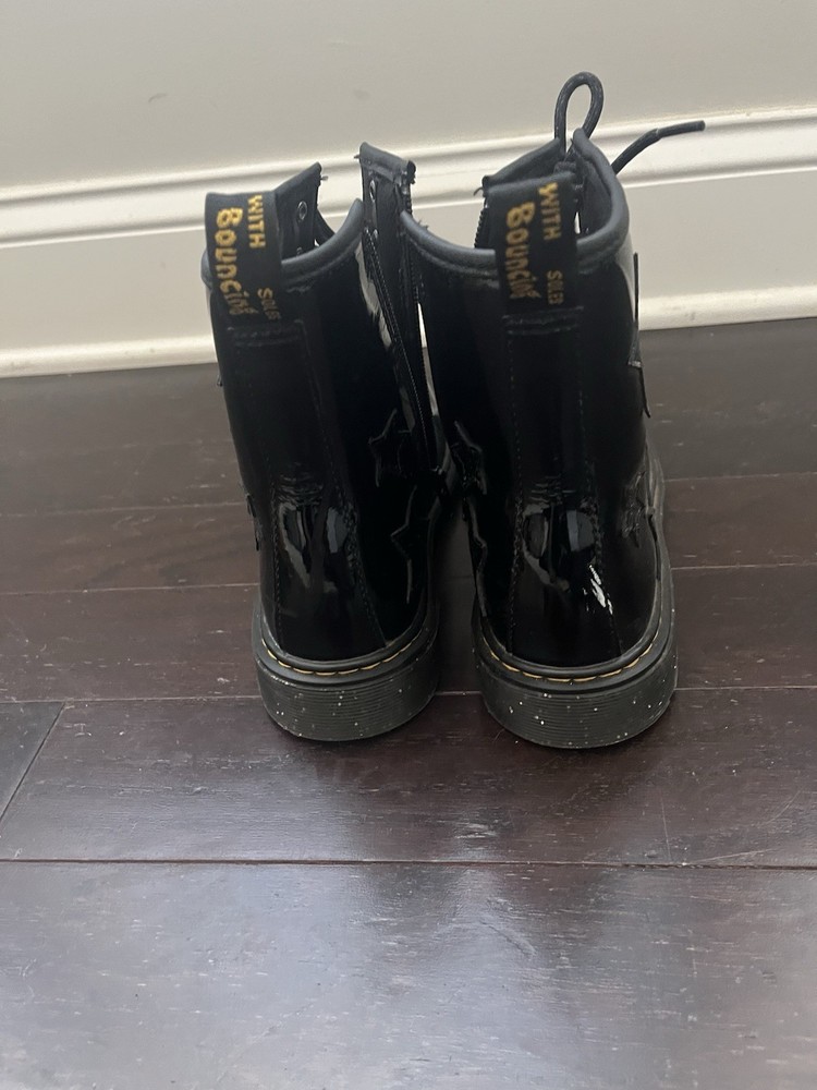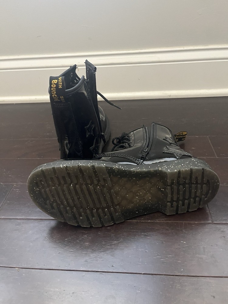 Step out in bold style with these classic Dr. Martens 1460 boots featuring a glossy black patent leather finish and fun glittery star accents. Perfect for kids and teens who love to make a statement, these boots combine signature Docs durability with a playful twist. • Size: Youth 6M • Color: Black Patent with Glitter Star Details • Features: • Iconic yellow stitching and pull tabs • Lace-up front with side zipper for easy on/off • Durable AirWair cushioned sole for comfort and bounce • Glossy finish adds standout shine Pre-owned and in great condition with light signs of wear. Perfect for everyday wear or dressing up with an edgy flair!